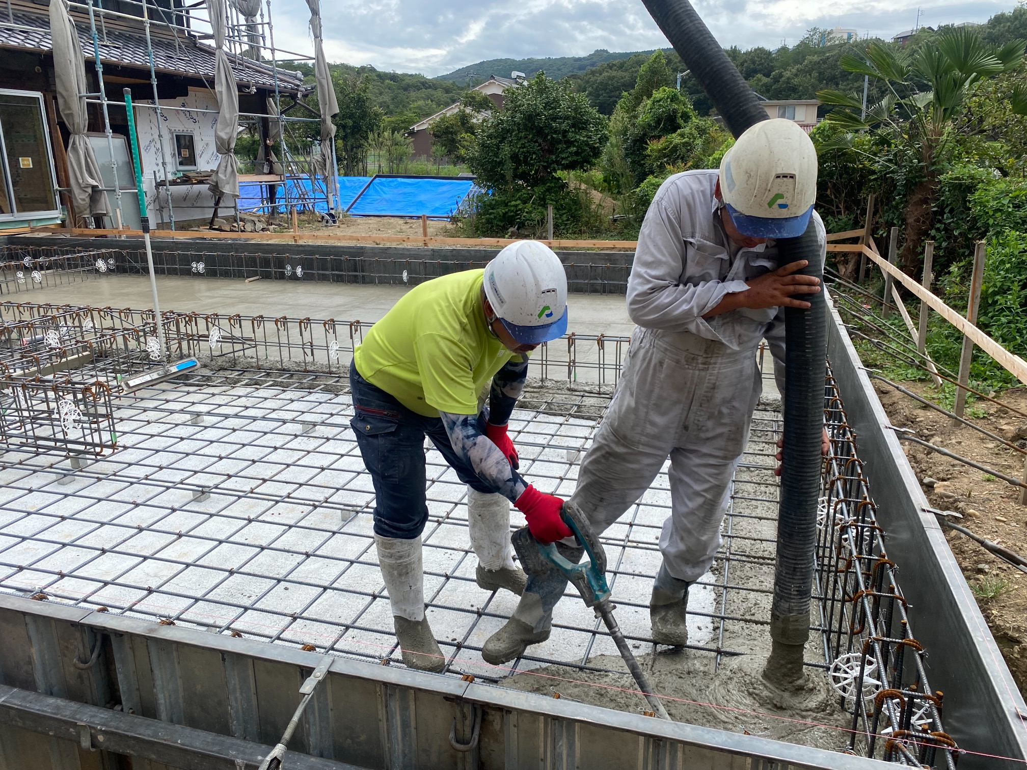 基礎底盤のコンクリートを打設している様子です。コンクリートをポンプ車から打ち込み、バイブレーターで締め固めていきます。コンクリート内部の気泡を取り除き、コンクリートを隙間なく行き渡らせます。
