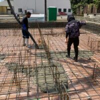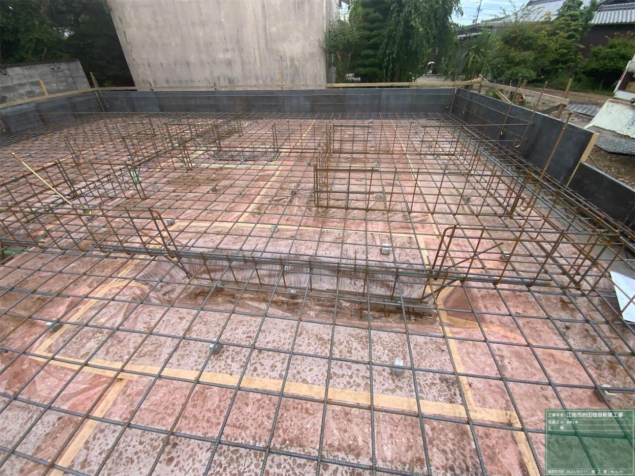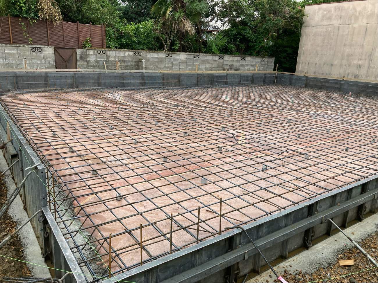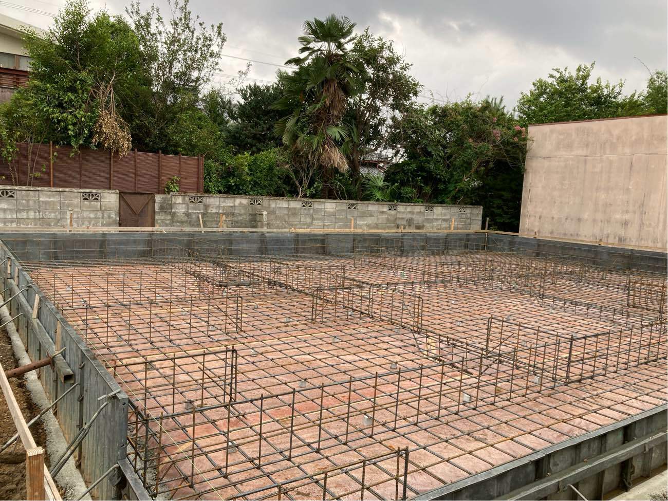 鉄筋を組んでいきます。許容応力度計算によって、配筋の径やピッチが決まります。計算することによって、心配だから頑丈に作っておこうという事をする事なく、経済設計👍物価高と円安の関係で資材高騰時代なので、強度がきちんと確保されている事がわかった上で、材料もお値打ちに済むという事は有難いです。
