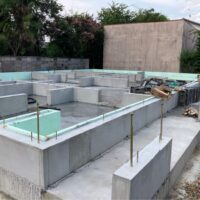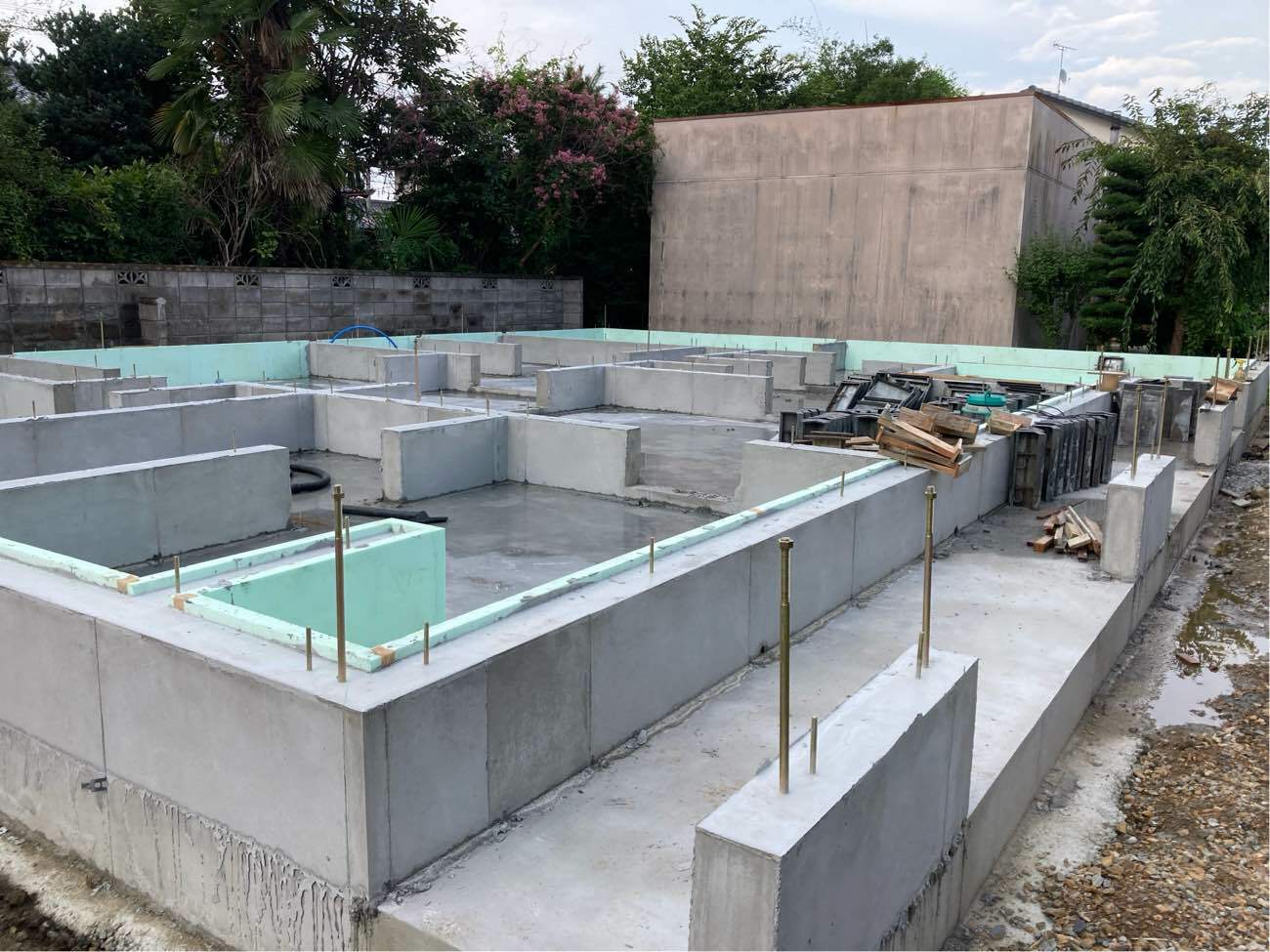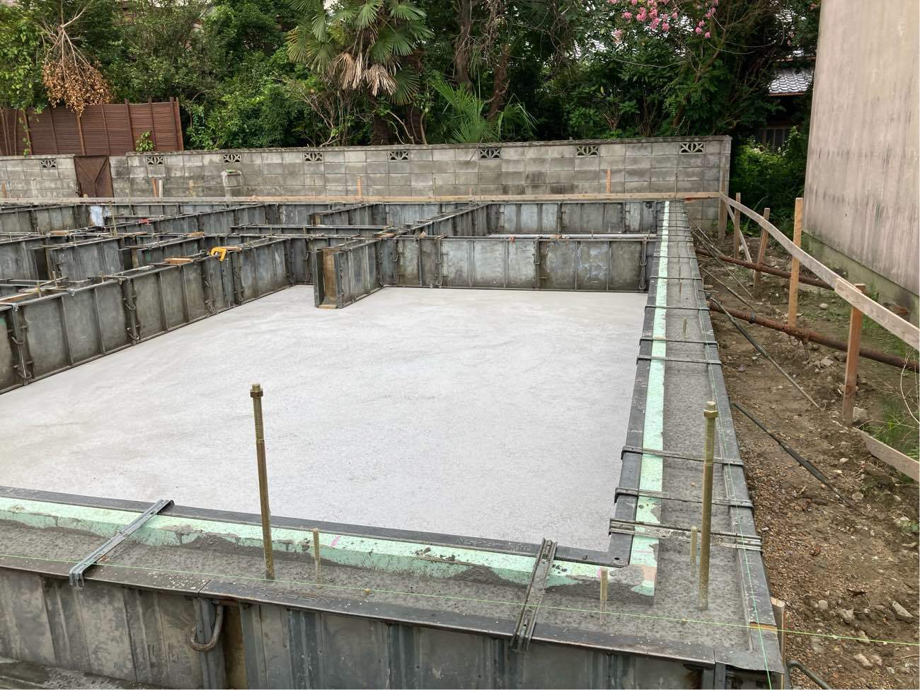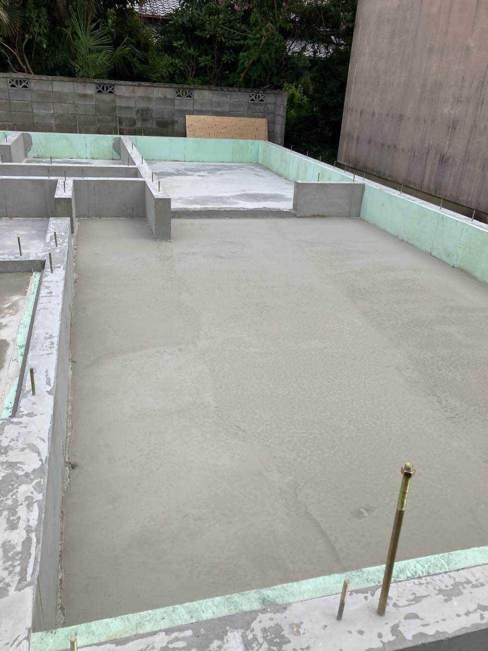 立ち上がり部分は、20日に打設され、型枠の取り外しも終えました。このところの標準仕様、基礎スカート断熱なので、立ち上がりの型枠組立て時に、内側に断熱材を設置し打設を行っています。