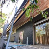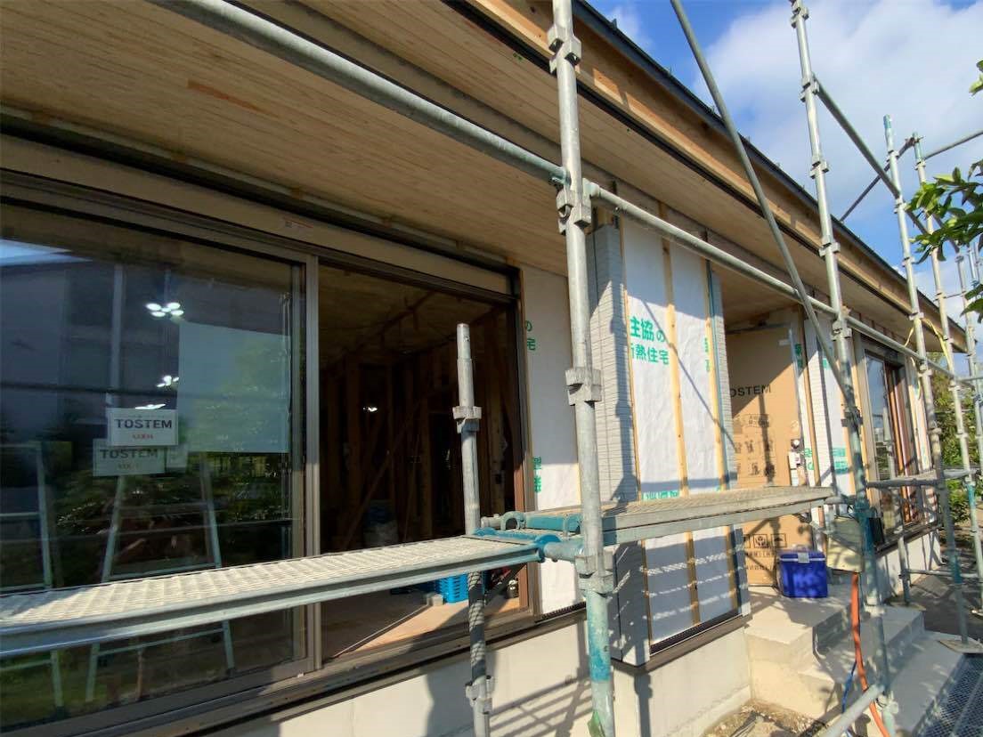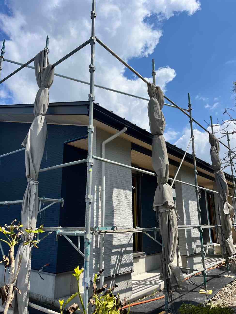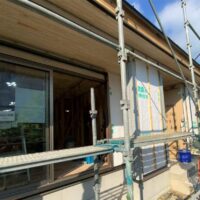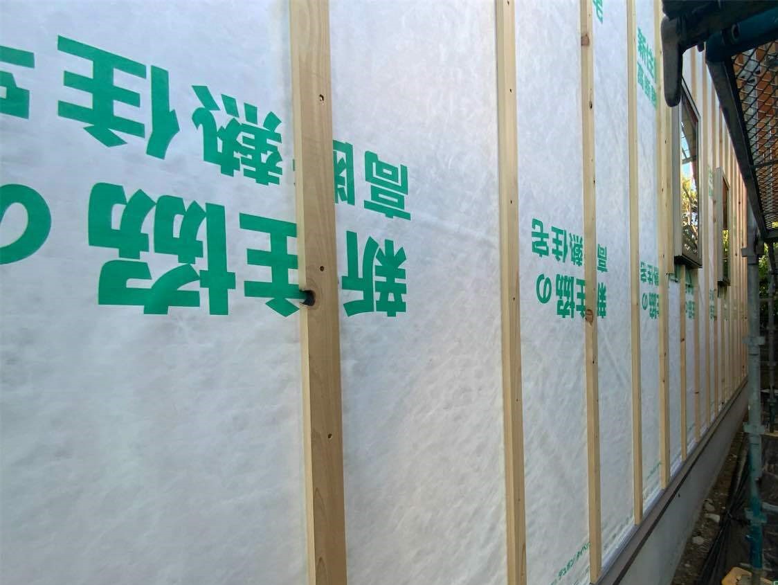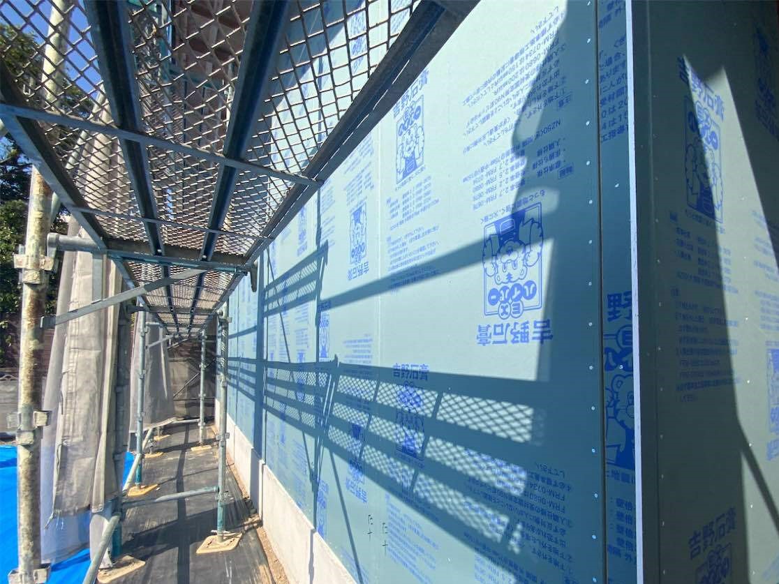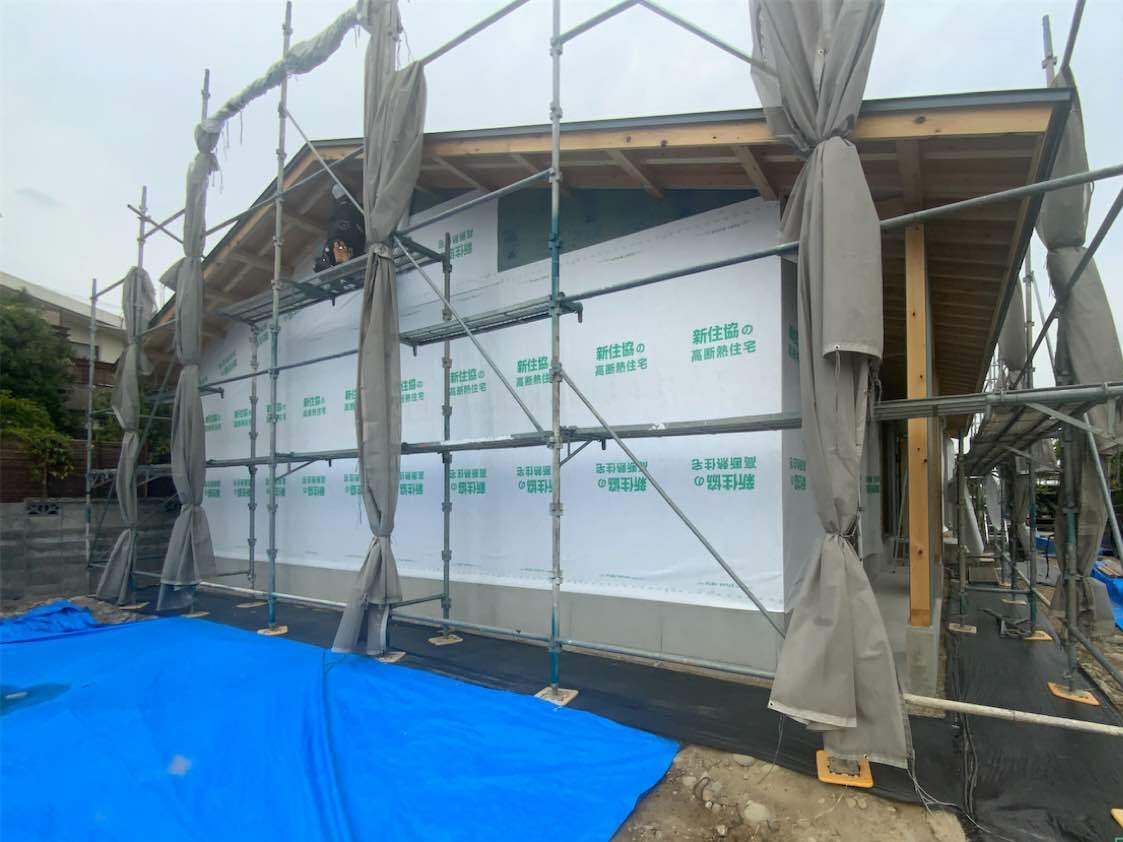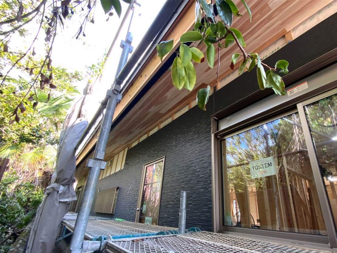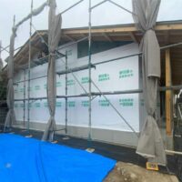 外部の様子です。s井棟梁、軒裏の羽目板は、よく見える南の玄関側に良い目の板を張り、北側のあまり目に付かない部分に色むらのある板を張っています👍流石!!透湿防水シートの上には、通気胴縁を取り付けて、外壁に通気層を確保しています。