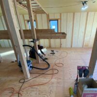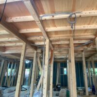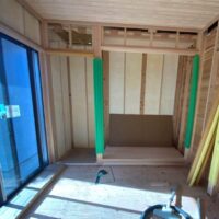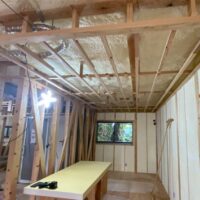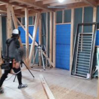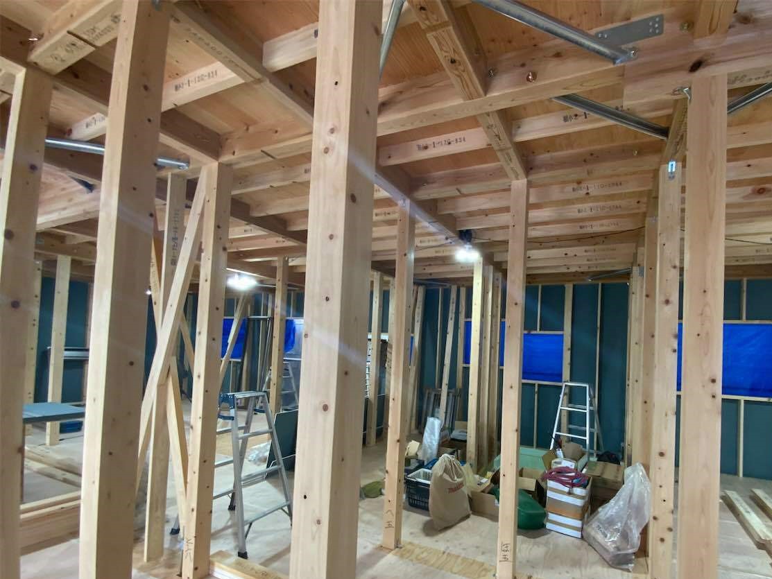現在は、耐力壁の釘止めや各種金物が取り付けられました。今回は、珍しく発砲ウレタン吹付断熱を壁天井に施しますので、いろいろと仕様がちがってきています。水平の剛性はいつもは構造用合板を使いますが、断熱の関係で火打ちとしています。