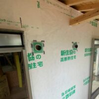 吹付断熱の施工に向けて、配線配管工事を行っています。外部は防水処理をしっかり行います。