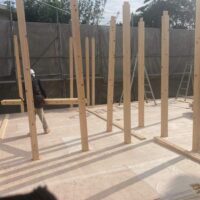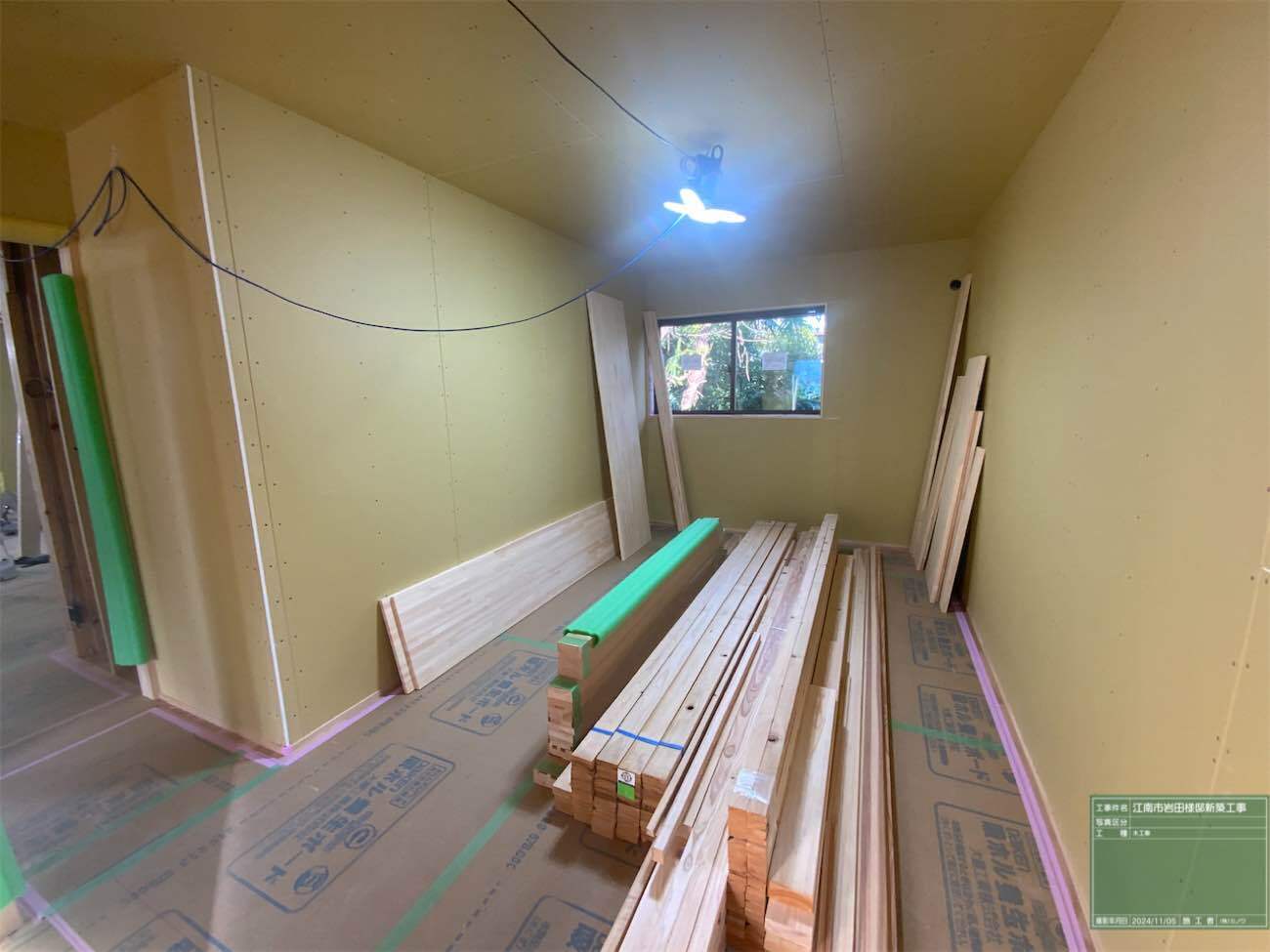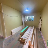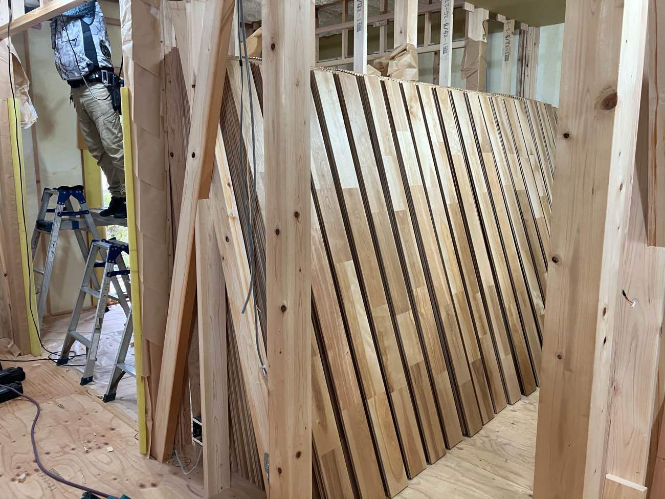 s井棟梁、和室の天井を張るため廻り縁を施工している月曜日の様子です。現場には、梱包から取り出され、きれいに並べられた床材。見本市の様です。床を張る準備がしてあります。梱包から取り出すことによって、板が乾燥し反りや、板目を確認して張ることができます。丁寧な仕事ですね~👍
