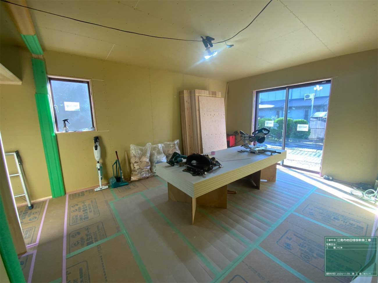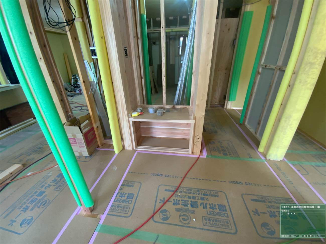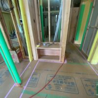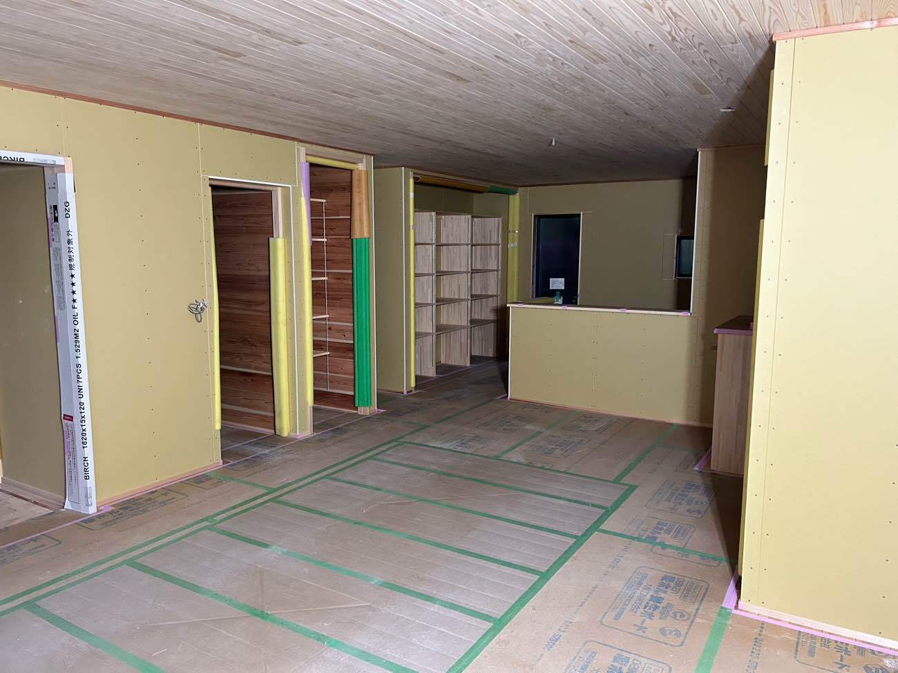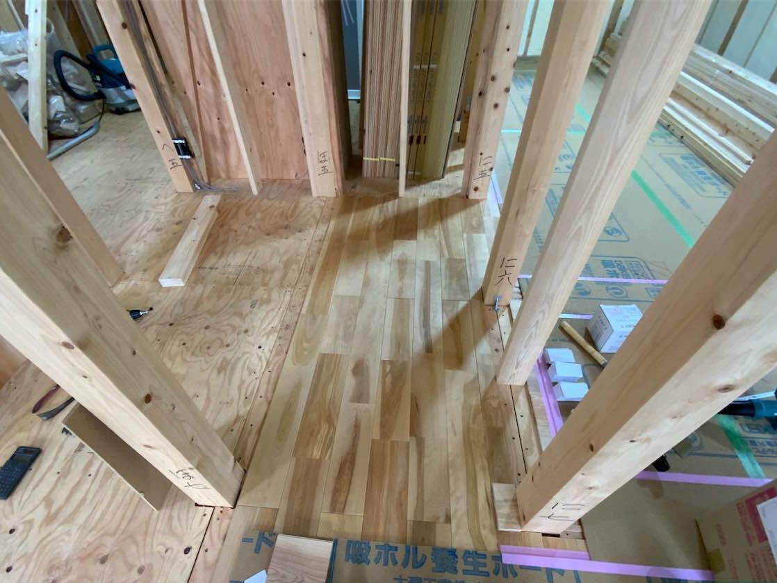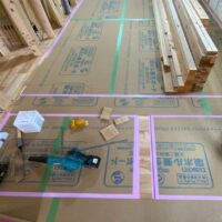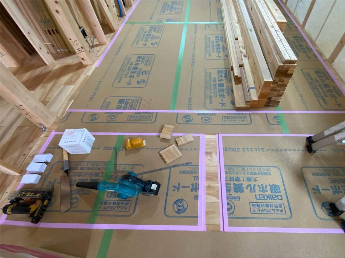 s井棟梁、床材を張り進めています。張り終わったら、きれいに養生。養生がしていない部分には、収納内部の間仕切りが取り付けられます。