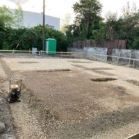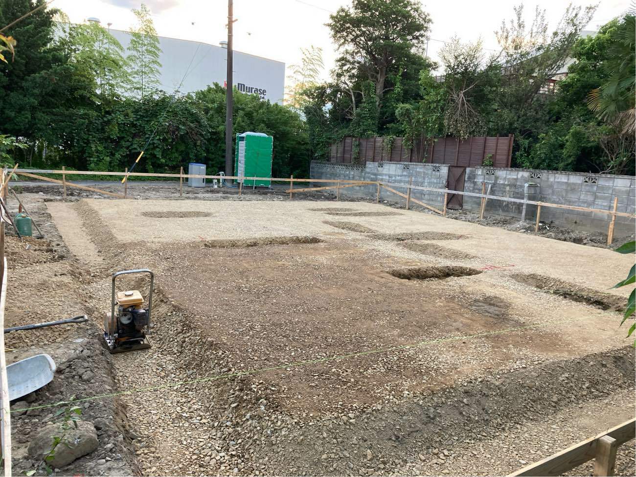 基礎工事が5日から始まっています。i様邸の基礎はミノワ基礎部隊t広さんが担当。水盛り遣り方で建物の位置と高さを出し掘方、砕石を入れて転圧を入念に掛けていきます。