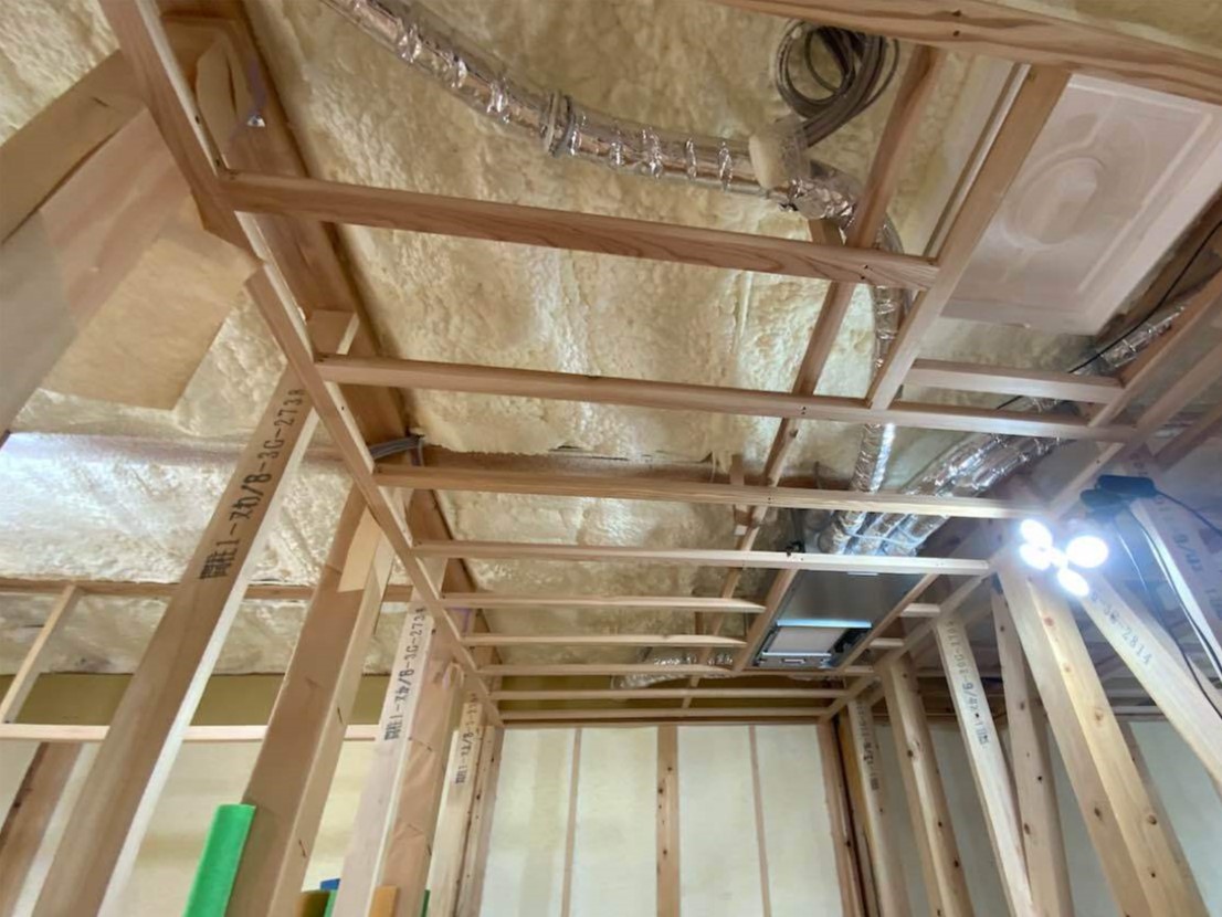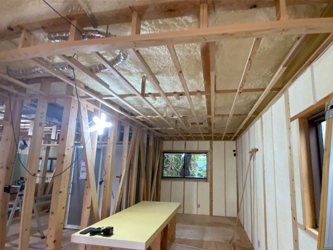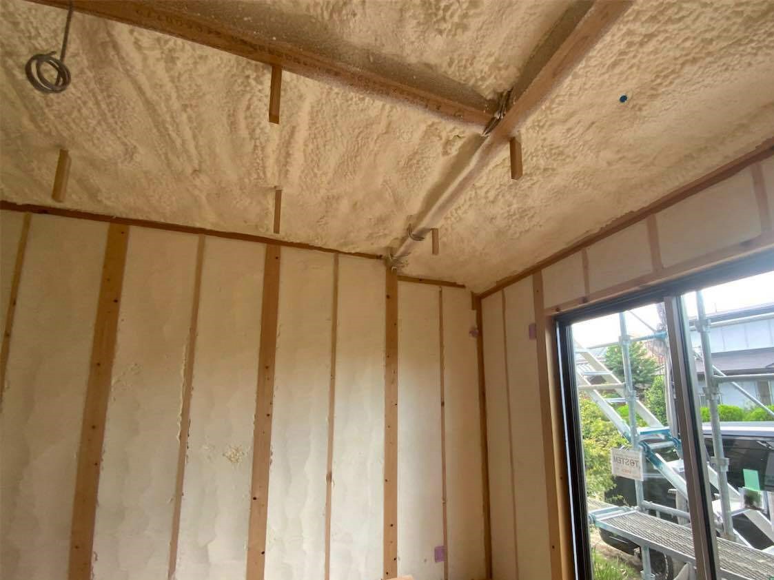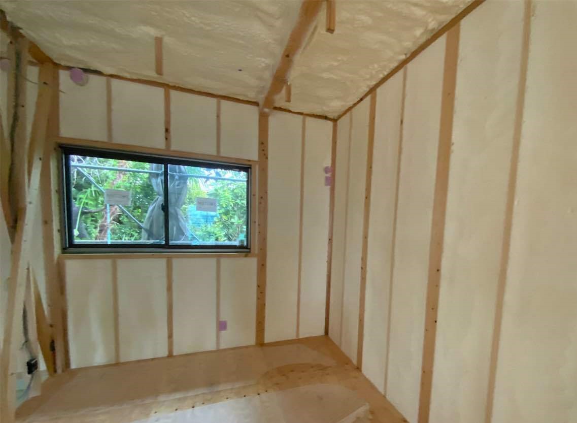 発砲ウレタンフォーム断熱材を施工しました。s井棟梁は、外壁下地を施していましたが、断熱材の施工を終えましたので内部も進めていくできます。来週からは、外壁の板金工事も始まります。