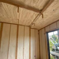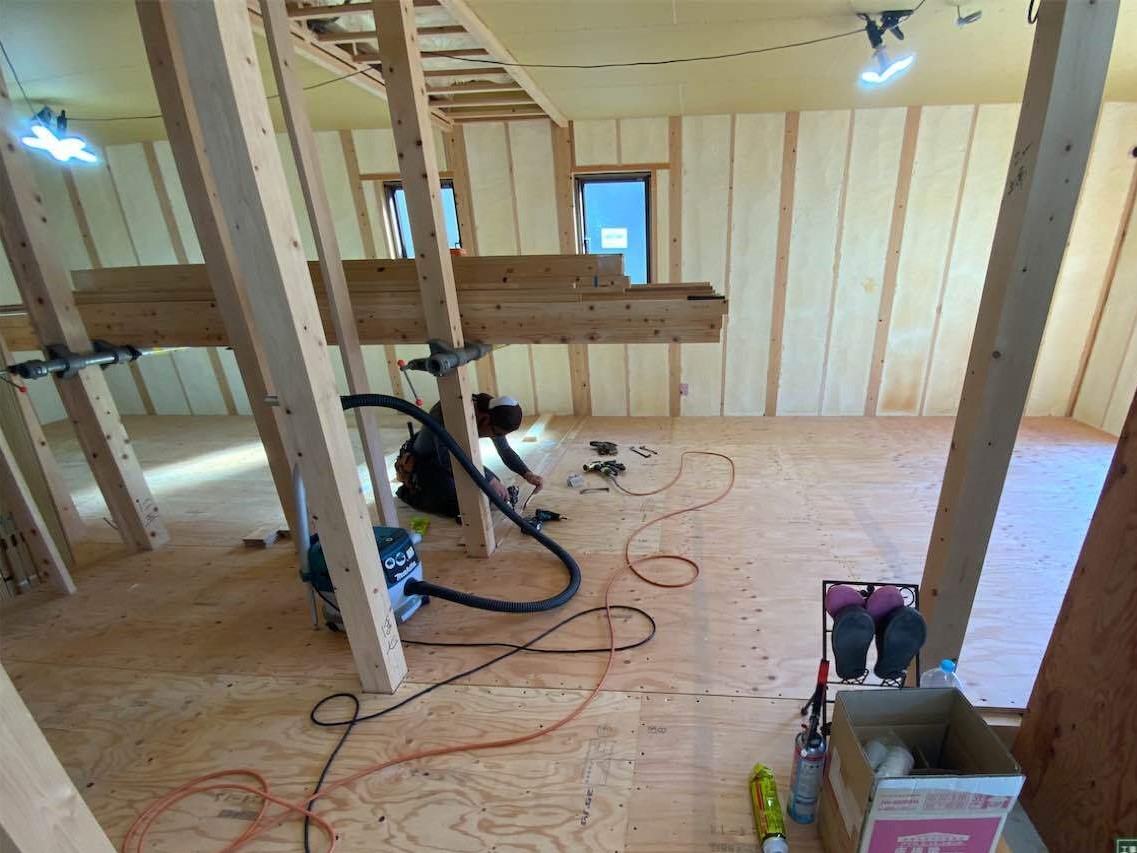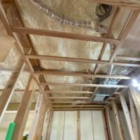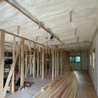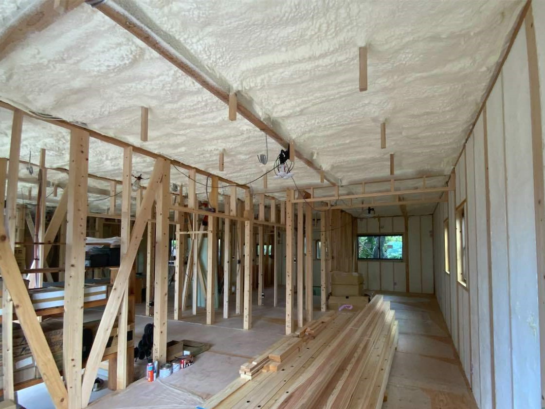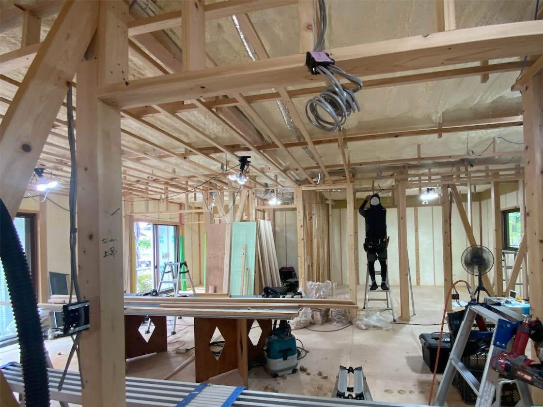 発砲ウレタンフォーム断熱材を施工しました。s井棟梁は、外壁下地を施していましたが、断熱材の施工を終えましたので内部も進めていくできます。来週からは、外壁の板金工事も始まります。