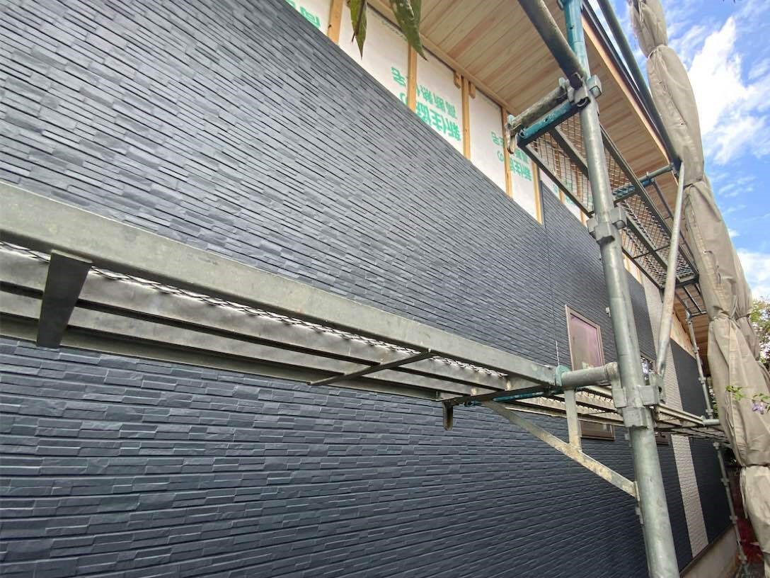 外壁のサイディング張りが終わろうとしています。一部色を変えて、変化を付けられました。どんな感じになるのかなぁ。