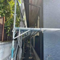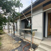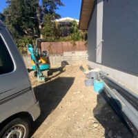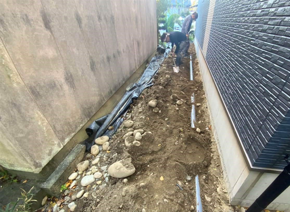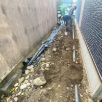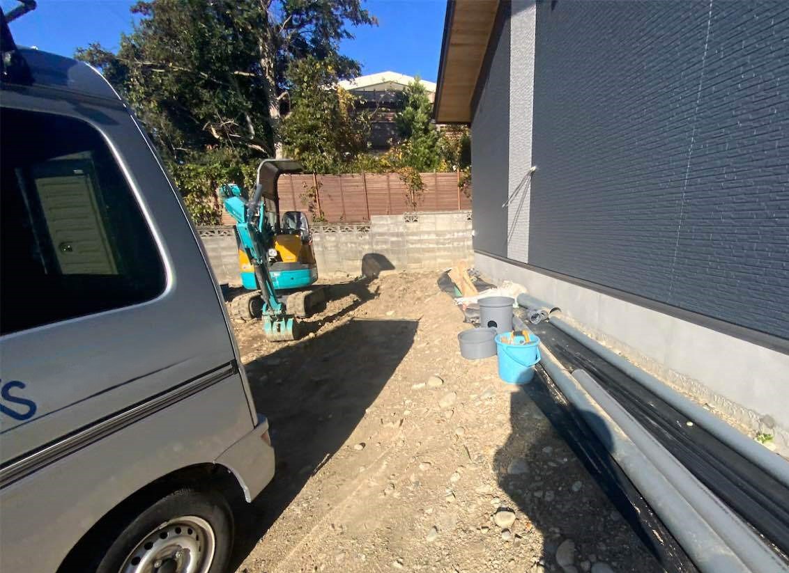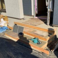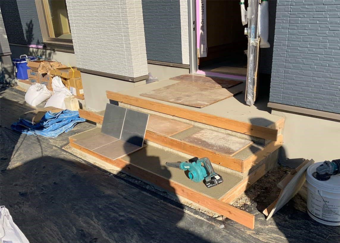 外部は、jサービスさんにより、外配管の工事が進んでいます。玄関のタイルも、y本左官さんが張り始めています。