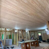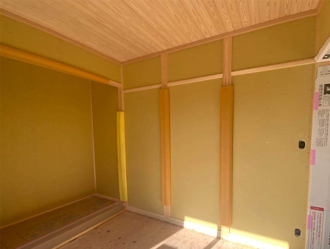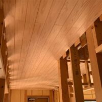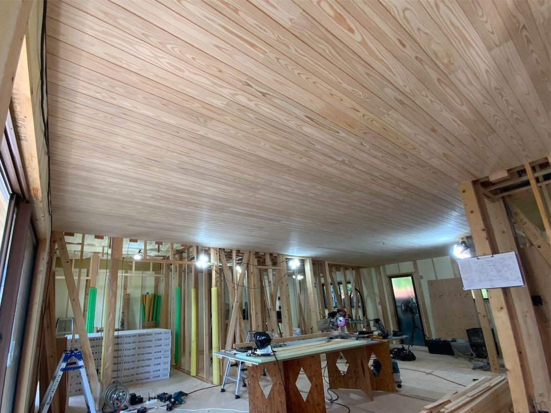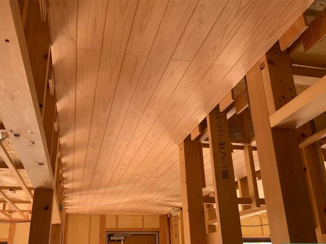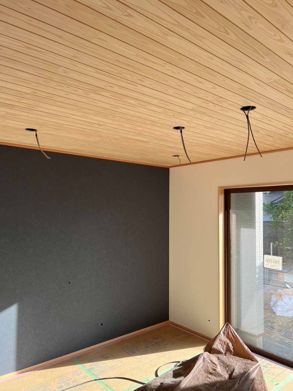 s井棟梁、天井の羽目板やプラスターボードを張り進めています。今回の羽目板は、杉無地(白地)板。経年変化で色が変わると、桧とほとんど変わらない表情になります。木の香りをもっと嗅ぎたい!と言う木の香り中毒の方は桧がお勧めですが、木の色合いを楽しみたいと言う方は、こちらでも十分👍ミノワでも人気の羽目板です。