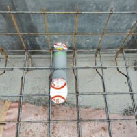 基礎の立ち上がりは、鉄筋コンクリート造の梁と同じ役割をします。人通口を設ける時はその立ち上がりが切断されることになるので、地中側に梁と設けます。逆梁です。給排水、給湯配管用に、予め貫通スリーブを通しておきます。