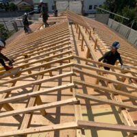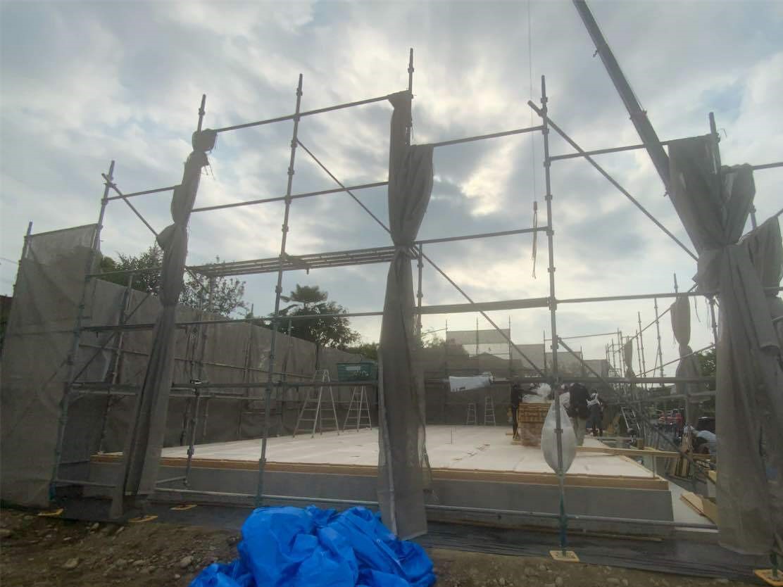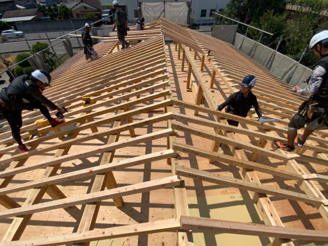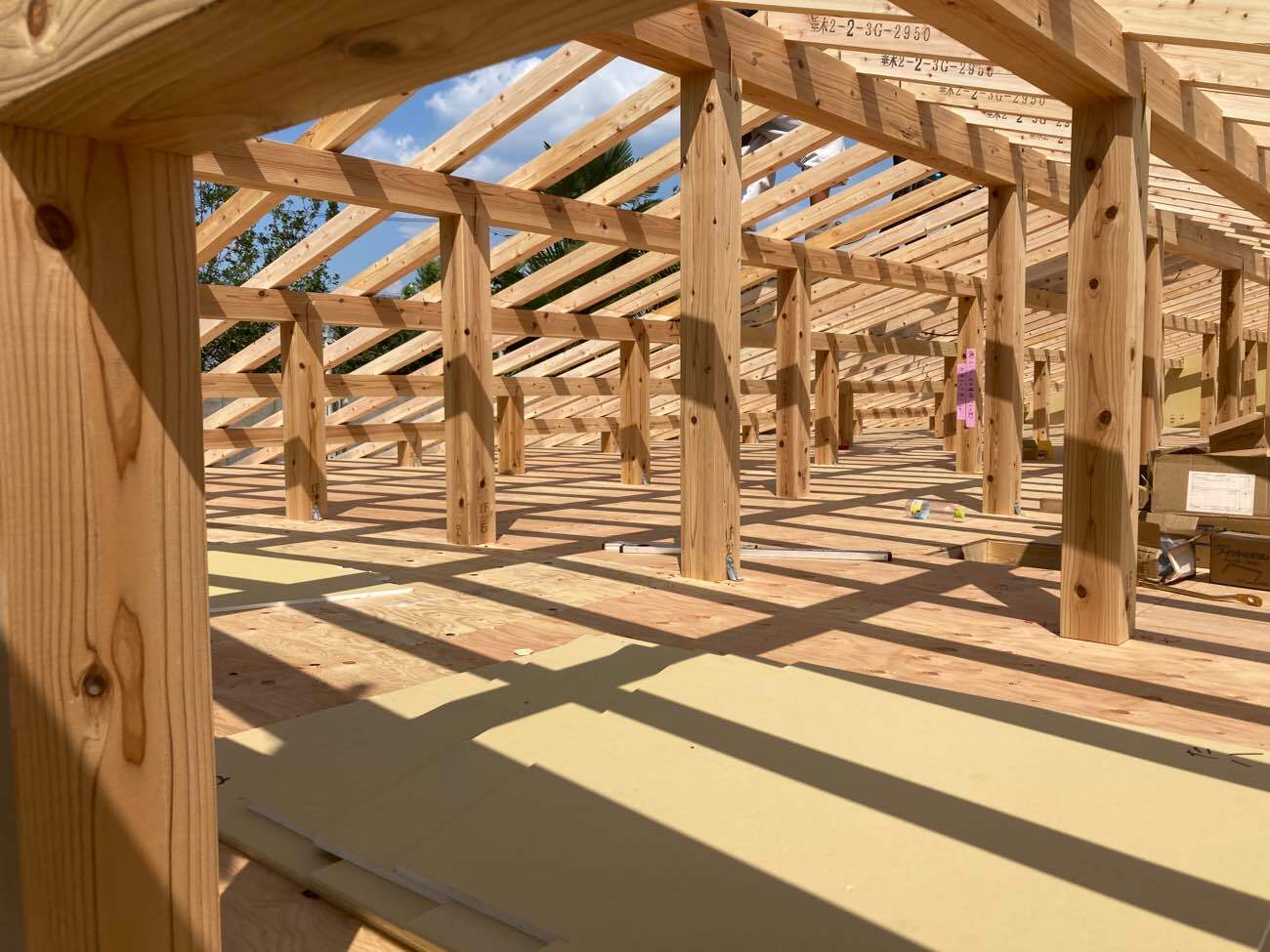 8月5日に建て方が行われました。前日の日曜日に夕立があり、お天気が心配でしたが、a監督は最強の晴れ男👍うっすら曇り空と思っていたら、日中は日差しが肌に刺さるくらいの炎天下の中、今回は平均年齢やや高めのミノワ大工集団が命をかけて建てました。