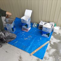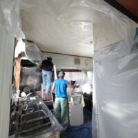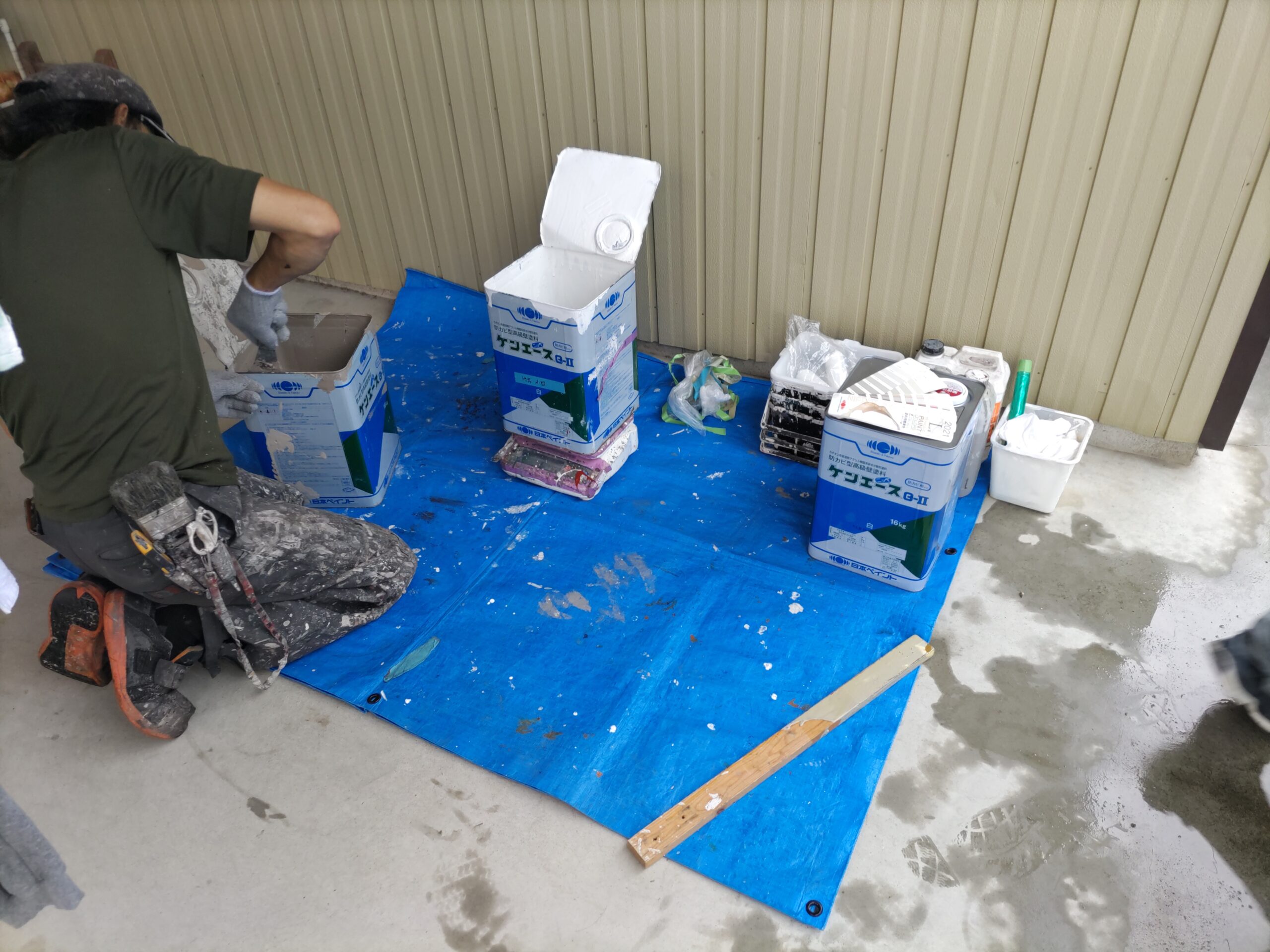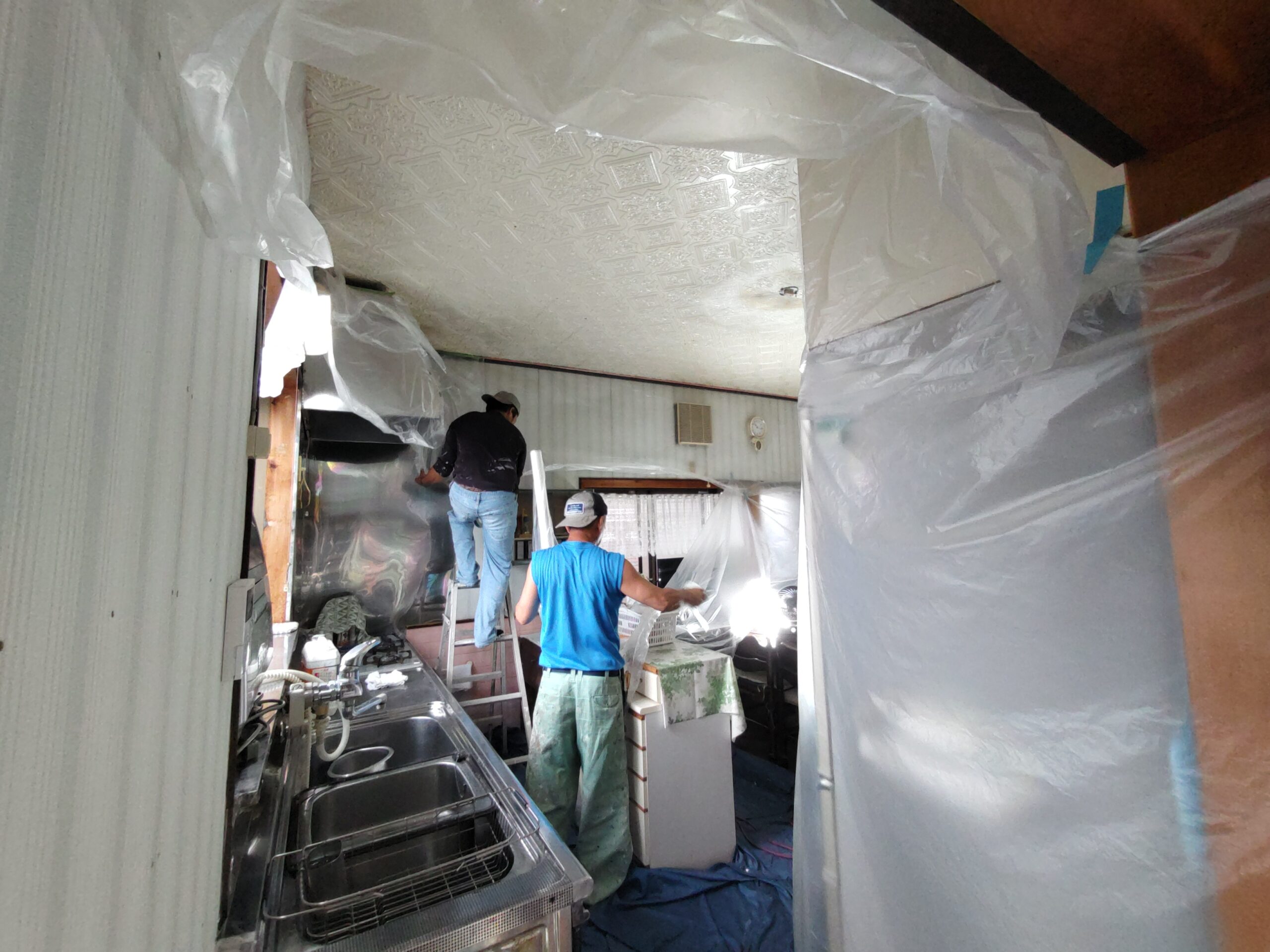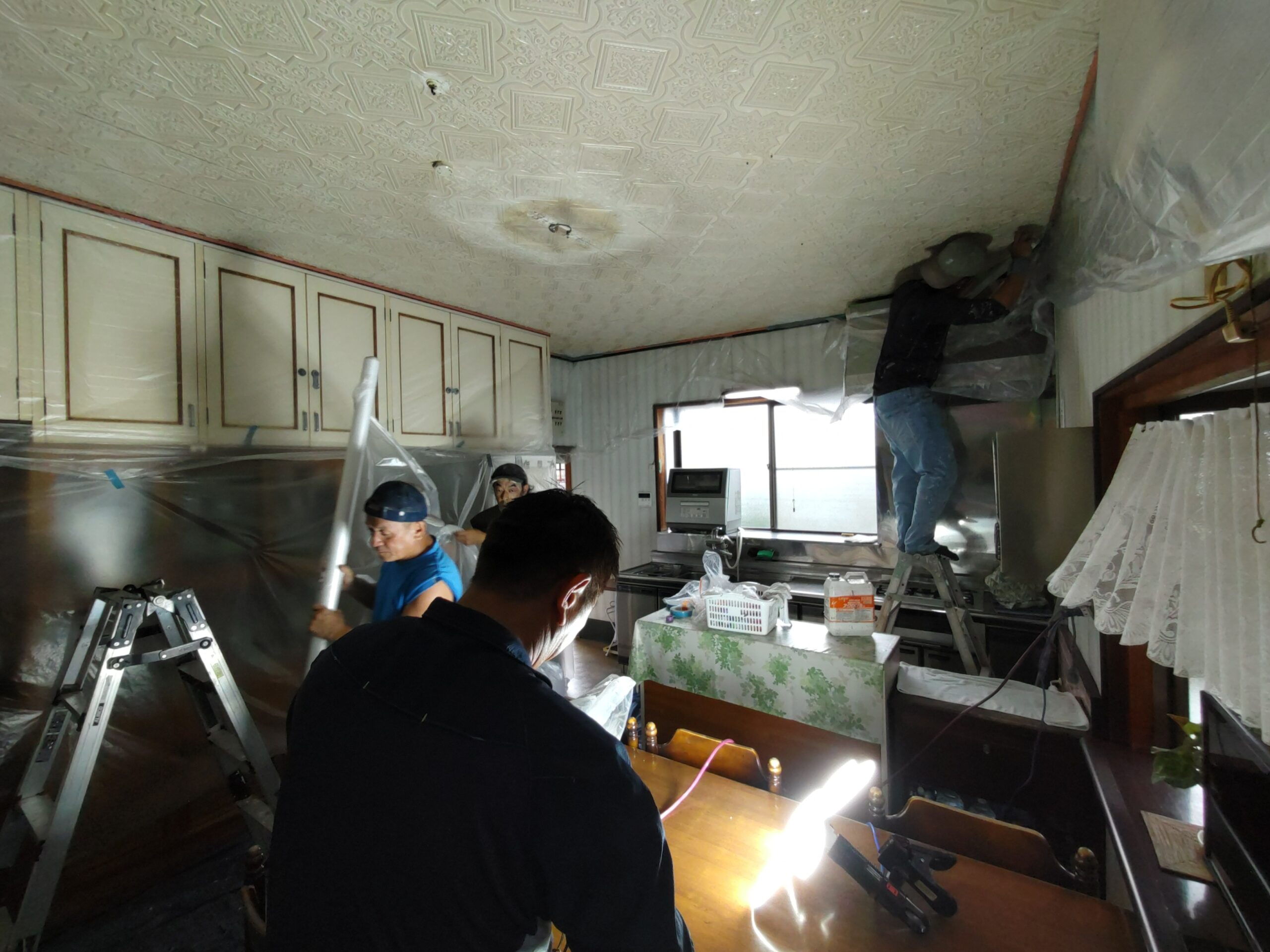 まずは養生。マスキングシートで天井以外を完全に覆ってしまい、塗料が他へ付かないようにカバーします。ここも見事なチームワーク、と言うより4人密集しているキッチン内に撮影している筆者が非常に邪魔でしょうがない、とはおくびにも表情には出さない職人さんたちの手際の良さです。