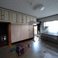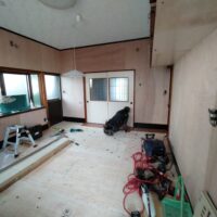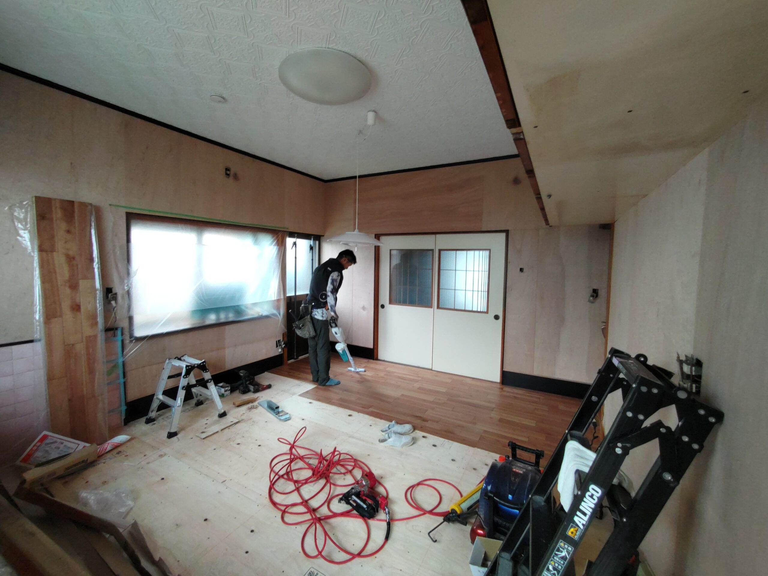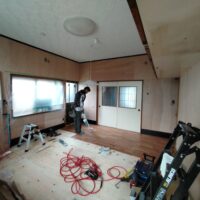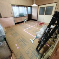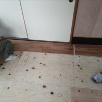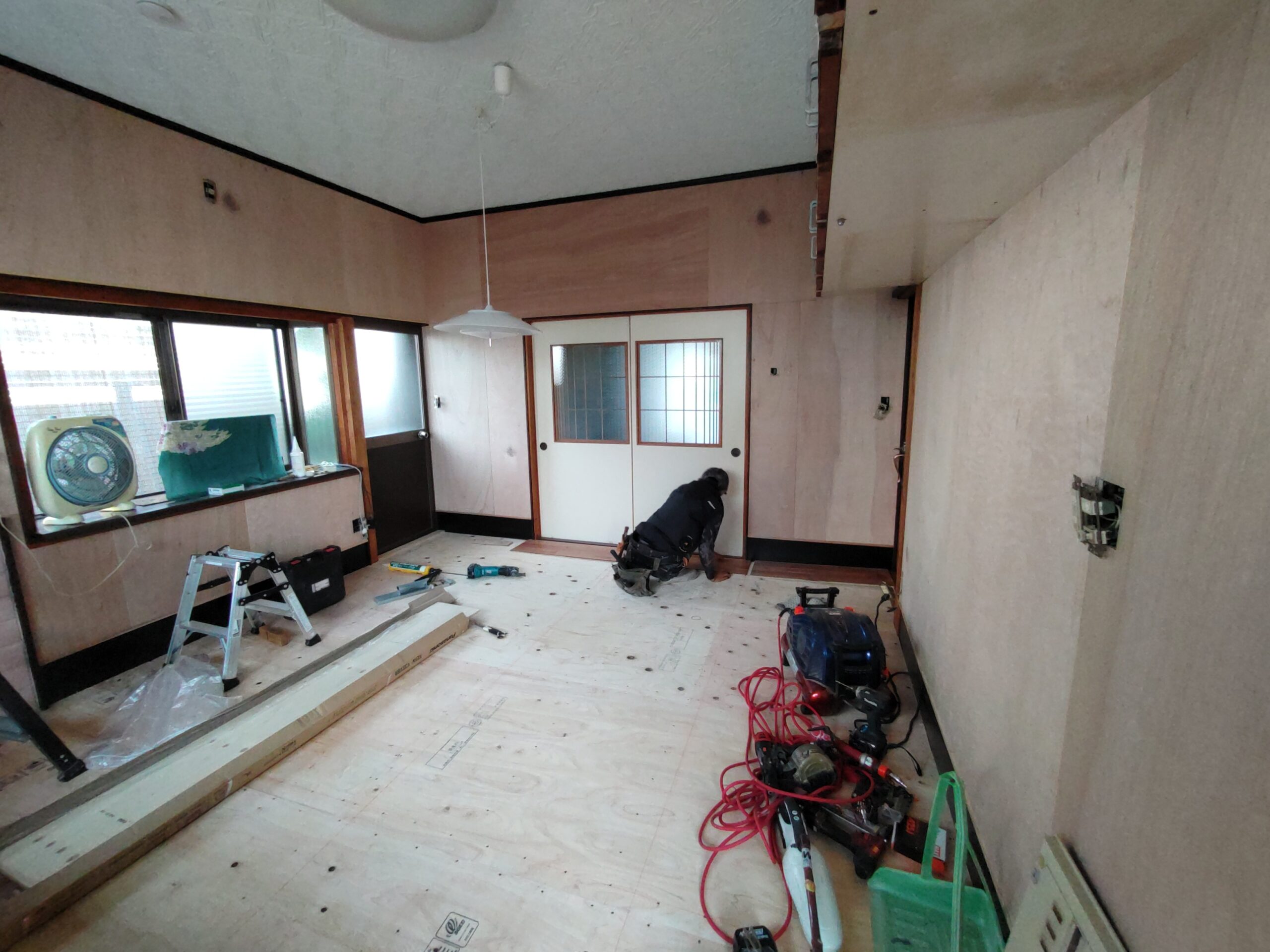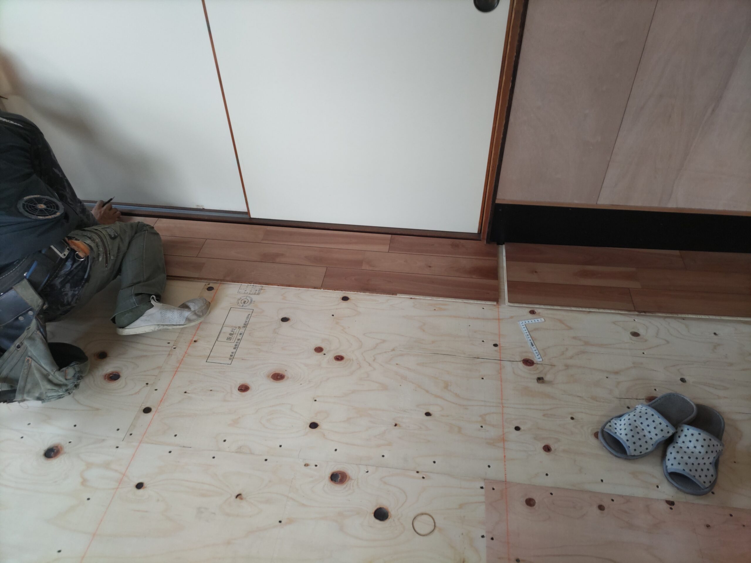 壁の下地が終わったら次は床下地の施工に入ります。築40~50年の住宅に『あるある』ですが、当時の合板フローリングの接着剤の粘着力が弱まり、薄いベニヤを重ねただけとなってしまった床板がしなってフワフワになってしまうという現象です。一旦めくって張り替えてしまえば床高さも変わらないのですが、大工事になってしまうので上から構造用合板を張り、その上に現代のフローリングを張って補強する、という『あるある』の収まりで施工します。 他の部屋と床に段差ができてしまうのでは?と思われがちですが、当時の建て方として、建具の下には20㎜前後の敷居があるケースがほとんどで、その部屋だけ嵩上げをしても敷居高さを越えなければ現状の敷居よりは段差ができない、という収め方ができます。