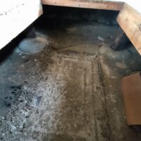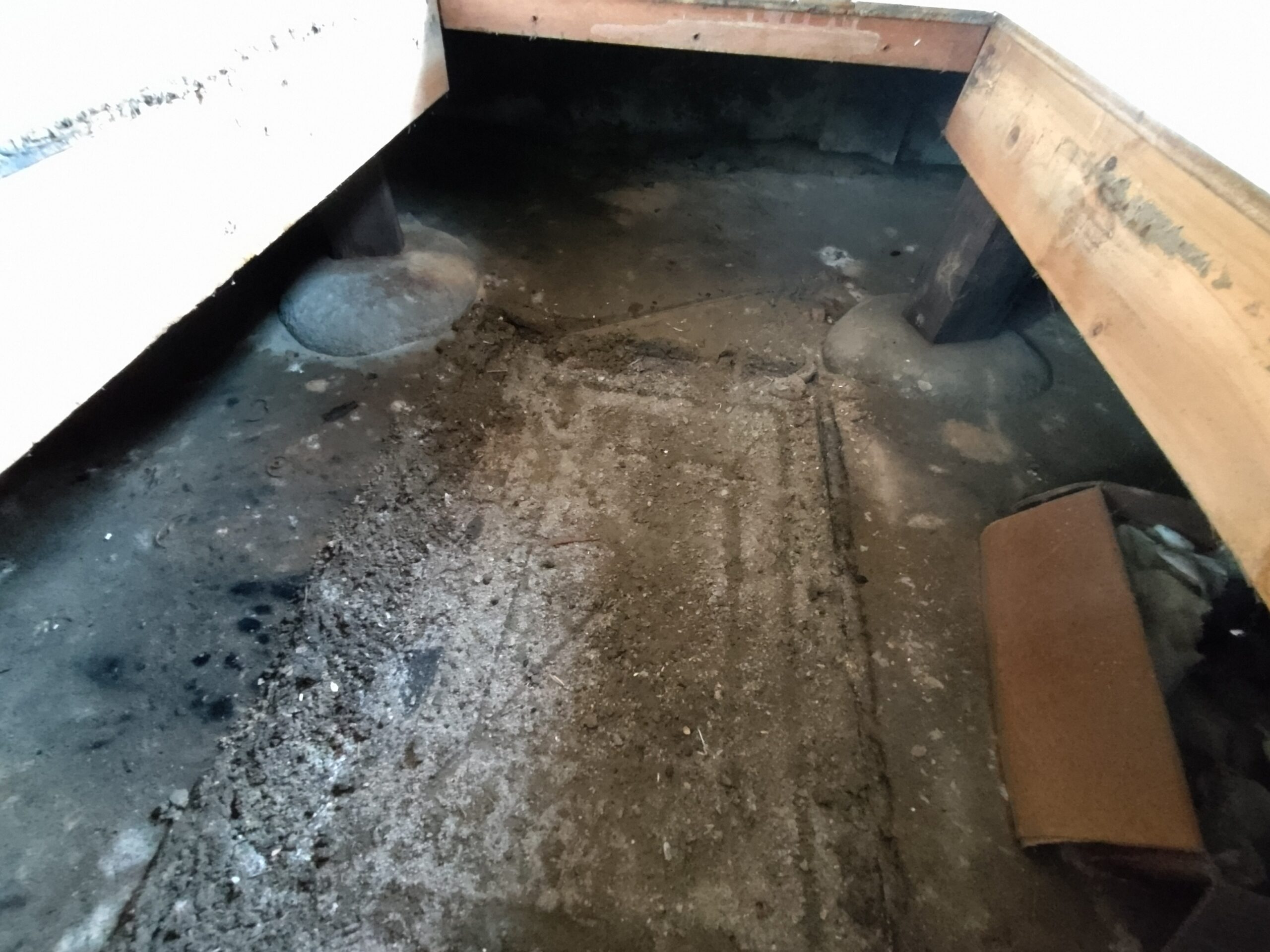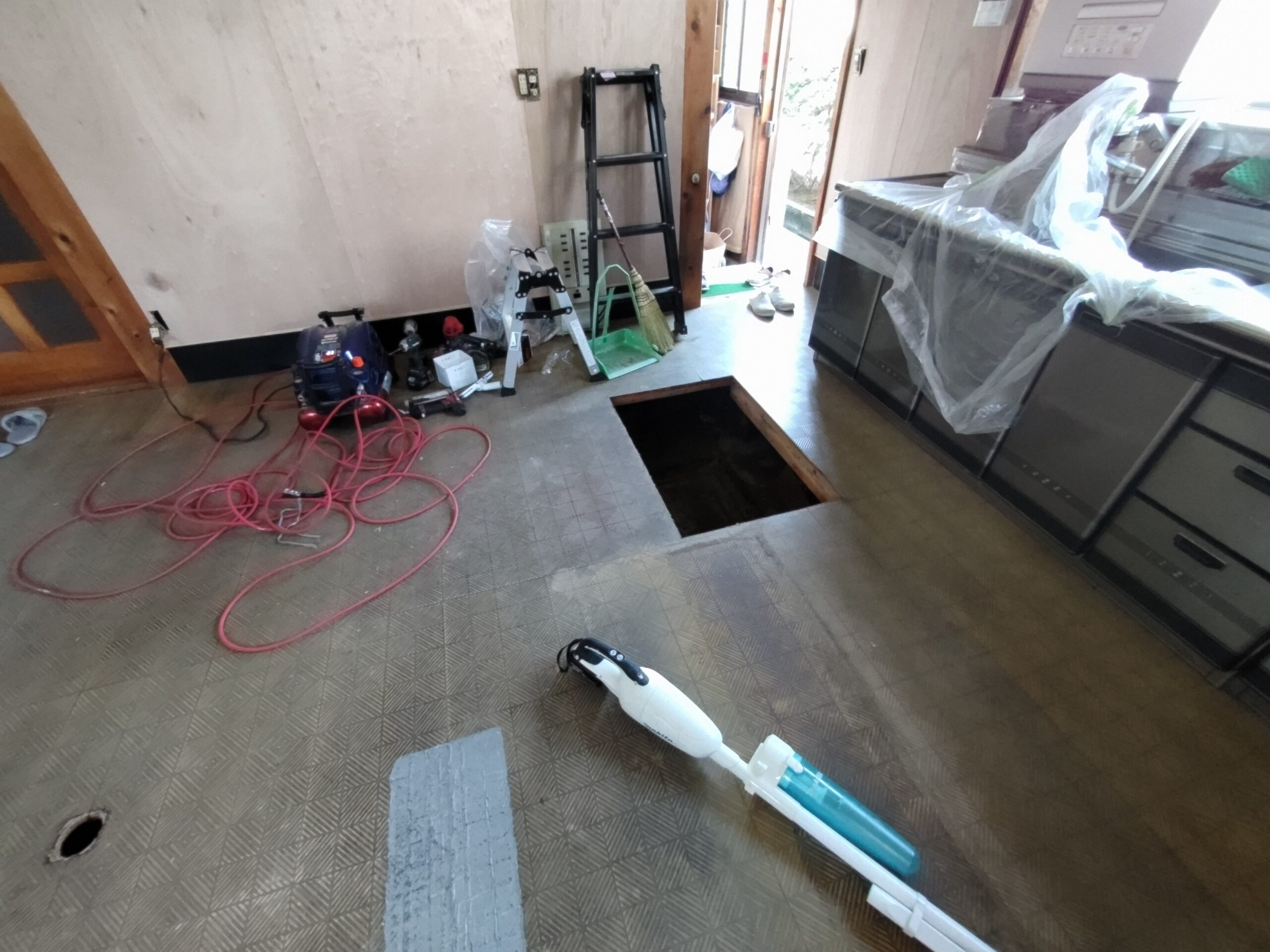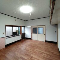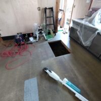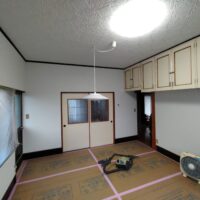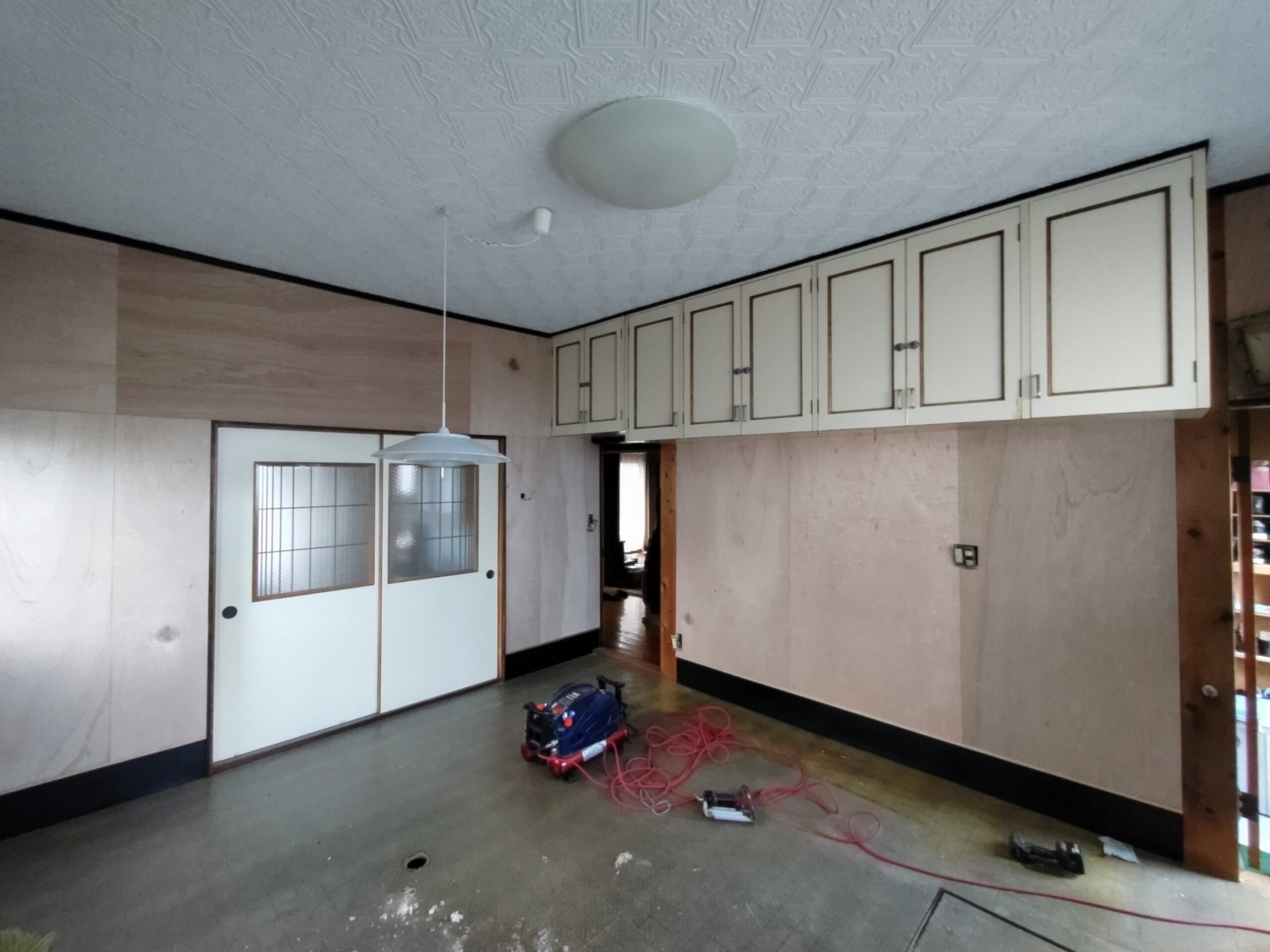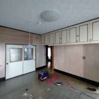 壁の下地が終わったら次は床下地の施工に入ります。築40~50年の住宅に『あるある』ですが、当時の合板フローリングの接着剤の粘着力が弱まり、薄いベニヤを重ねただけとなってしまった床板がしなってフワフワになってしまうという現象です。一旦めくって張り替えてしまえば床高さも変わらないのですが、大工事になってしまうので上から構造用合板を張り、その上に現代のフローリングを張って補強する、という『あるある』の収まりで施工します。 他の部屋と床に段差ができてしまうのでは?と思われがちですが、当時の建て方として、建具の下には20㎜前後の敷居があるケースがほとんどで、その部屋だけ嵩上げをしても敷居高さを越えなければ現状の敷居よりは段差ができない、という収め方ができます。