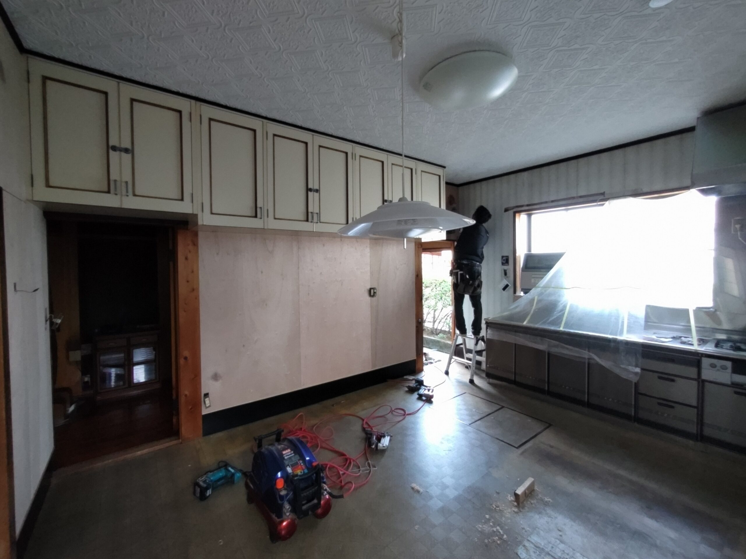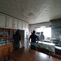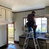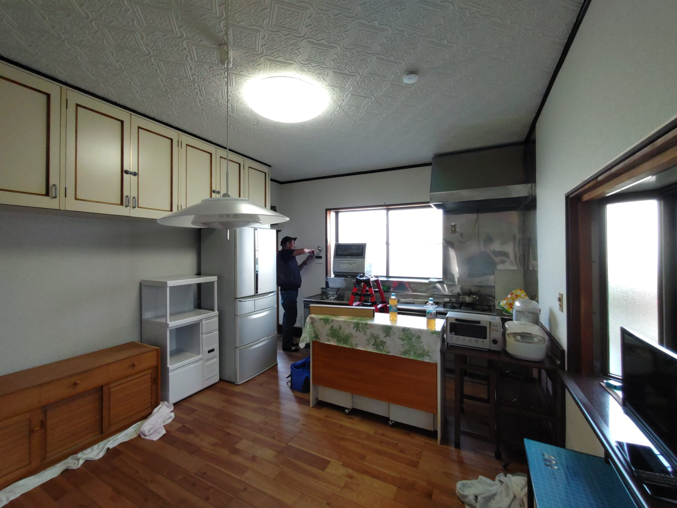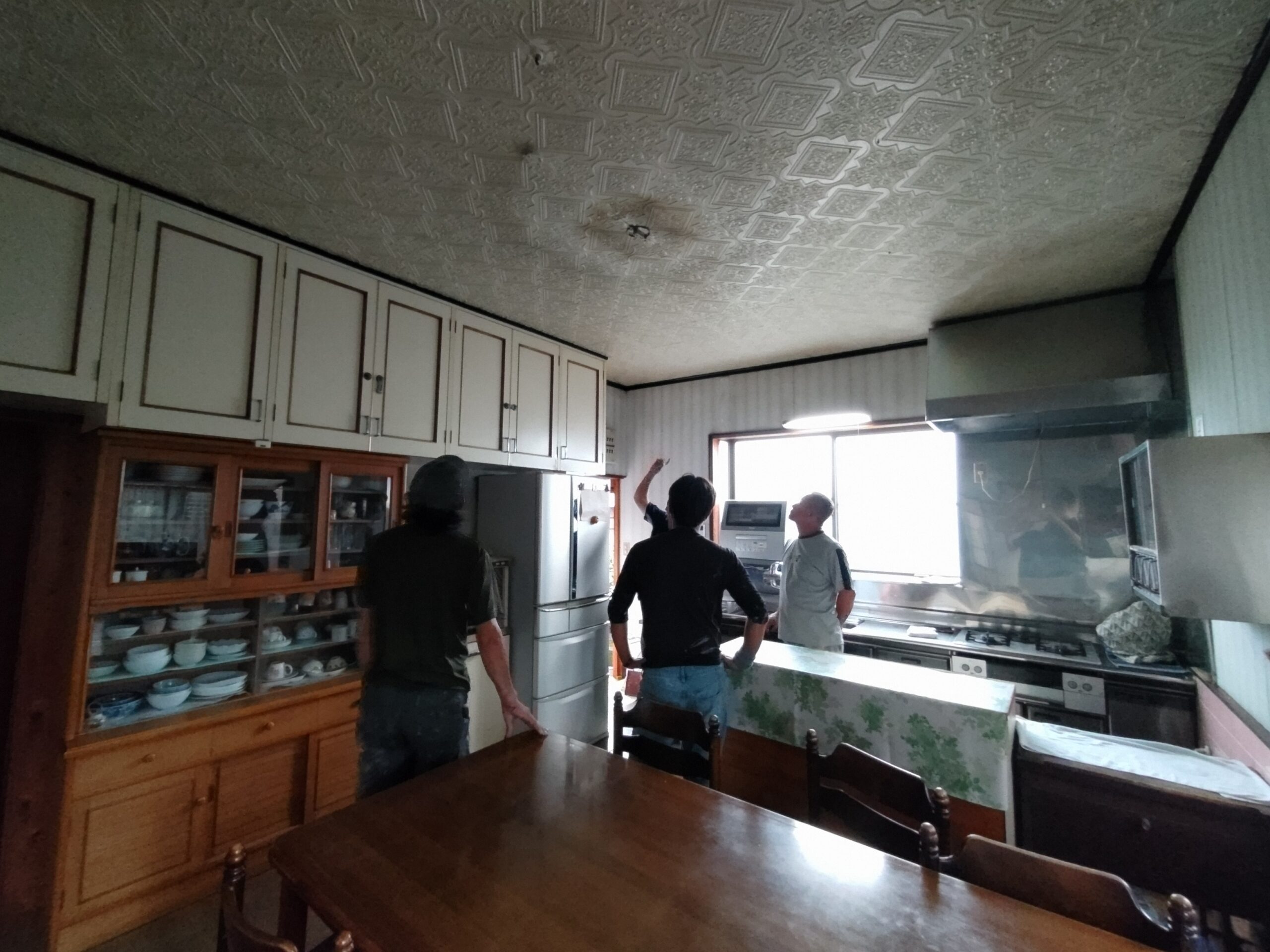 リフォーム内容はダイニングキッチンの天井、壁、床の張り替え。天井は特に傷んでいる事は無く色褪せ日焼けのみのため、解体するよりは塗装した方が早い、という事で早速塗装のh屋さんに入ってもらいました。梅雨時の雨天のため外部で仕事ができない職人さんが3人がかりで来てくれましたので作業が早いのなんの。筆者の段取りが追いつくか非常に気がかりでしたが、そんな心配ご無用とばかりに順調に進んでいきました。