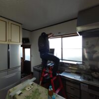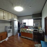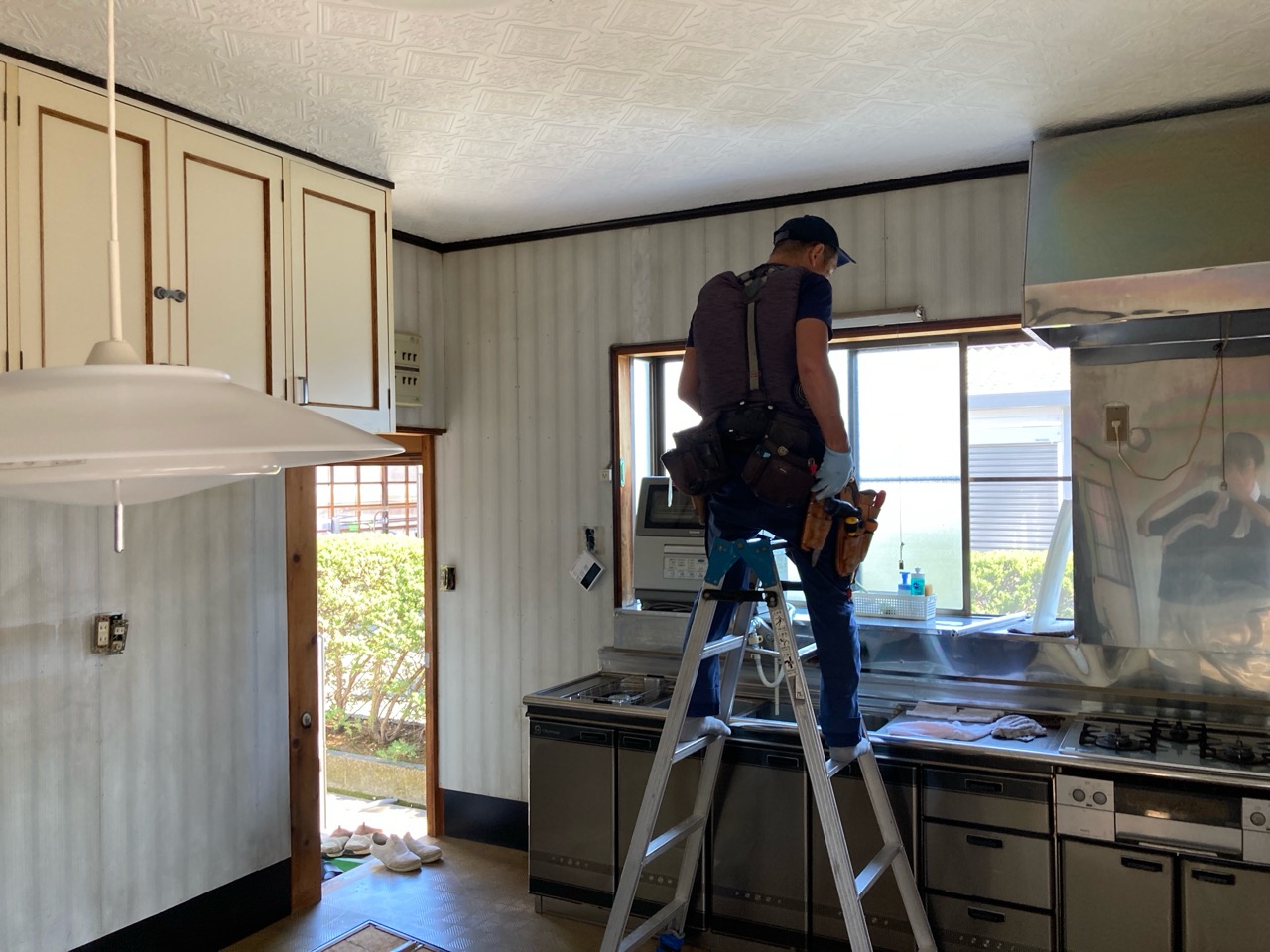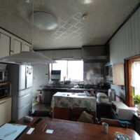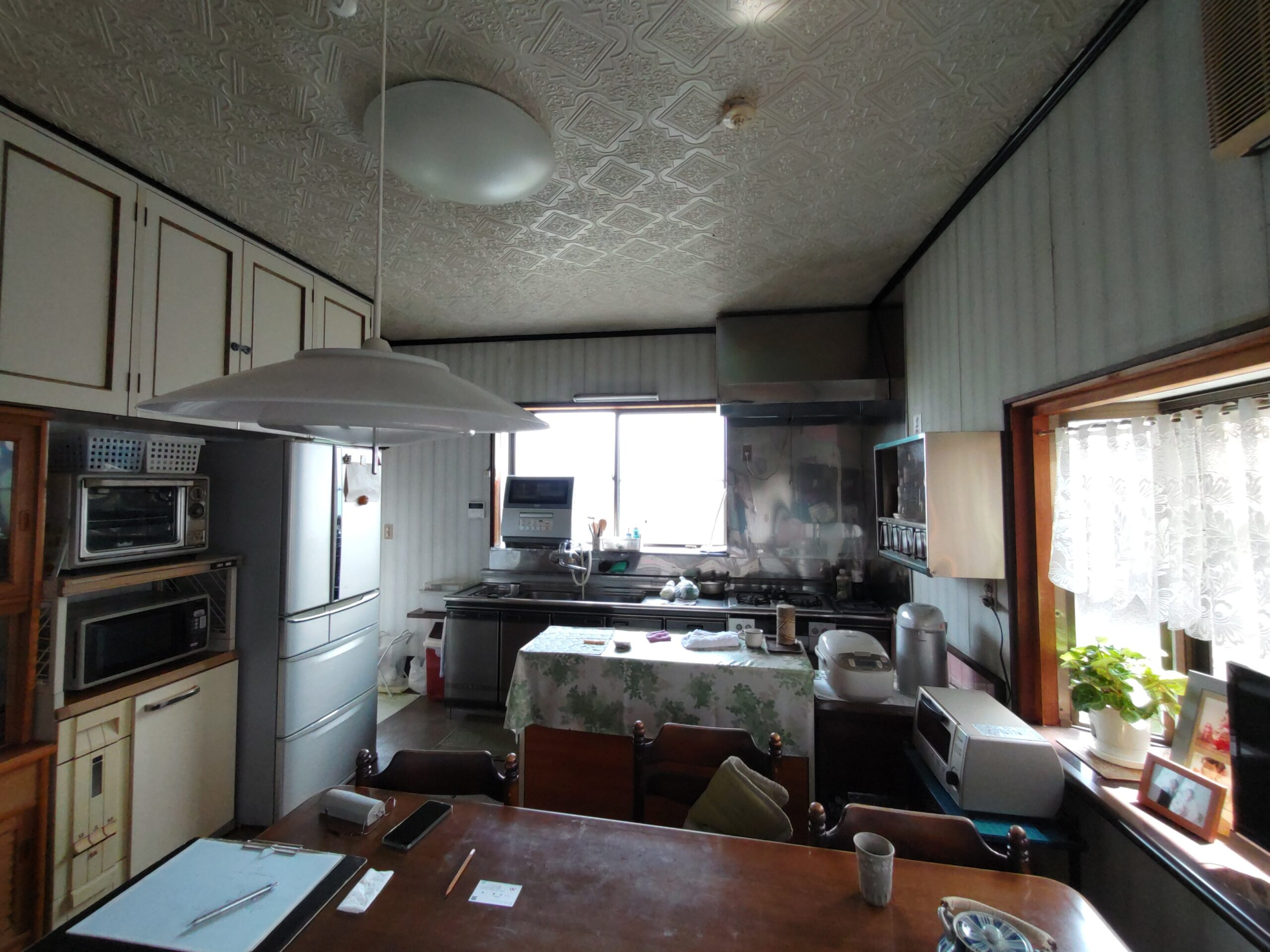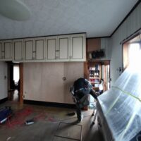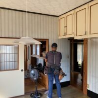 リフォーム内容はダイニングキッチンの天井、壁、床の張り替え。天井は特に傷んでいる事は無く色褪せ日焼けのみのため、解体するよりは塗装した方が早い、という事で早速塗装のh屋さんに入ってもらいました。梅雨時の雨天のため外部で仕事ができない職人さんが3人がかりで来てくれましたので作業が早いのなんの。筆者の段取りが追いつくか非常に気がかりでしたが、そんな心配ご無用とばかりに順調に進んでいきました。