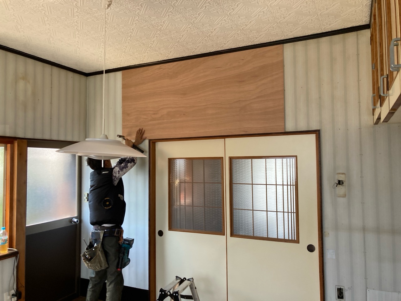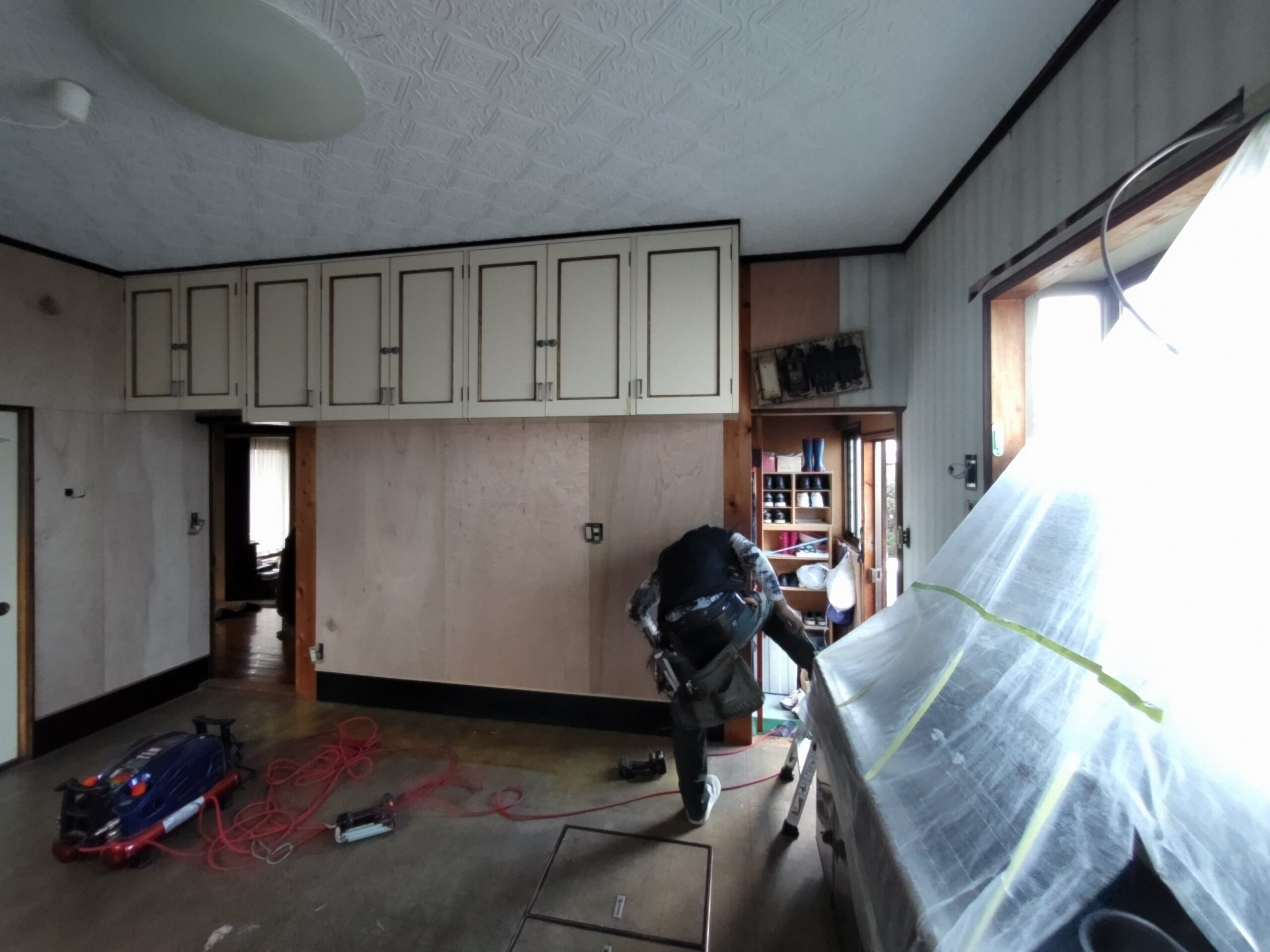 カットした家具を運んで現場にとんぼ返り。壁下地のベニヤがだいぶ張れてきています。クロスの下地として既存の仕上げの上から薄ベニヤを張っていきますが、ここでもカミソリの刃一枚入らない張り合わせを行っています。