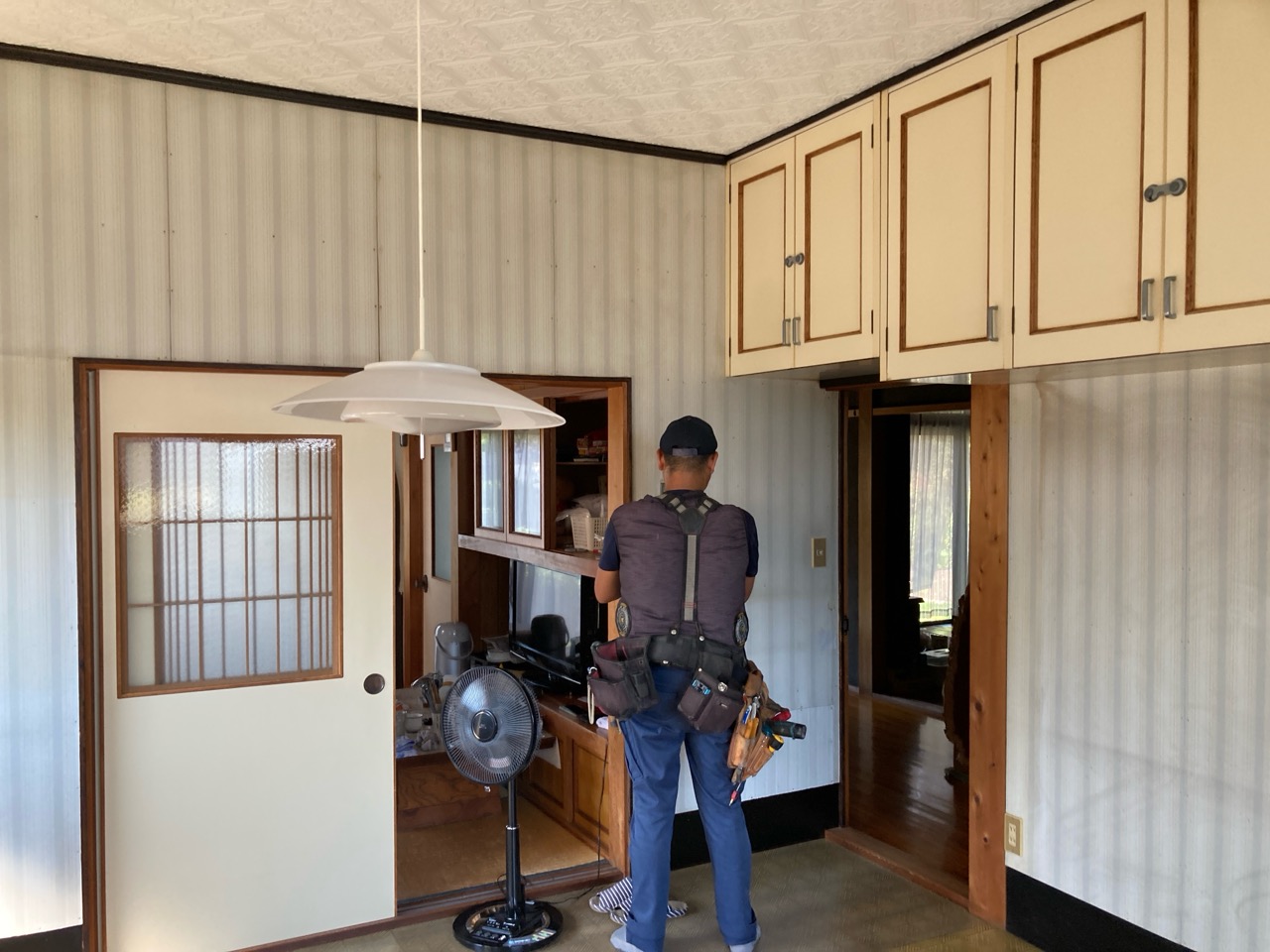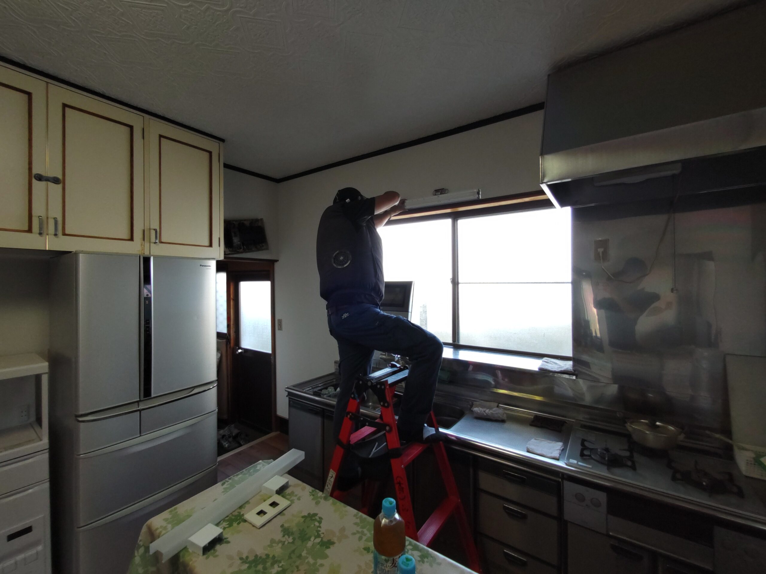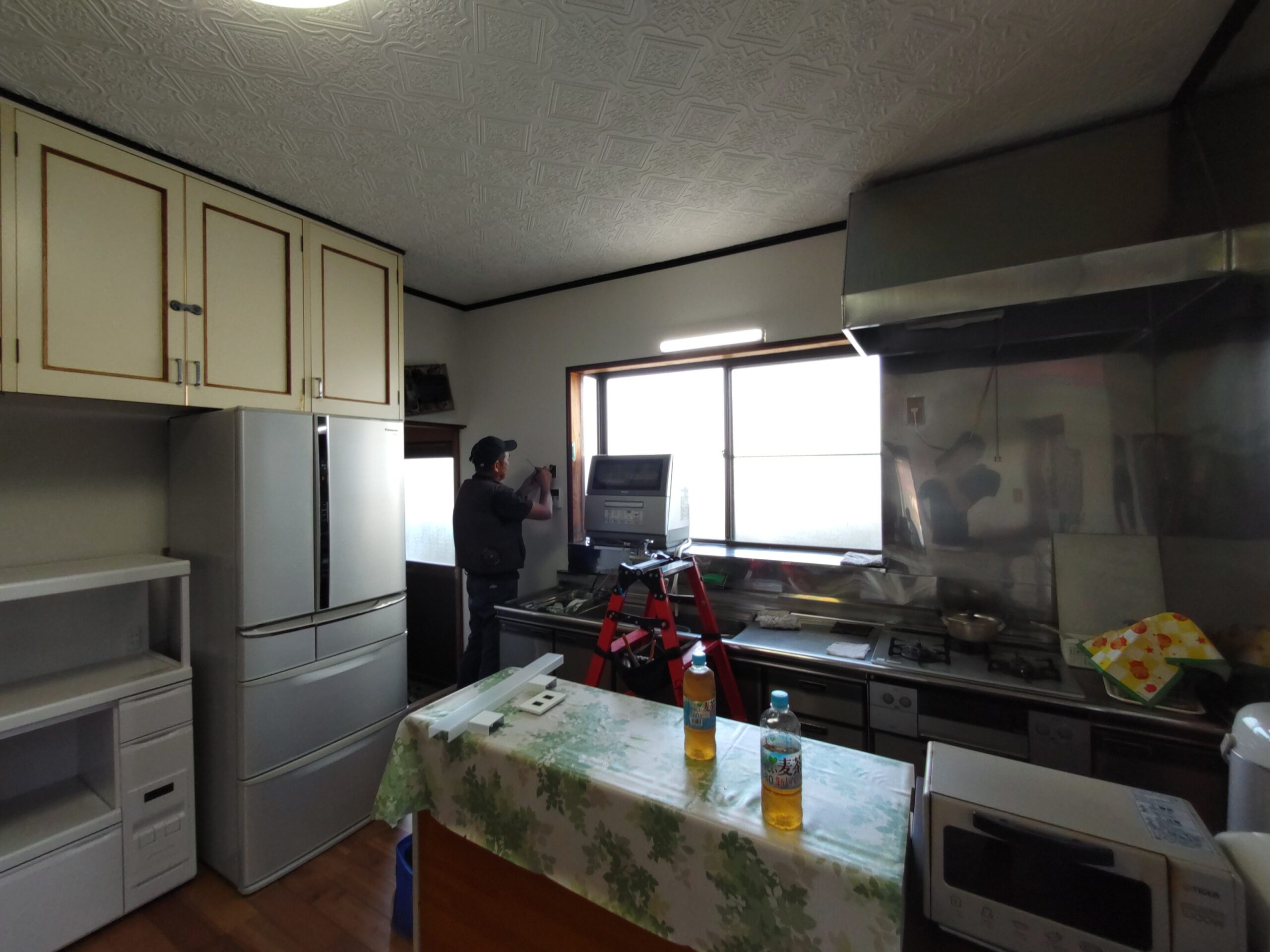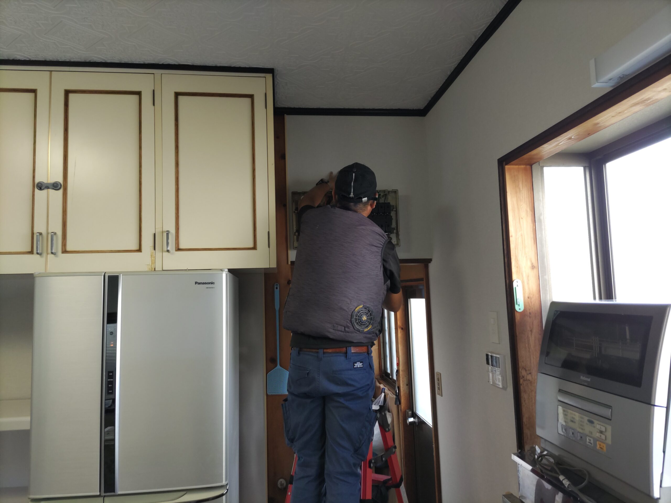 クロス施工後に新規照明器具の取付、クロスのために取り外していた分電盤等やスイッチプレートなどを取付けて、約1週間にわたった真夏のリフォームも完了です。h場さんに手伝ってもらって、床施工のために移動していた冷蔵庫なども元の位置に戻しました。