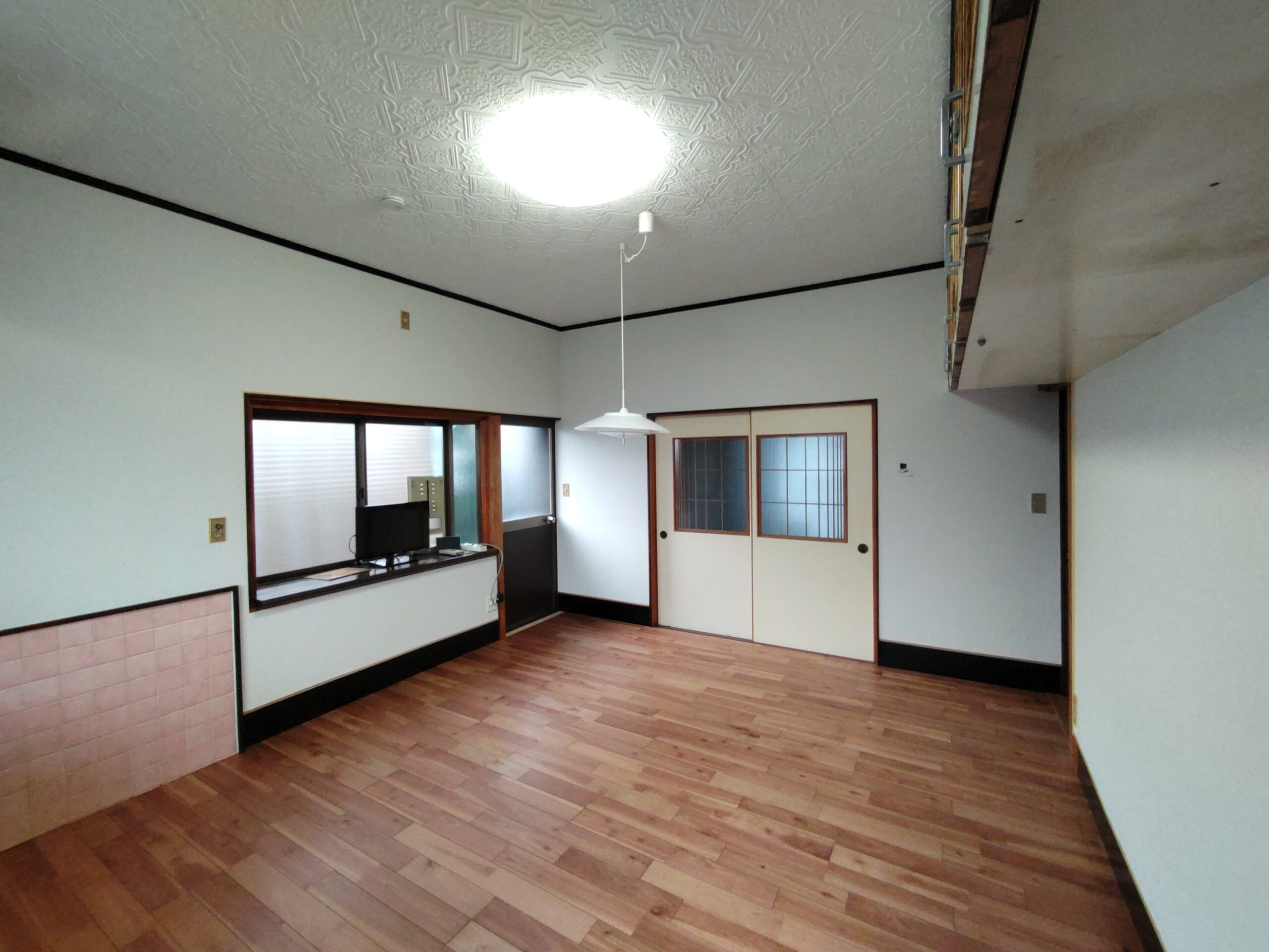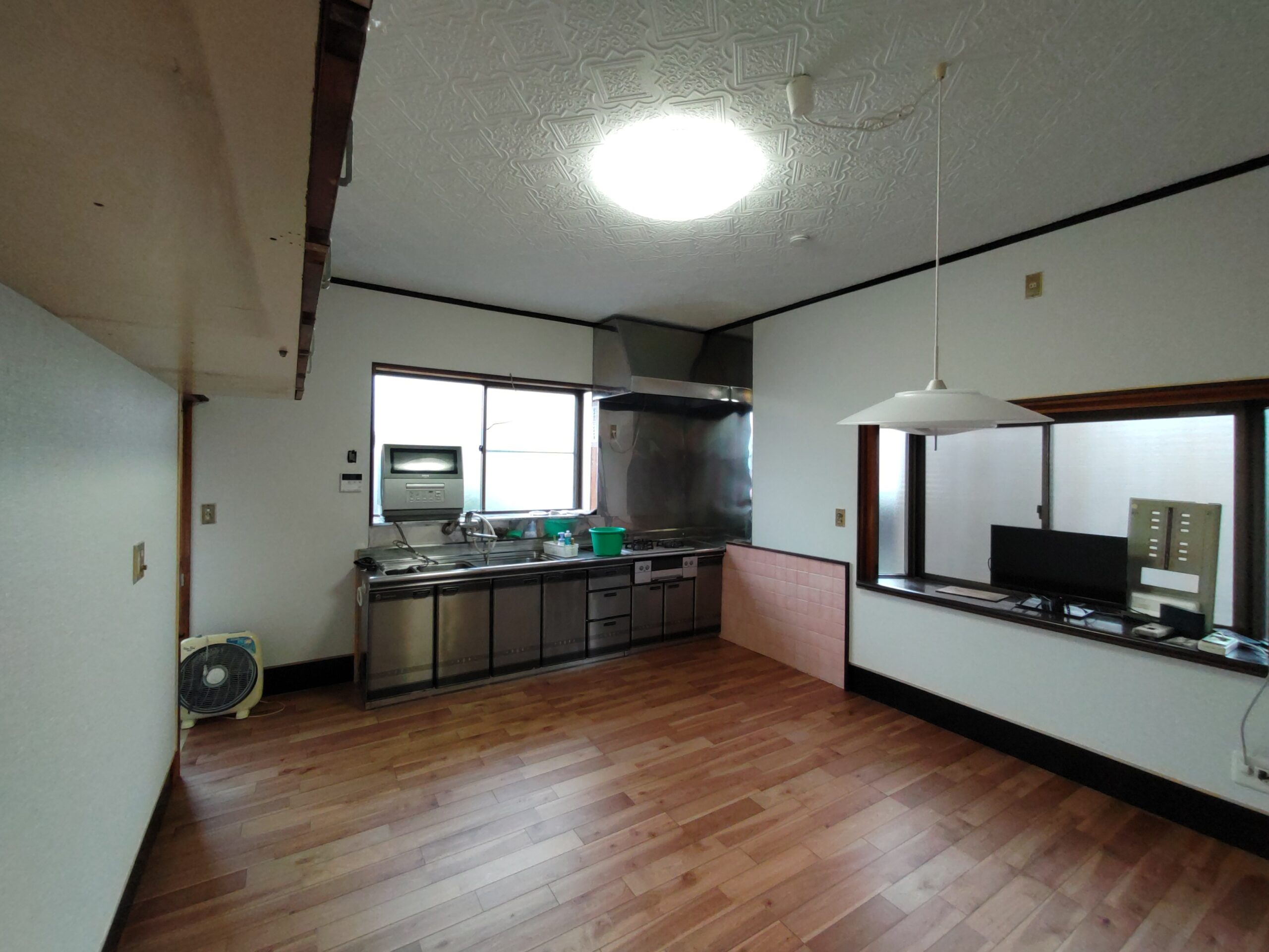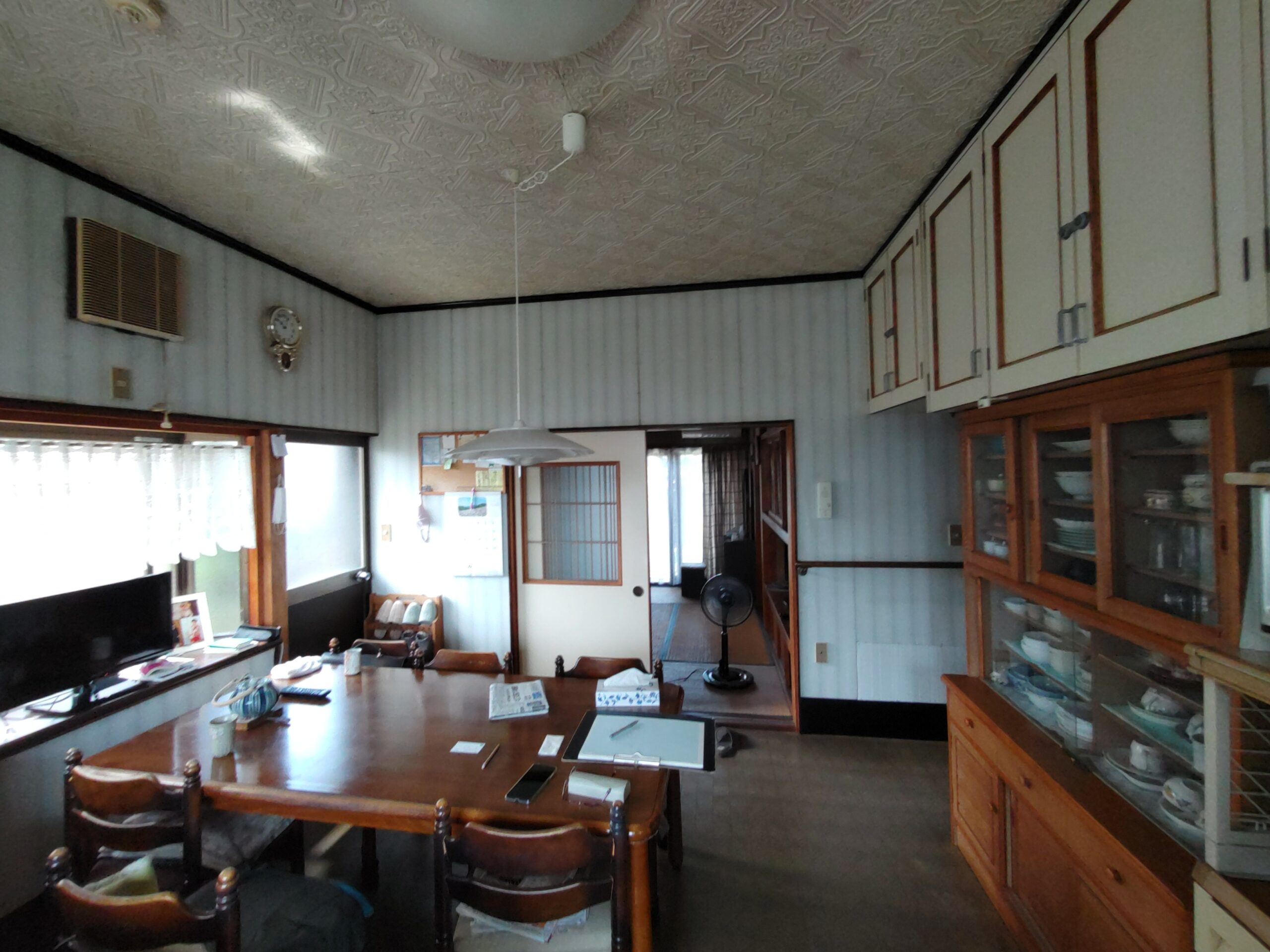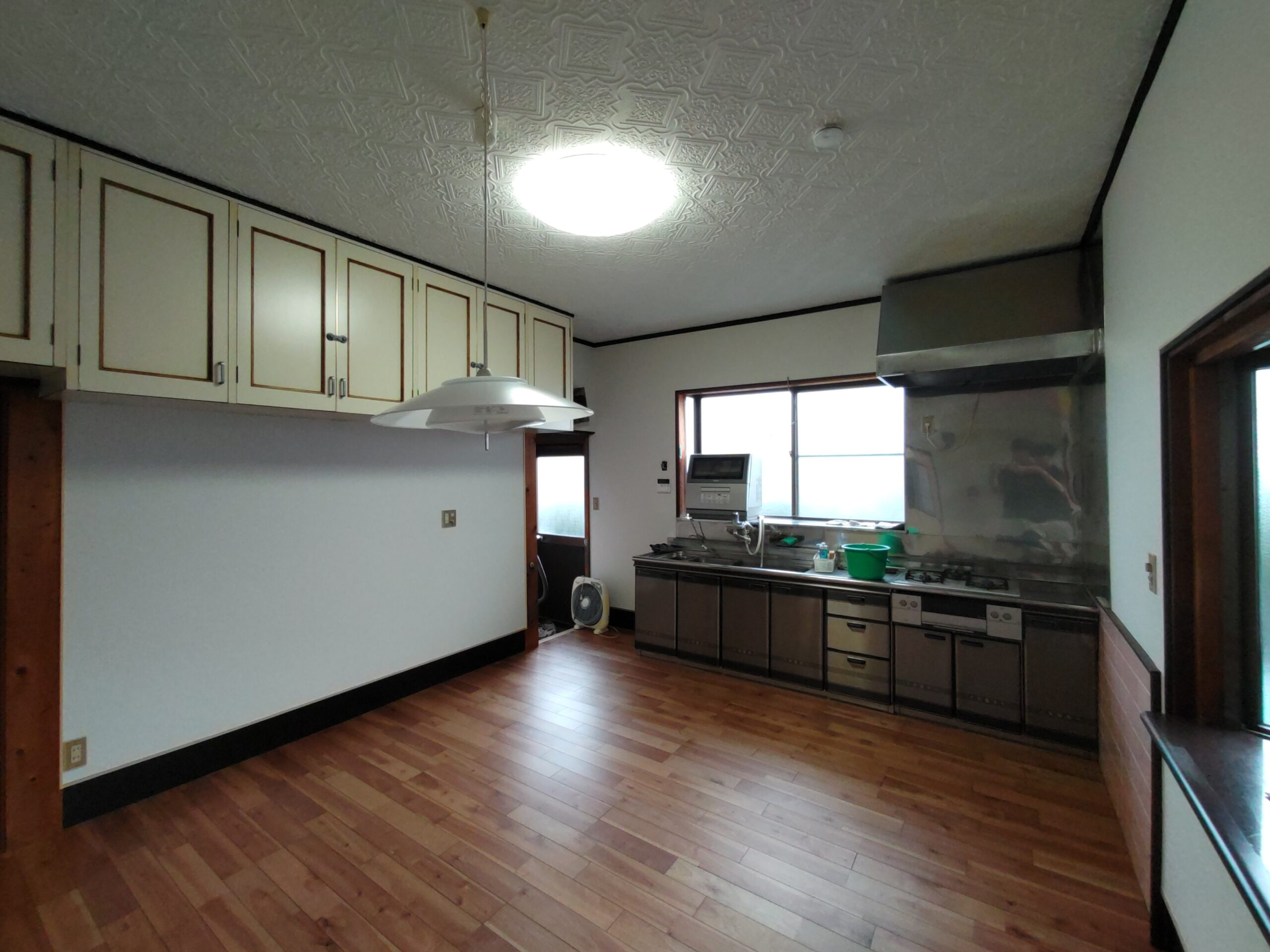 クロス施工後に新規照明器具の取付、クロスのために取り外していた分電盤等やスイッチプレートなどを取付けて、約1週間にわたった真夏のリフォームも完了です。h場さんに手伝ってもらって、床施工のために移動していた冷蔵庫なども元の位置に戻しました。