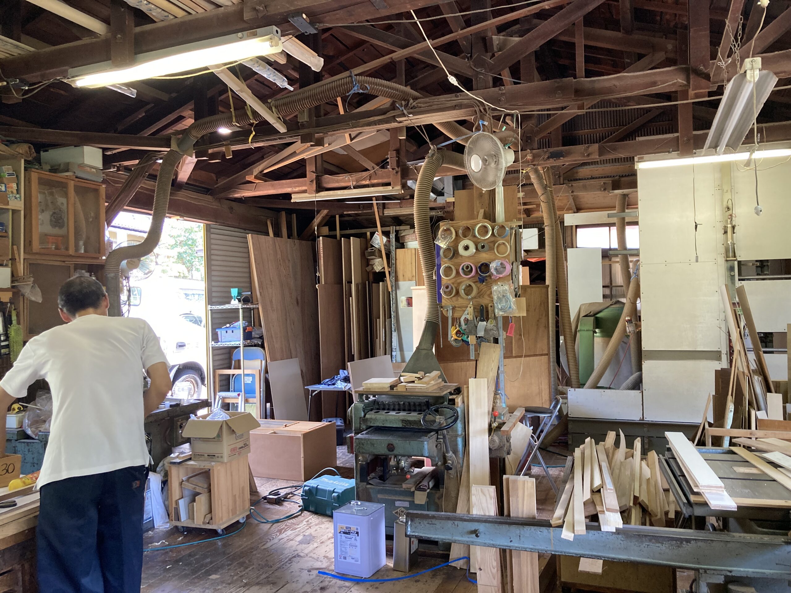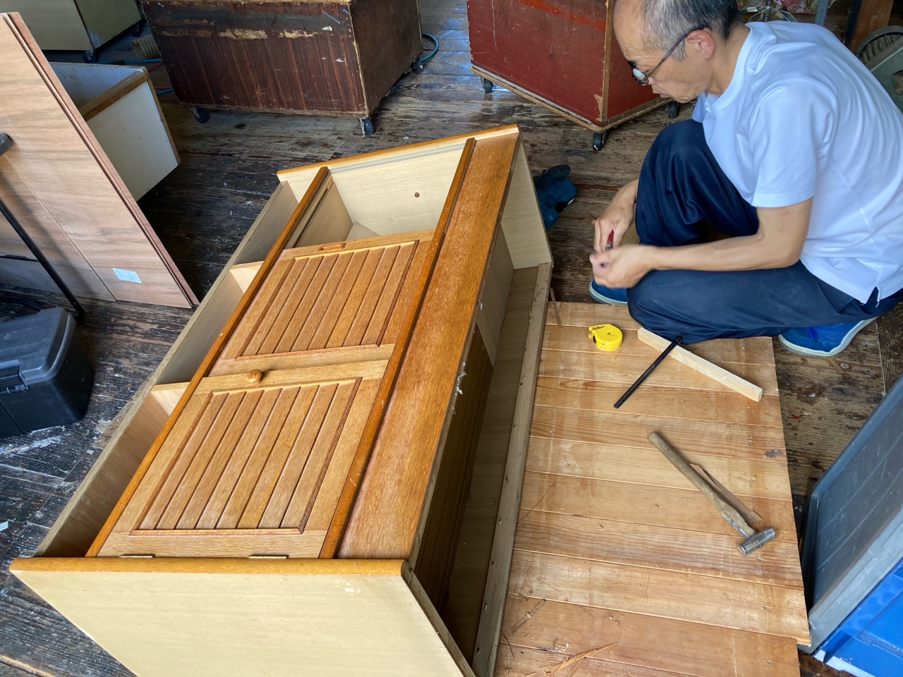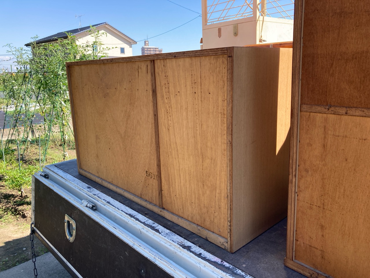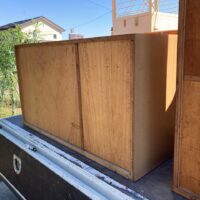 吊戸棚下の高さ寸法めいっぱいに納められていた食器棚は、床の嵩上げを想定すると3㎝ほど入らなくなるので、棚の足元をカットするべく、トラックに載せてf二木工所の工場まで運んできました。板の芯があらわれる寸法までカットしますのでおよそ7㎝の縮小。十分に余裕をもって収める事ができそうです。