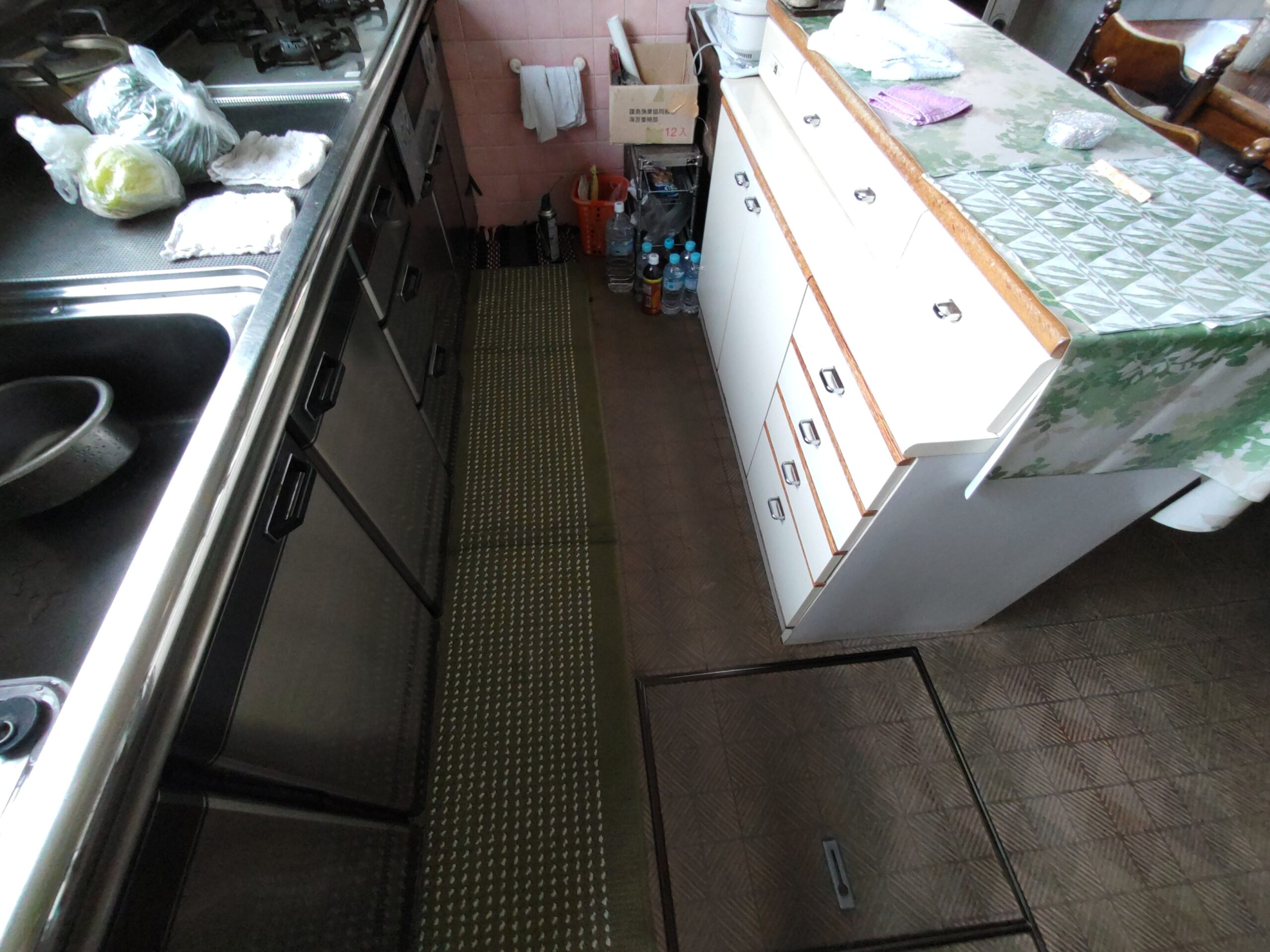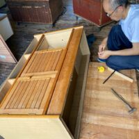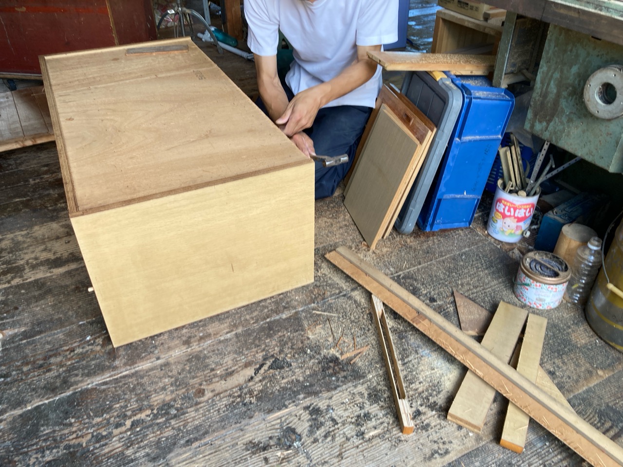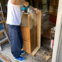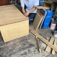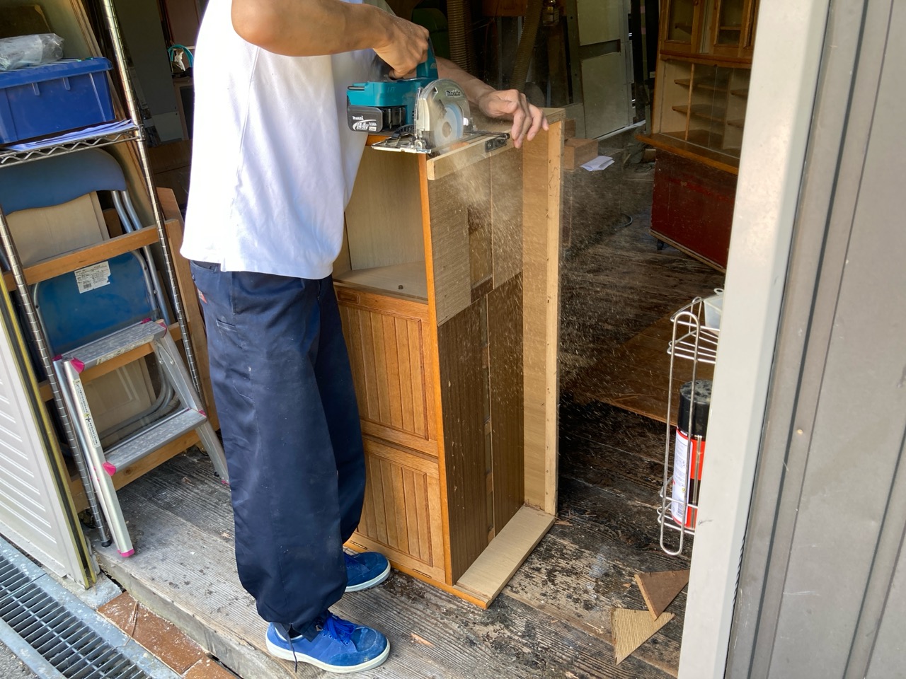 吊戸棚下の高さ寸法めいっぱいに納められていた食器棚は、床の嵩上げを想定すると3㎝ほど入らなくなるので、棚の足元をカットするべく、トラックに載せてf二木工所の工場まで運んできました。板の芯があらわれる寸法までカットしますのでおよそ7㎝の縮小。十分に余裕をもって収める事ができそうです。
