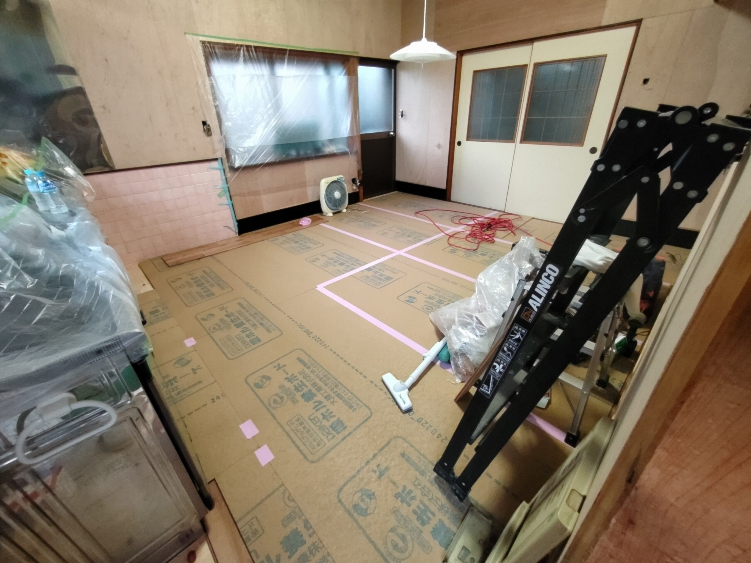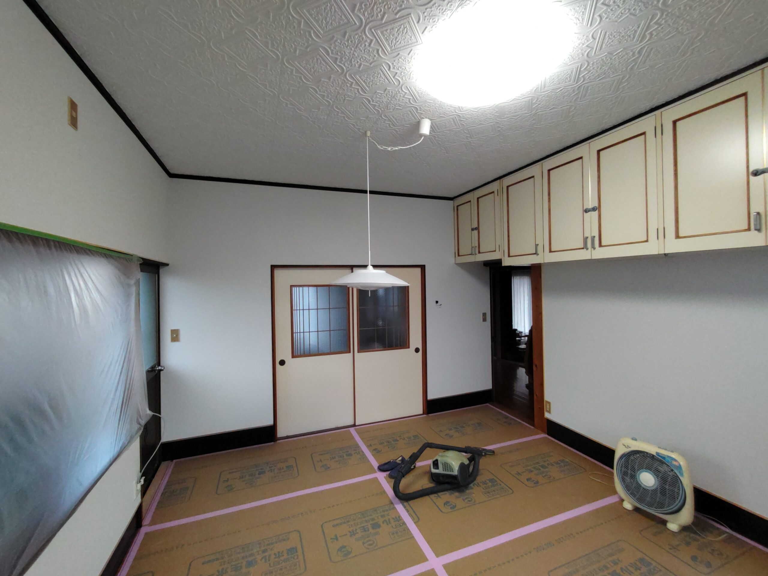 壁クロス貼工事が完了。床に敷いていた養生を引っぺがしにやって来ました。10帖大の部屋ですので養生はがしもあっという間に完了。工事のホコリを掃除機で吸っている時は絶妙な爽快感が味わえます。この後照明器具を取付けて、家具家電を戻せば完了です。
