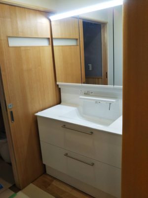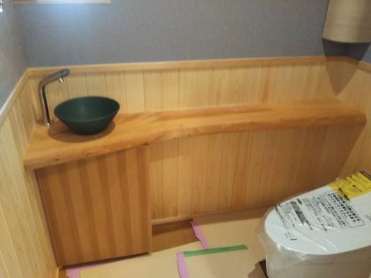 洗面台・トイレなどの水回りが設置されました。コロナウイルスの関係で納品が遅れていましたが無事間に合いました。
