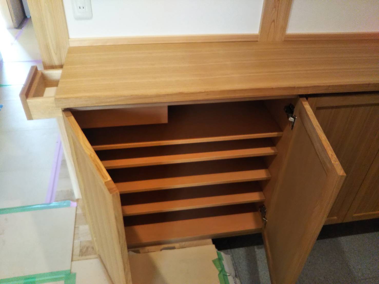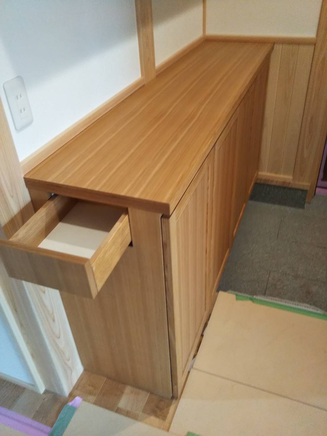 製作家具の下駄箱は鍵や印鑑など、ちょっとしたものを収納できる引き出し付きです。