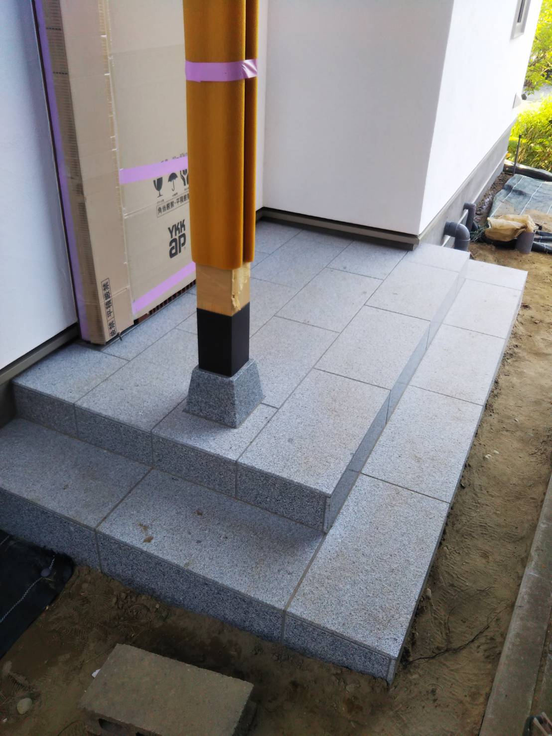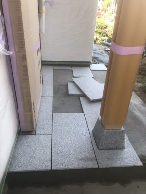 玄関ポーチは御影石の施工も完了し、柱はまだ養生で守られていますが、柱巻きが取り付けられました。