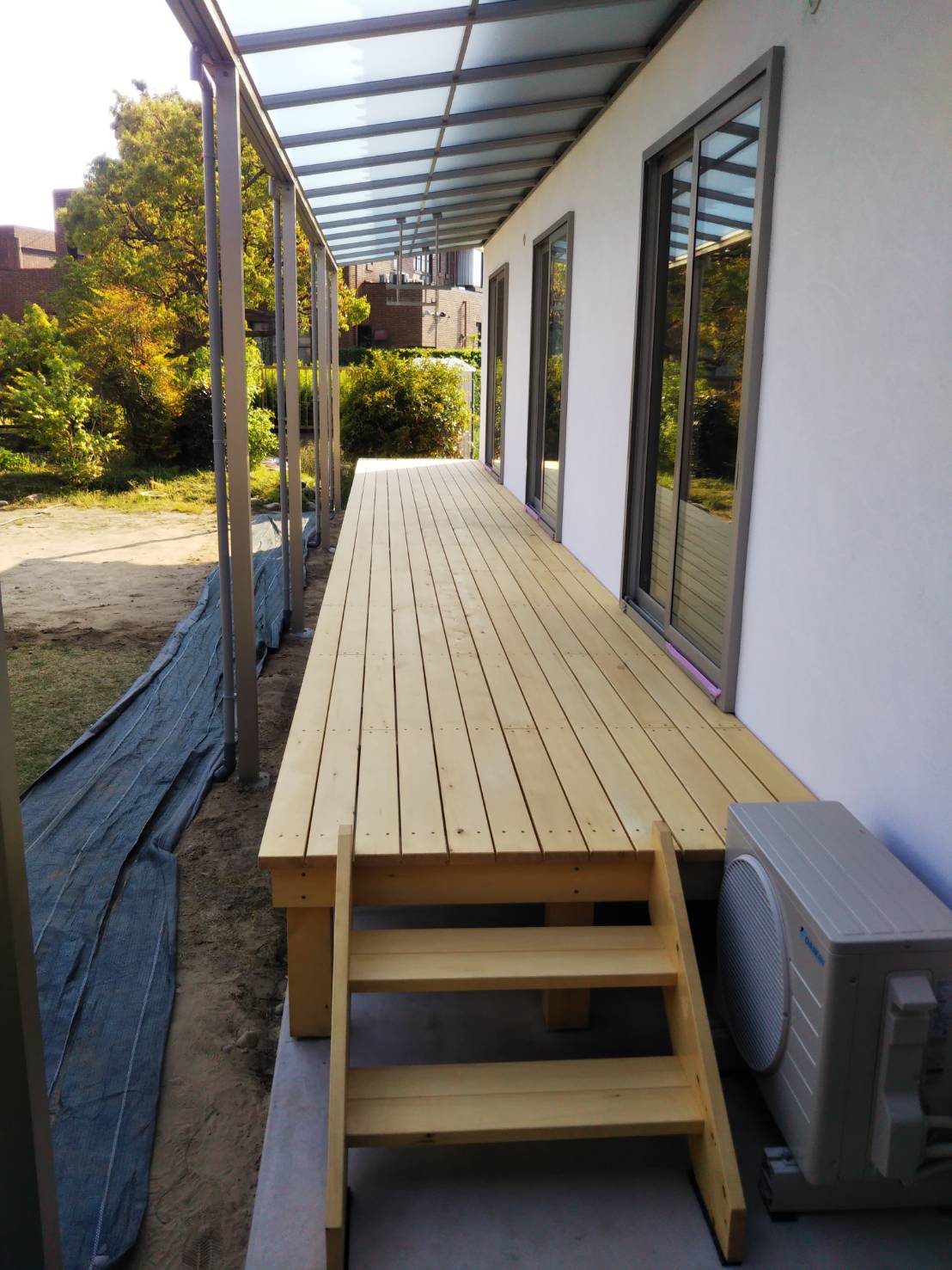 外部にはウッドデッキが取り付けられました。素材は雨に強い米ヒバです。