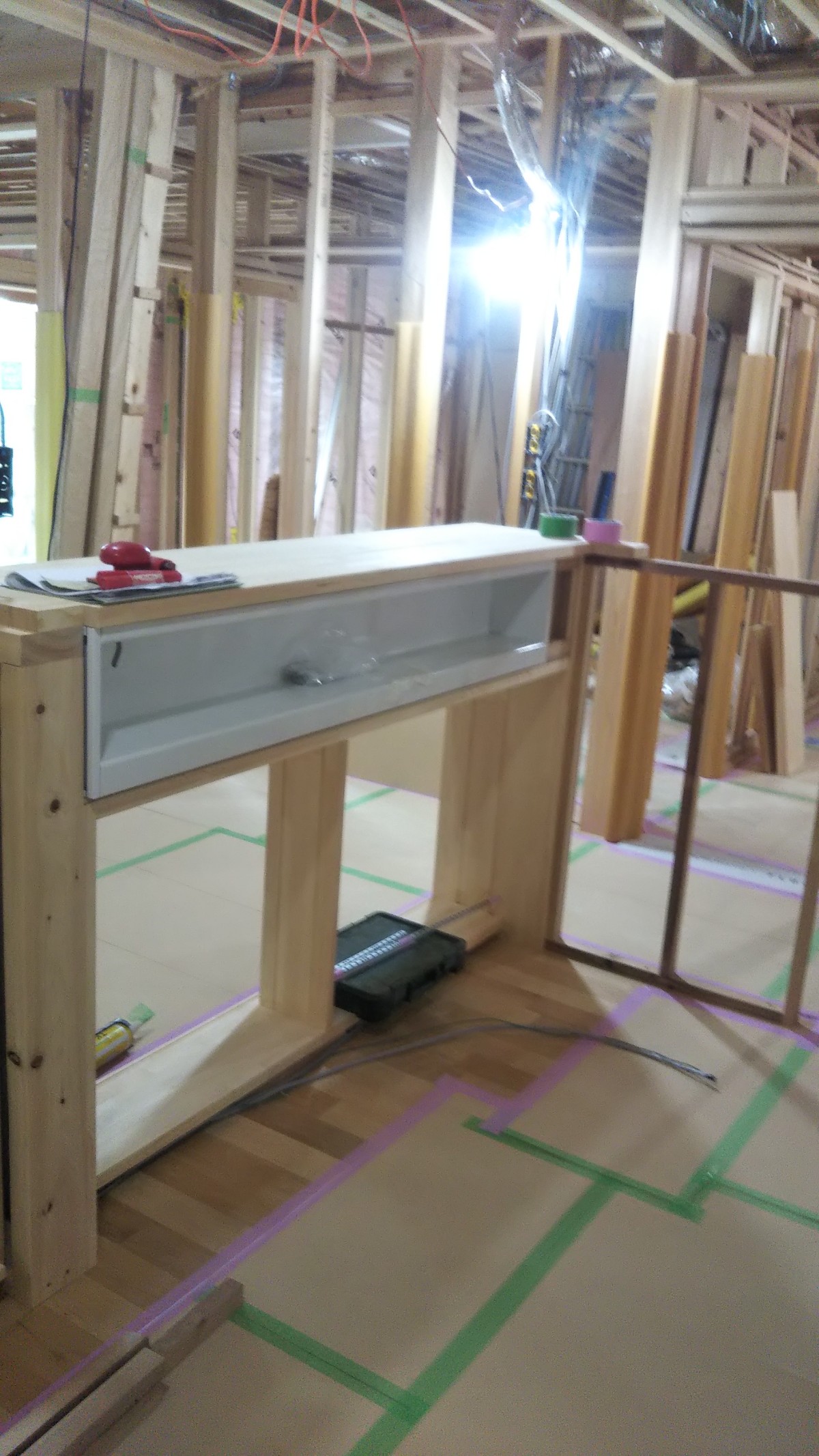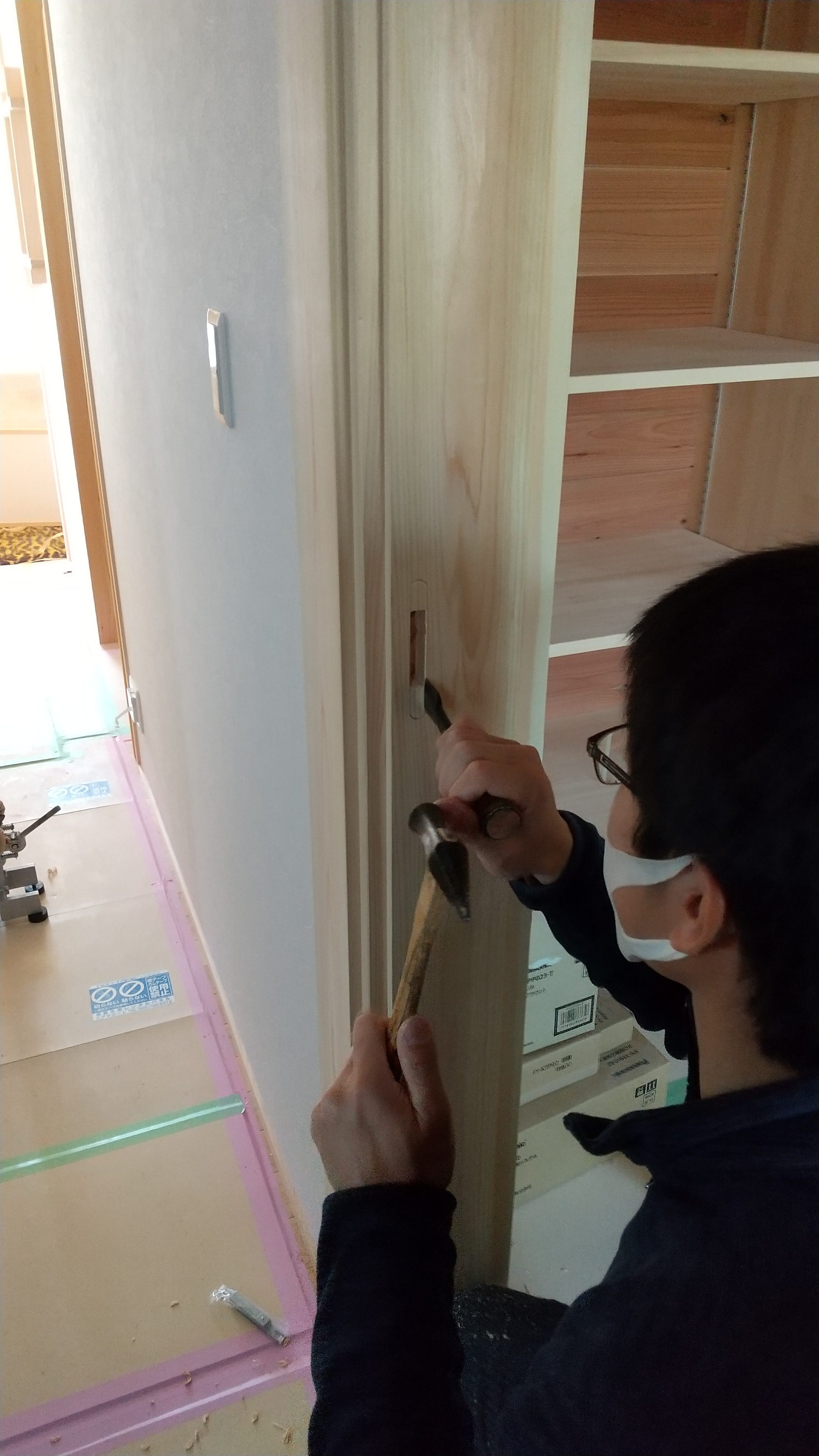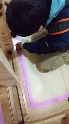 後ほどここには建具の敷居レールが入ので、予めフローリングに溝をついておきます。