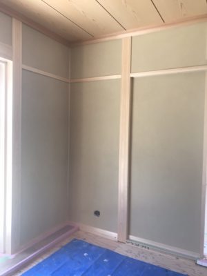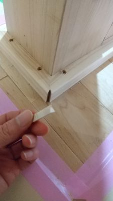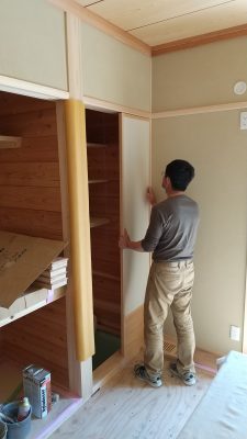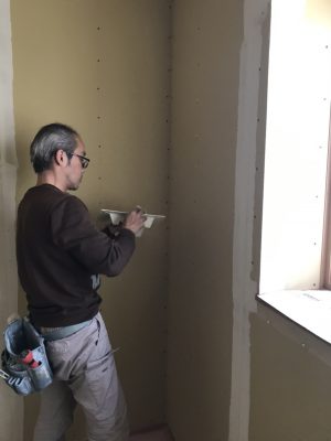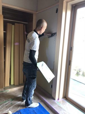 クロス屋さんがパテ埋めをしています。クロスを貼った後凹凸が出ないよう、くぎを打ったところを一か所づつ丁寧に埋めていきます。