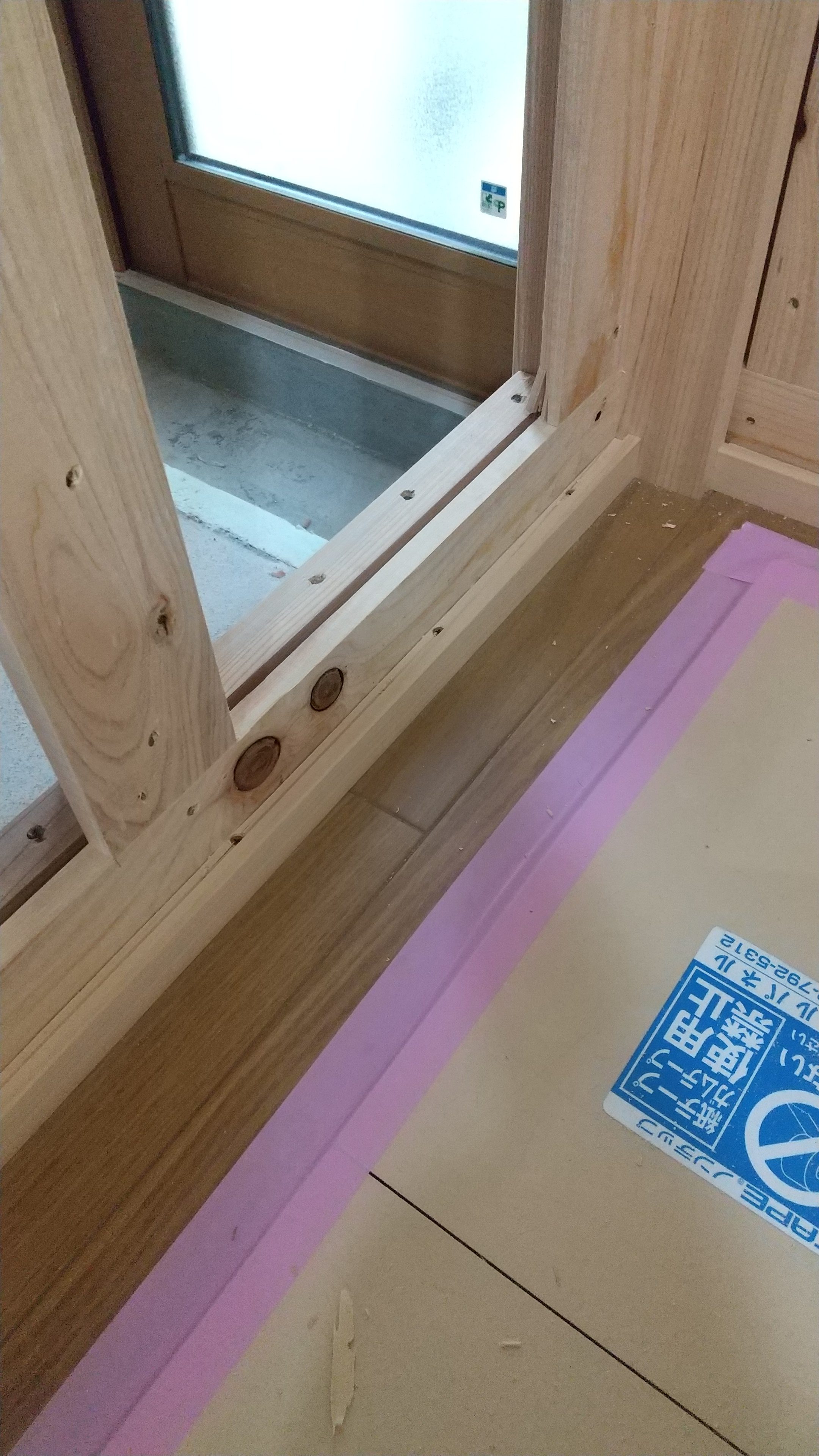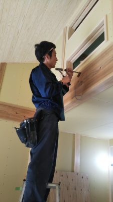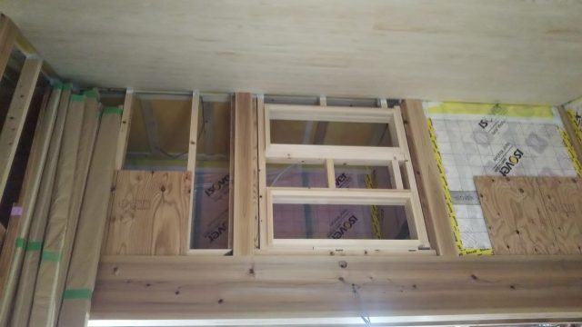室内内倒し窓枠加工と下地取付をしています。