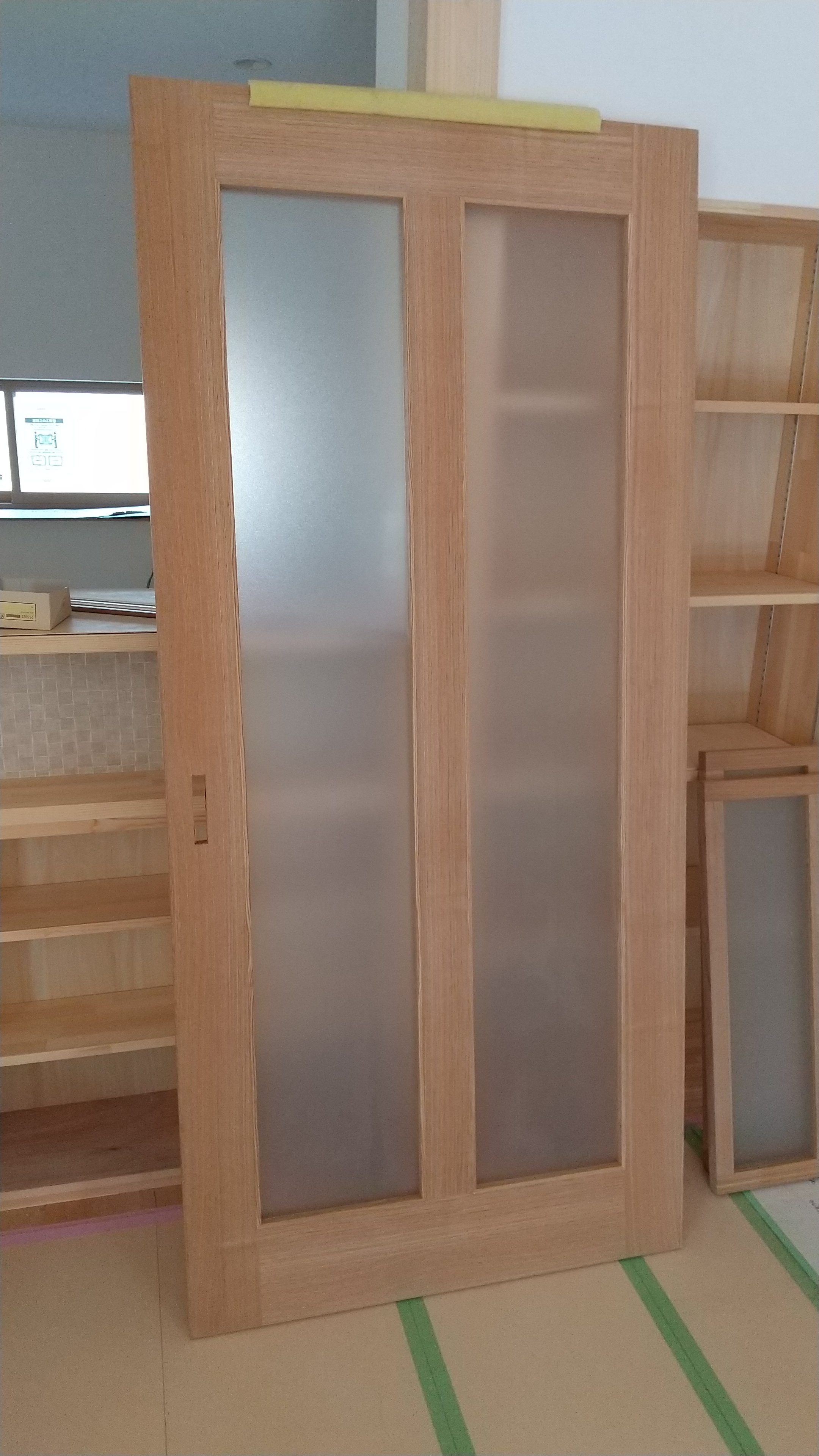 タモ材の突板を使った建具は框戸に見えるよう張り合わせています。
