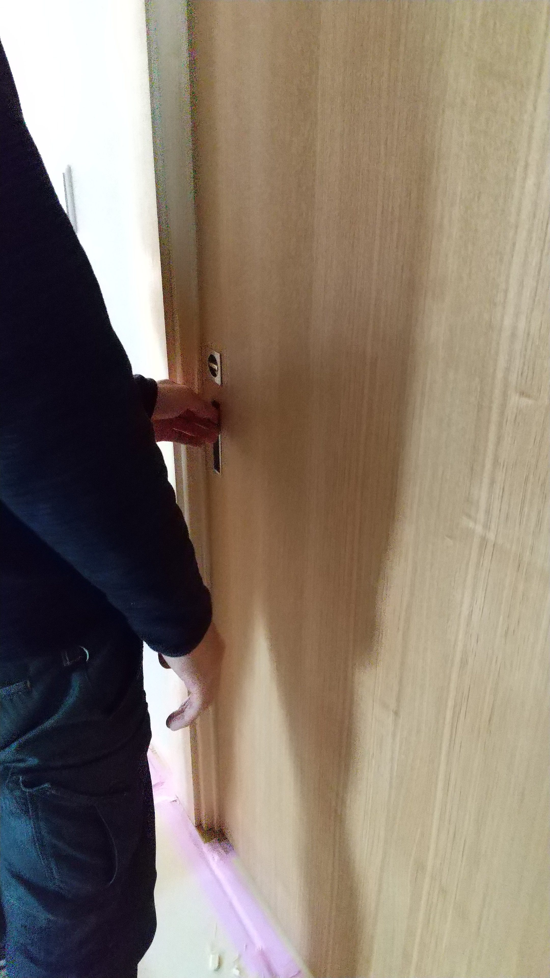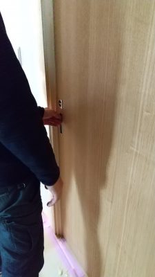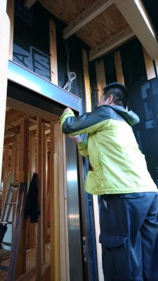 サッシ屋さんが玄関戸の電気錠の配線中です。