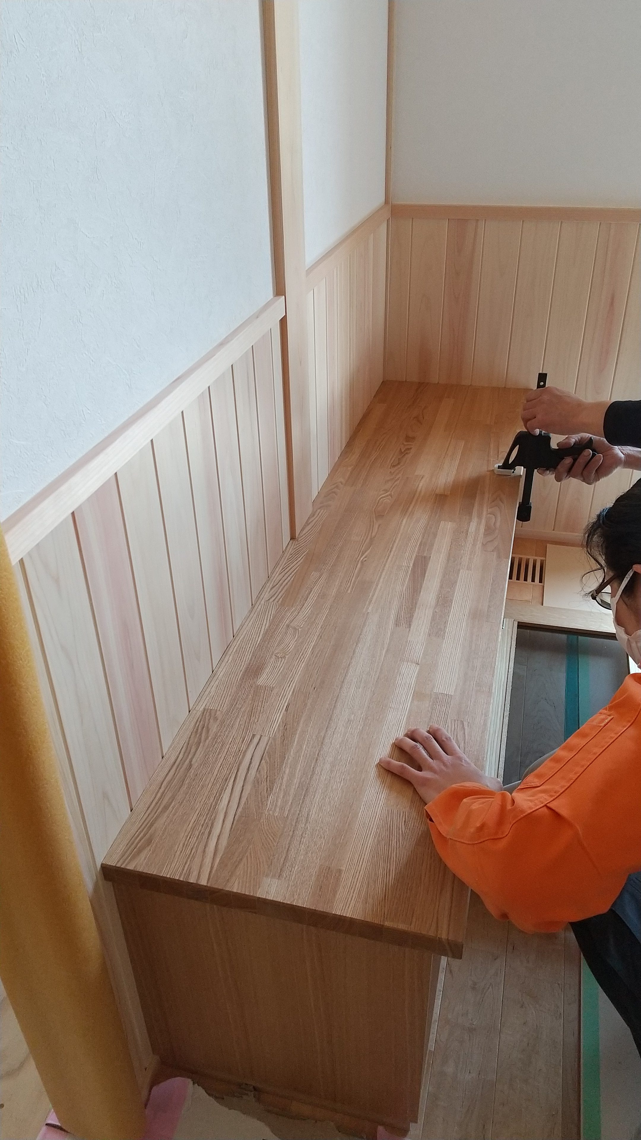 柱が出ている真壁に合わせて天板を切り欠き、ぴったり収まるよう調整していきます。