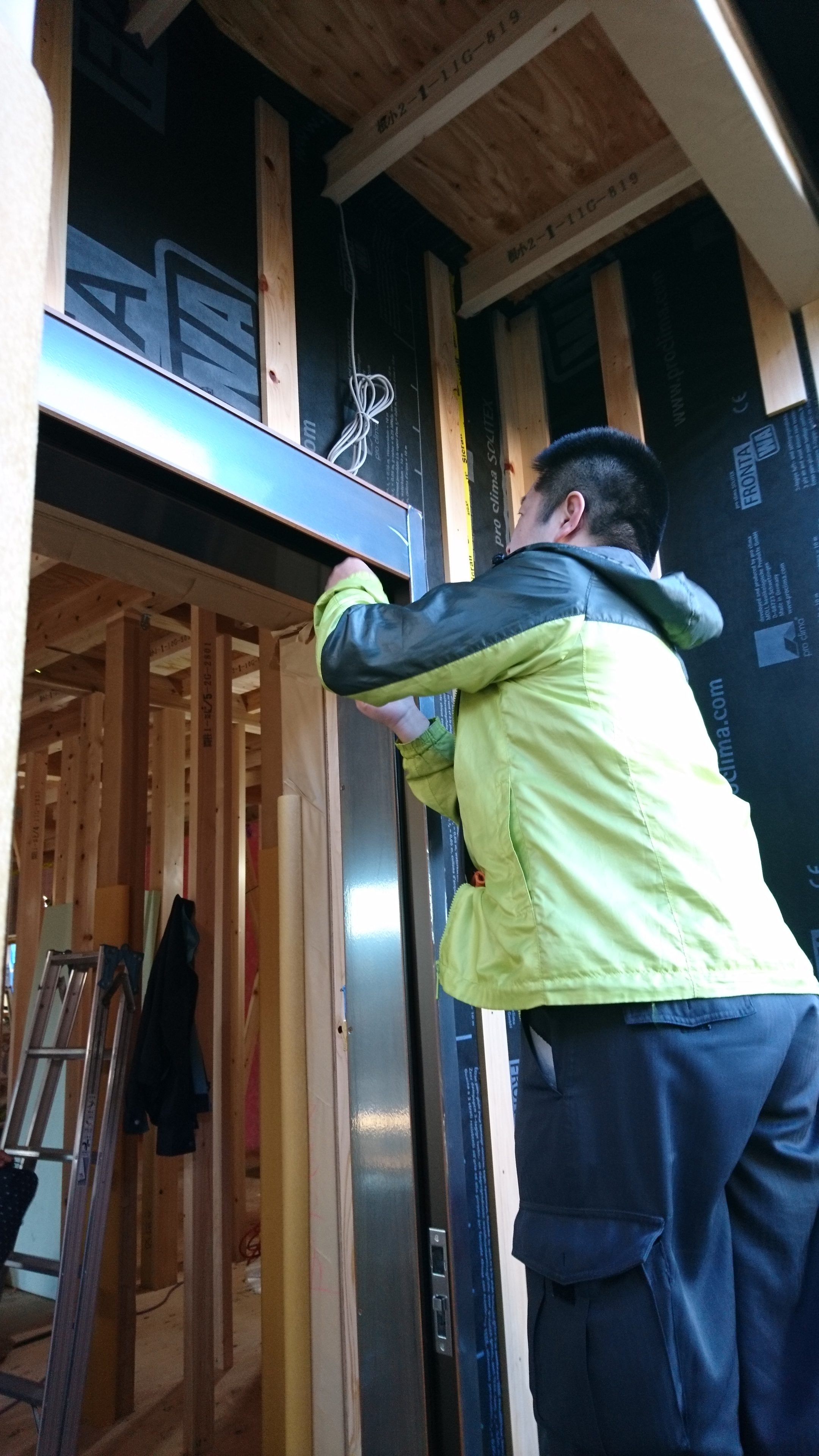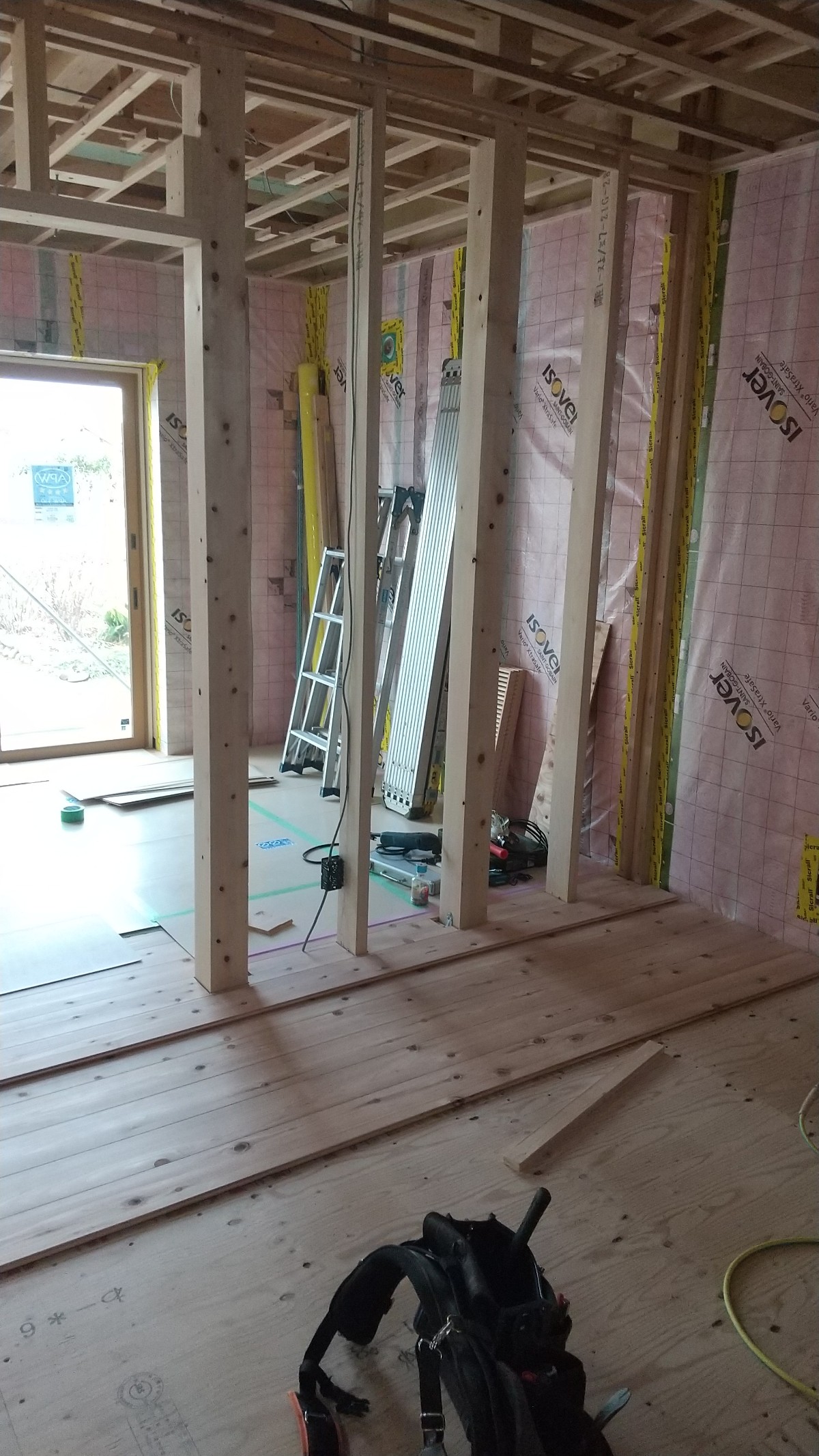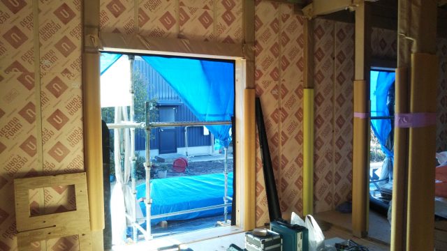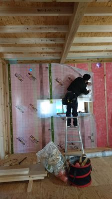 室内側のグラスウール充填後、気密シートを貼っていきます。