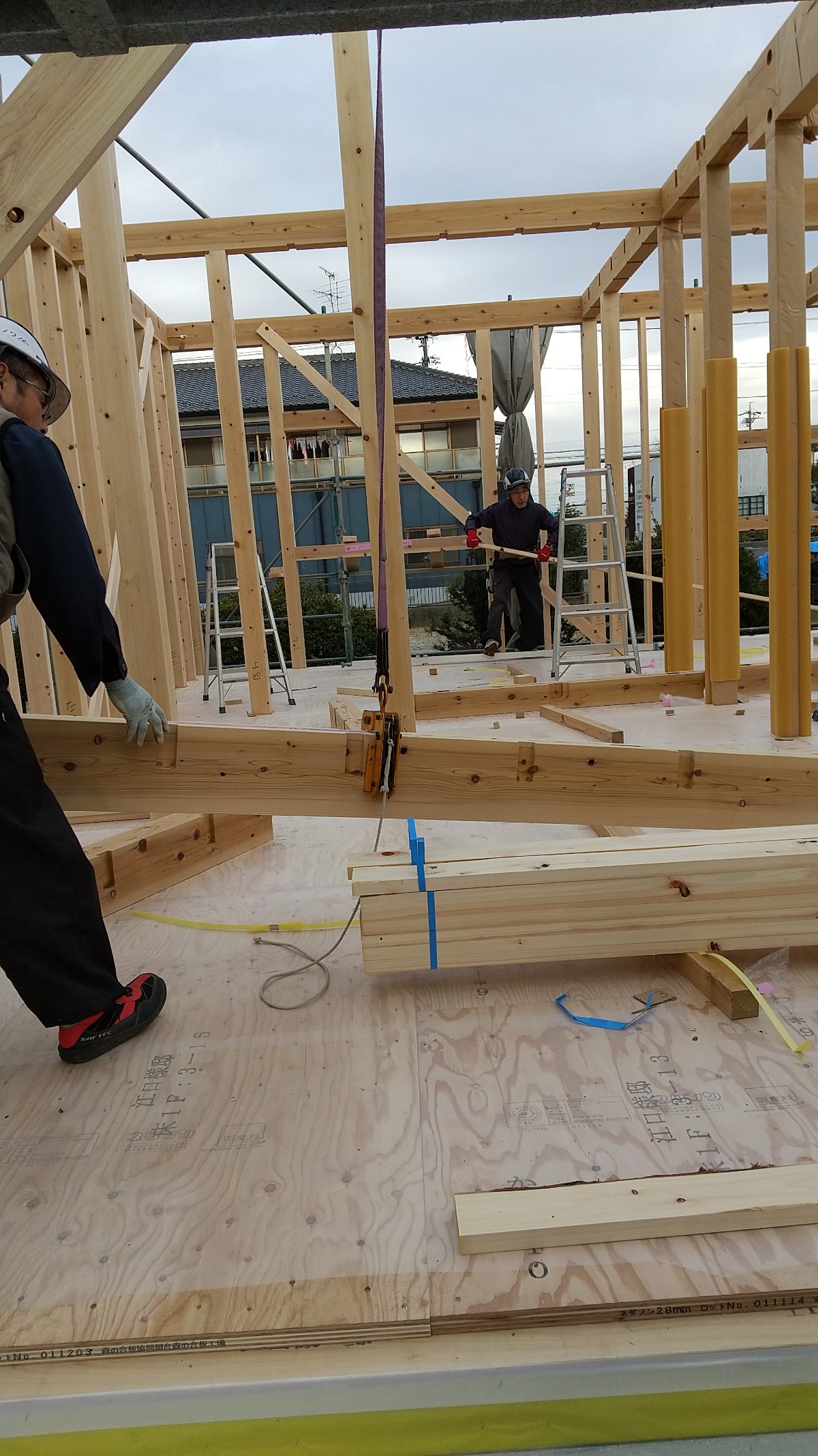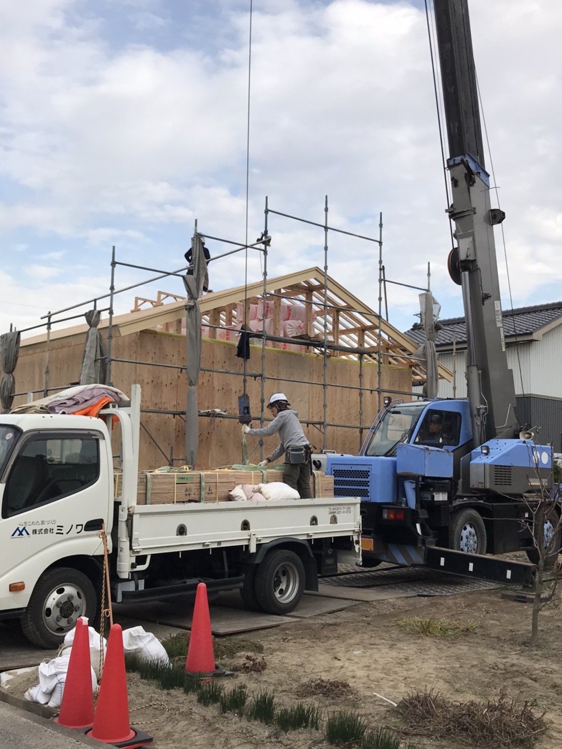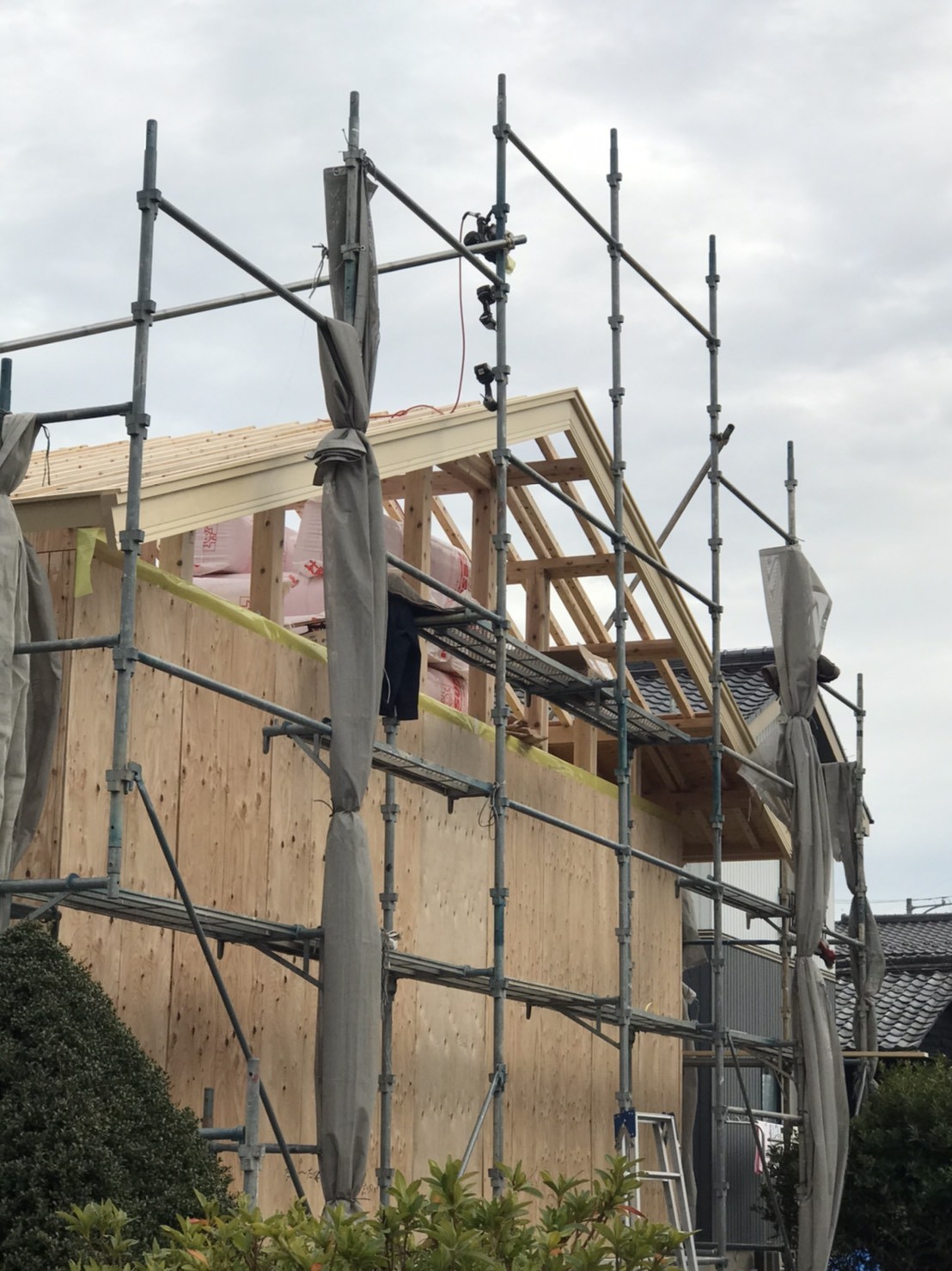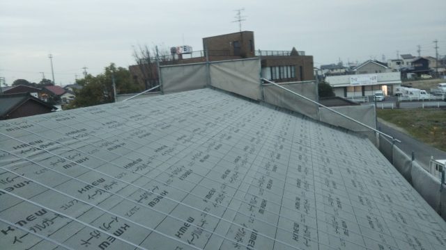 曇り空でしたが、雨に降られることなく無事ルーフィング敷まで完了しました。