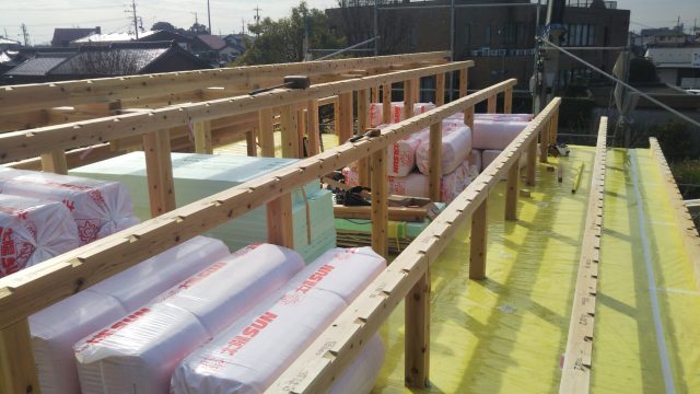 屋根、天井の断熱材もこの日に搬入します。