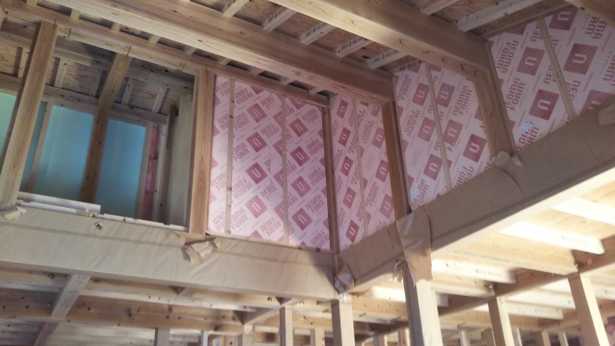 平天井・勾配天井の境の壁には片側にミラフォームt=50mm、反対側(勾配側)にネオマフォームt=80充填します。(大壁の場合は柱いっぱいにt=120のグラスウールを充填します。)