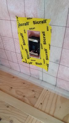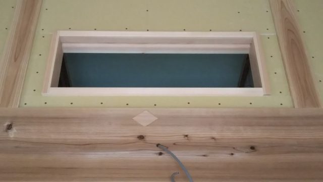 小屋裏エアコンの吸排気用枠施工。ここにガラリを付けます。