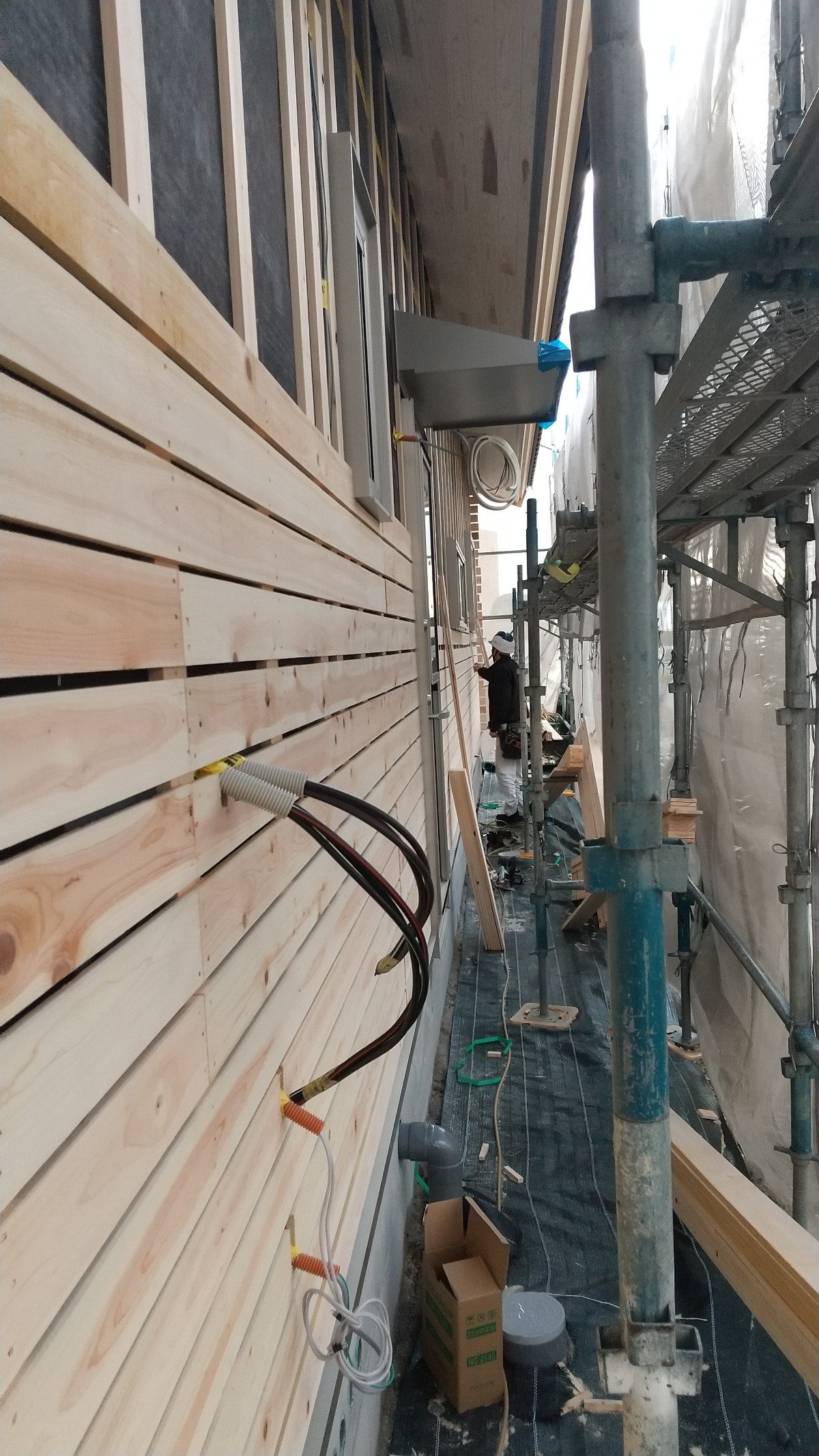 外部は漆喰仕上げのため、下地には桧の野地板を張ります。