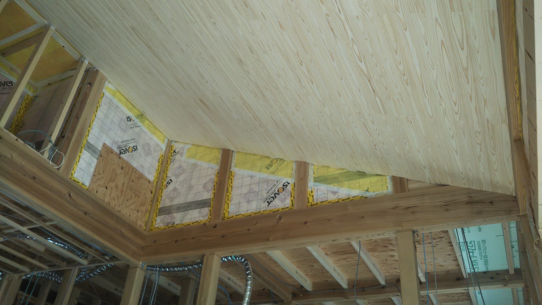 リビング天井に杉が張られました。