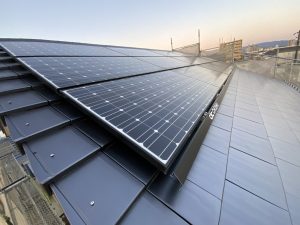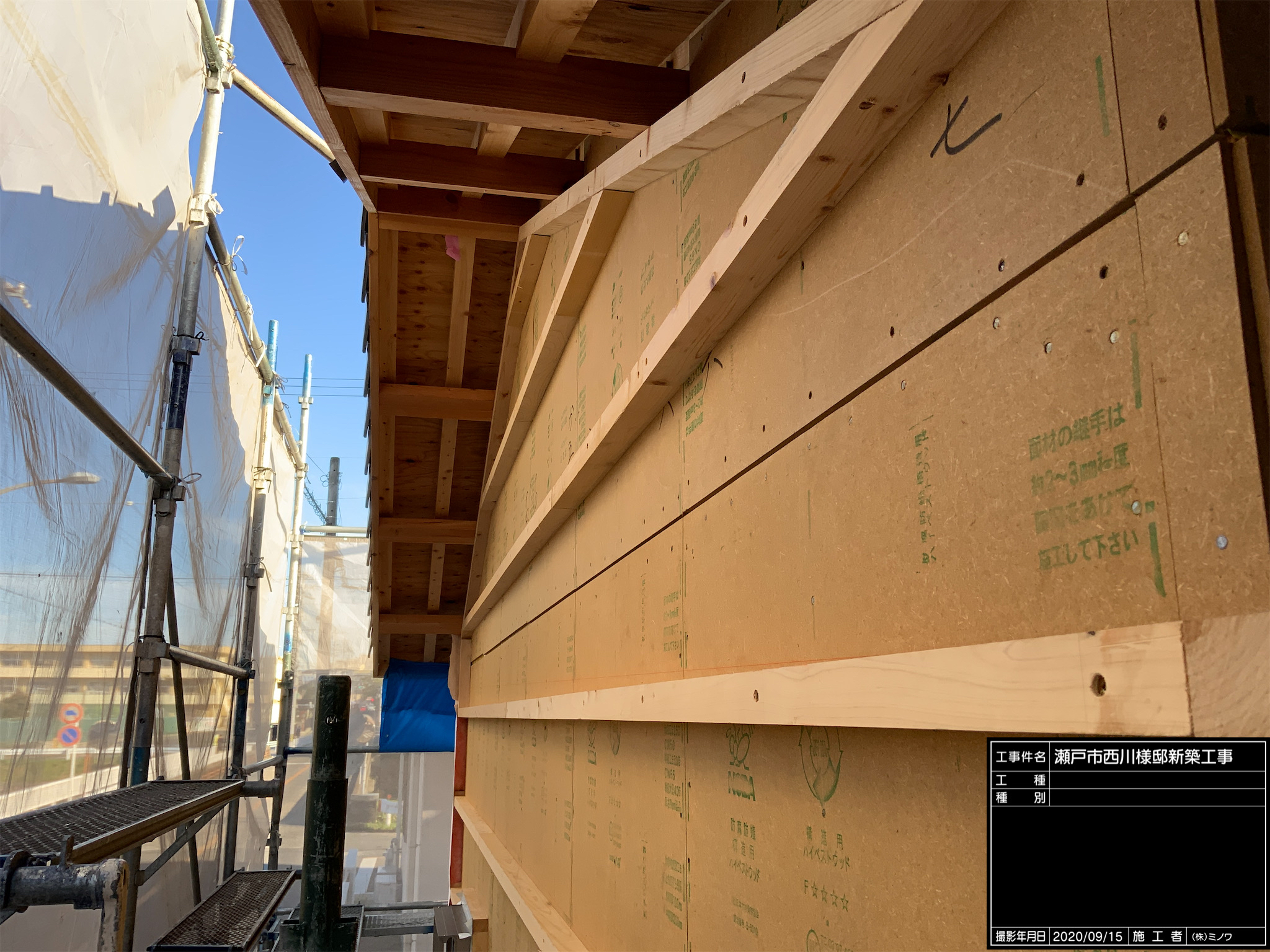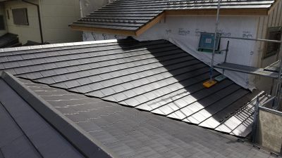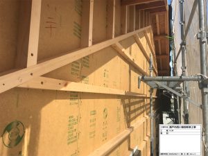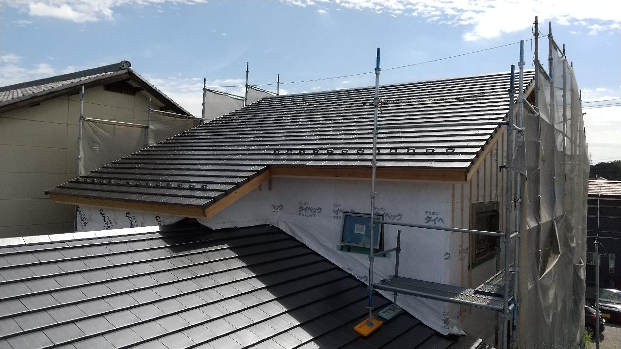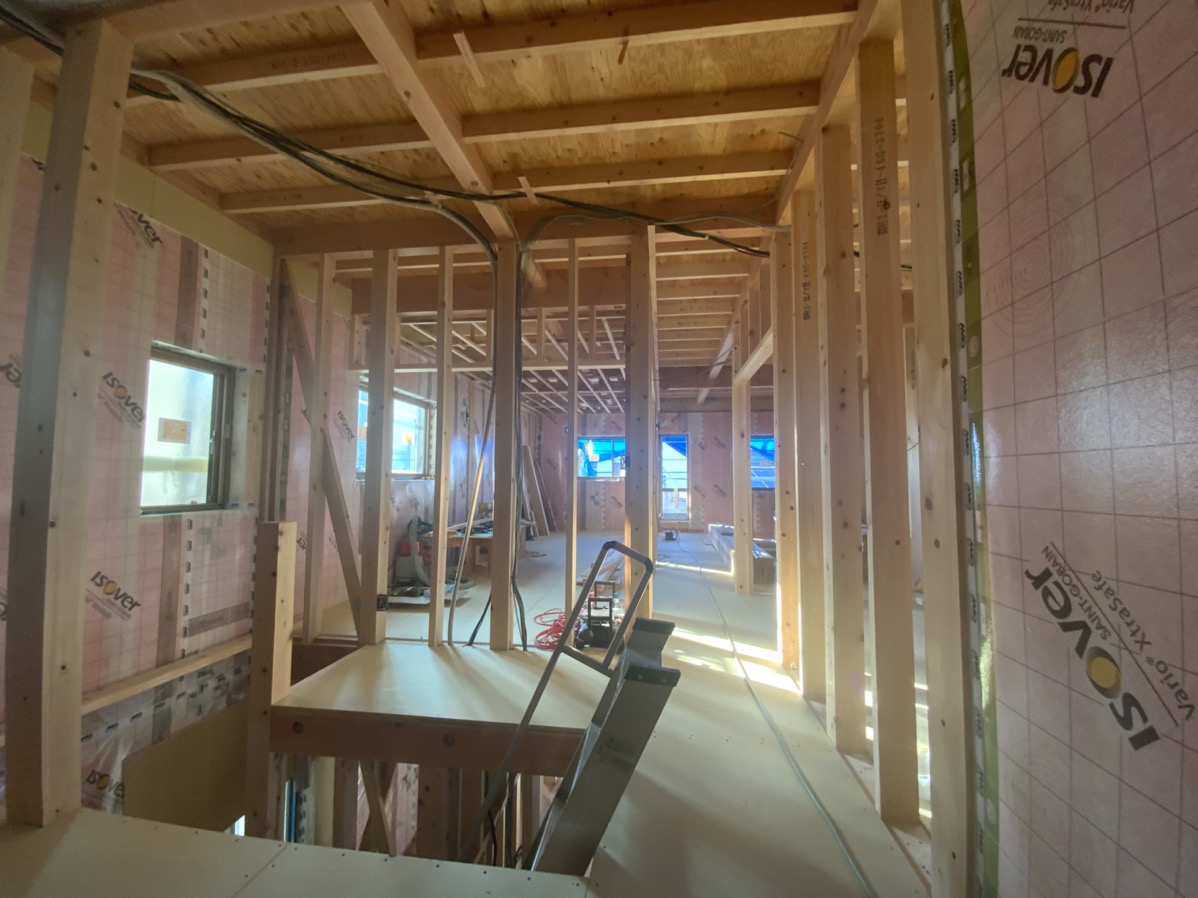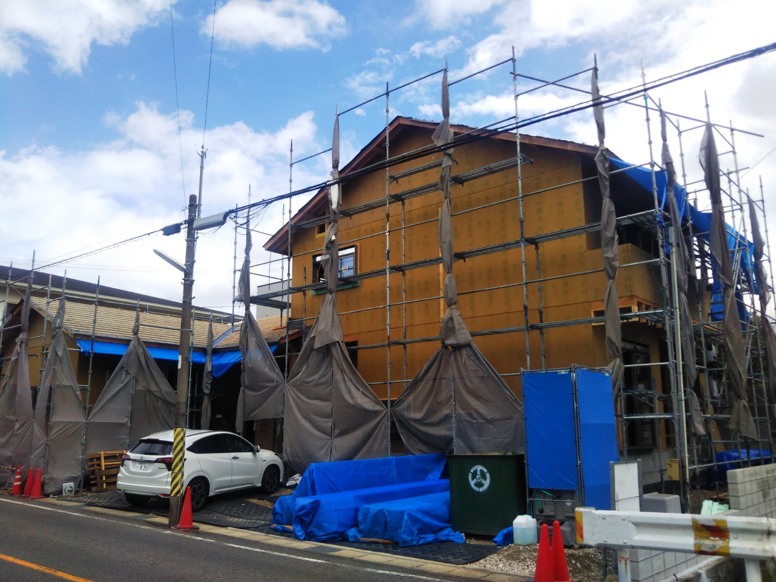 外部は断熱(高性能グラスウールt=55)用の下地が進んでいます。屋根工事も完了しました。瓦は平板フラット瓦です。