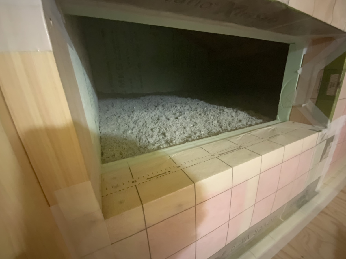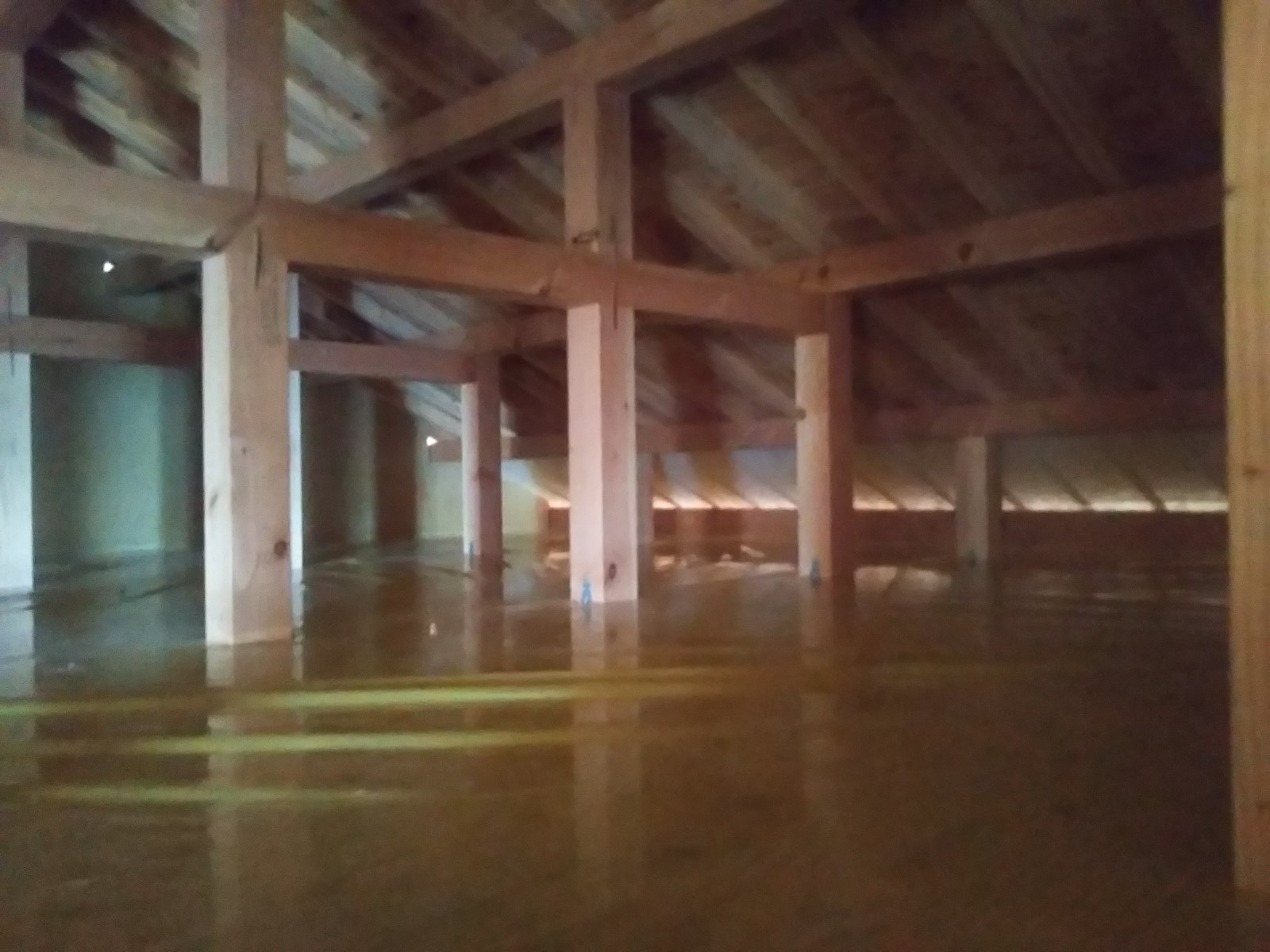 平天井部分は小屋裏に300mmほど敷き詰められ、勾配天井部分は高密度の不織布の上に充填されます。