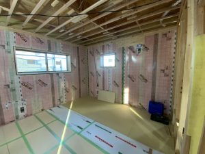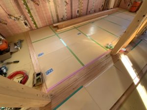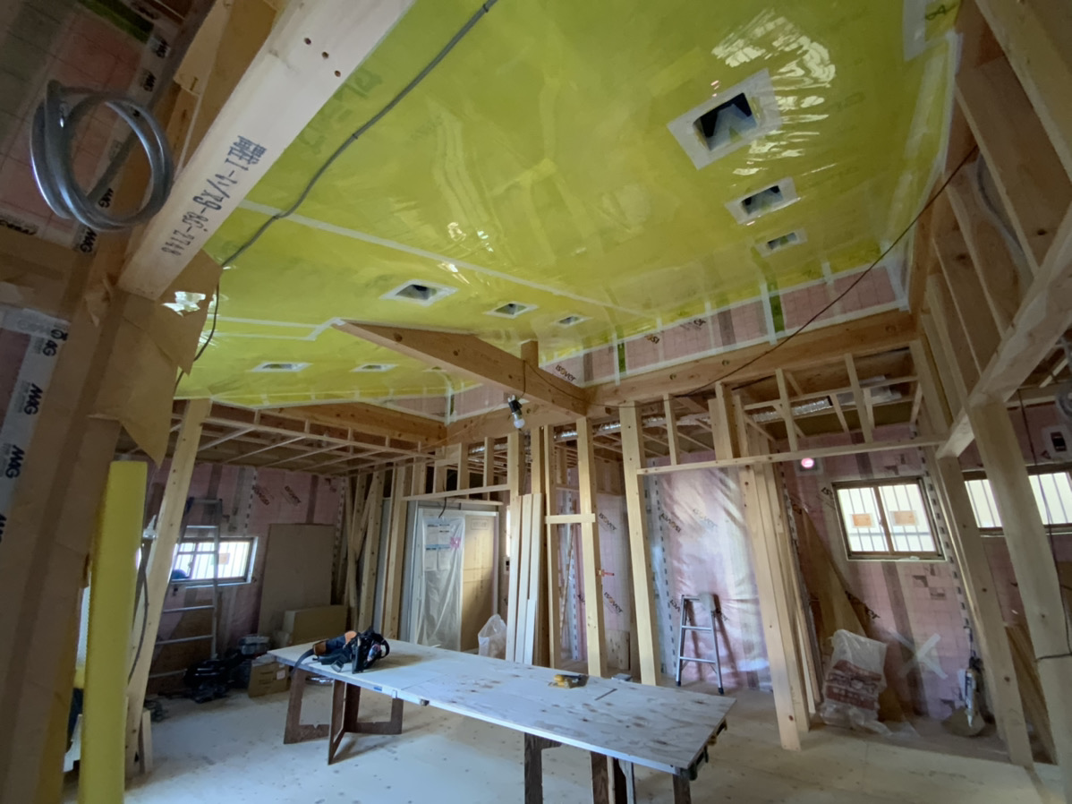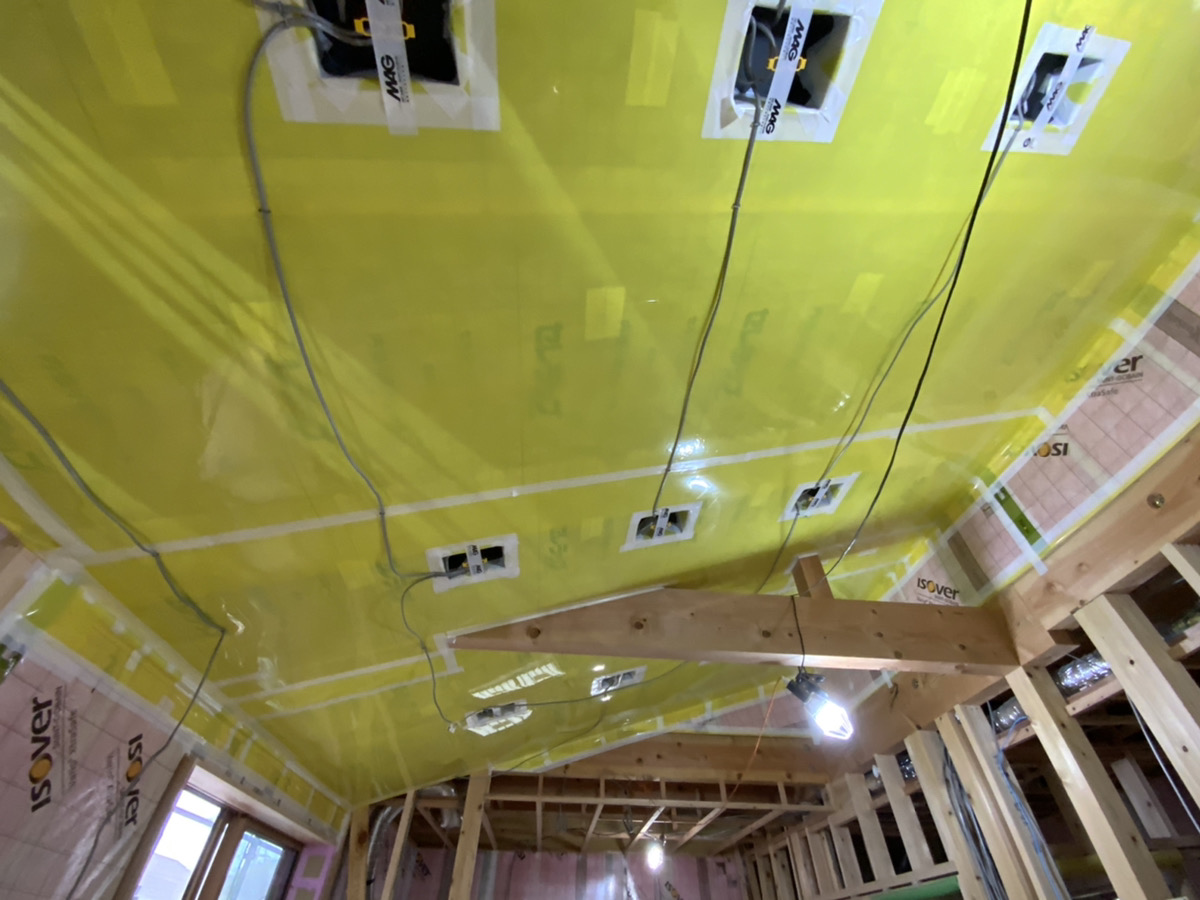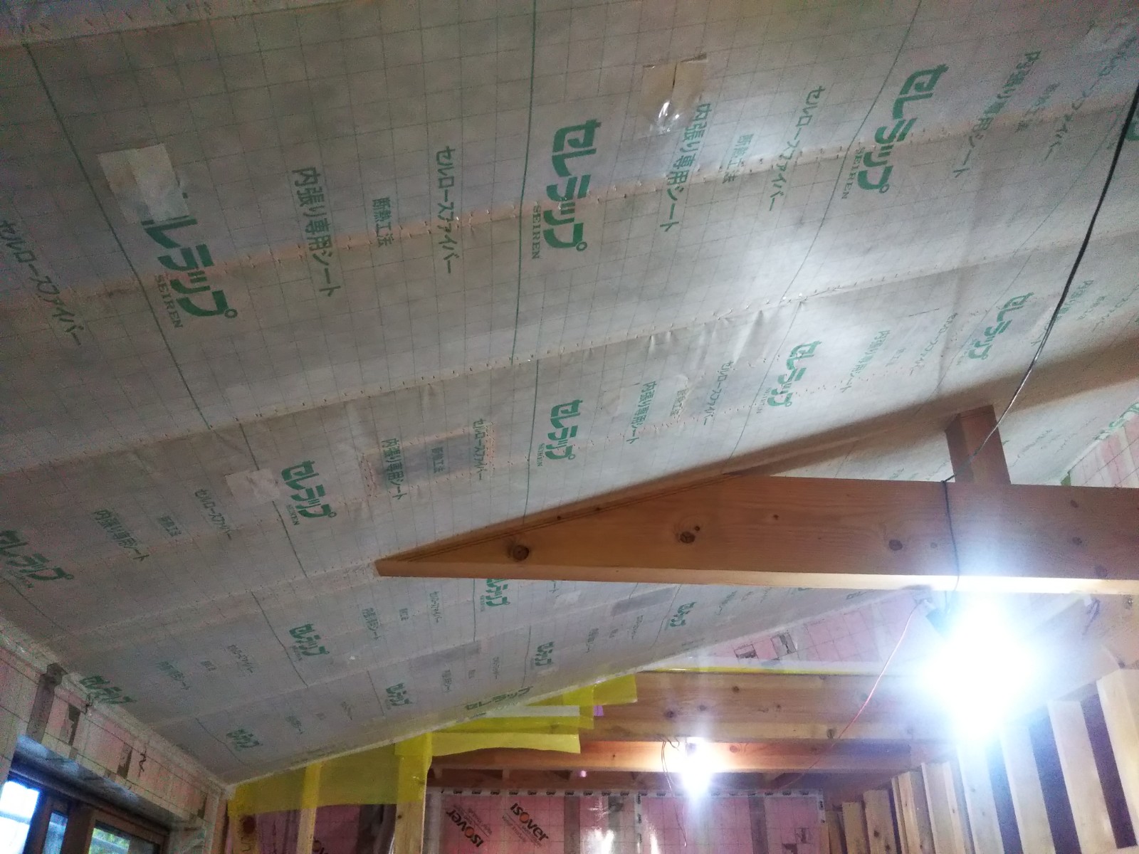 セルロースファイバー充填後、気密シート貼りが完了しました。