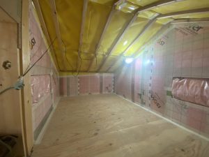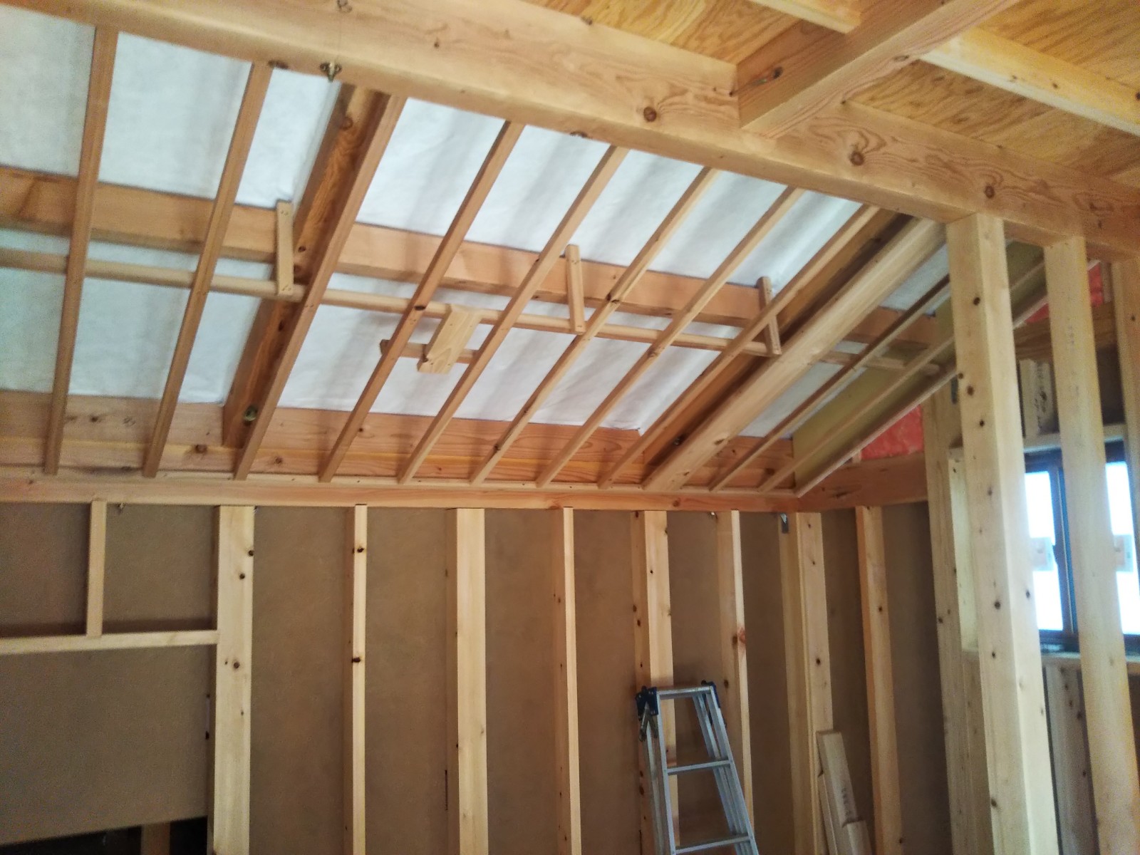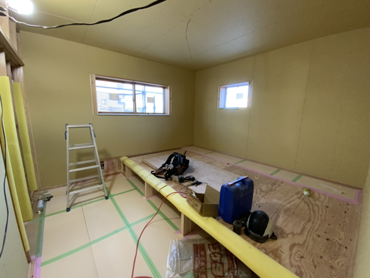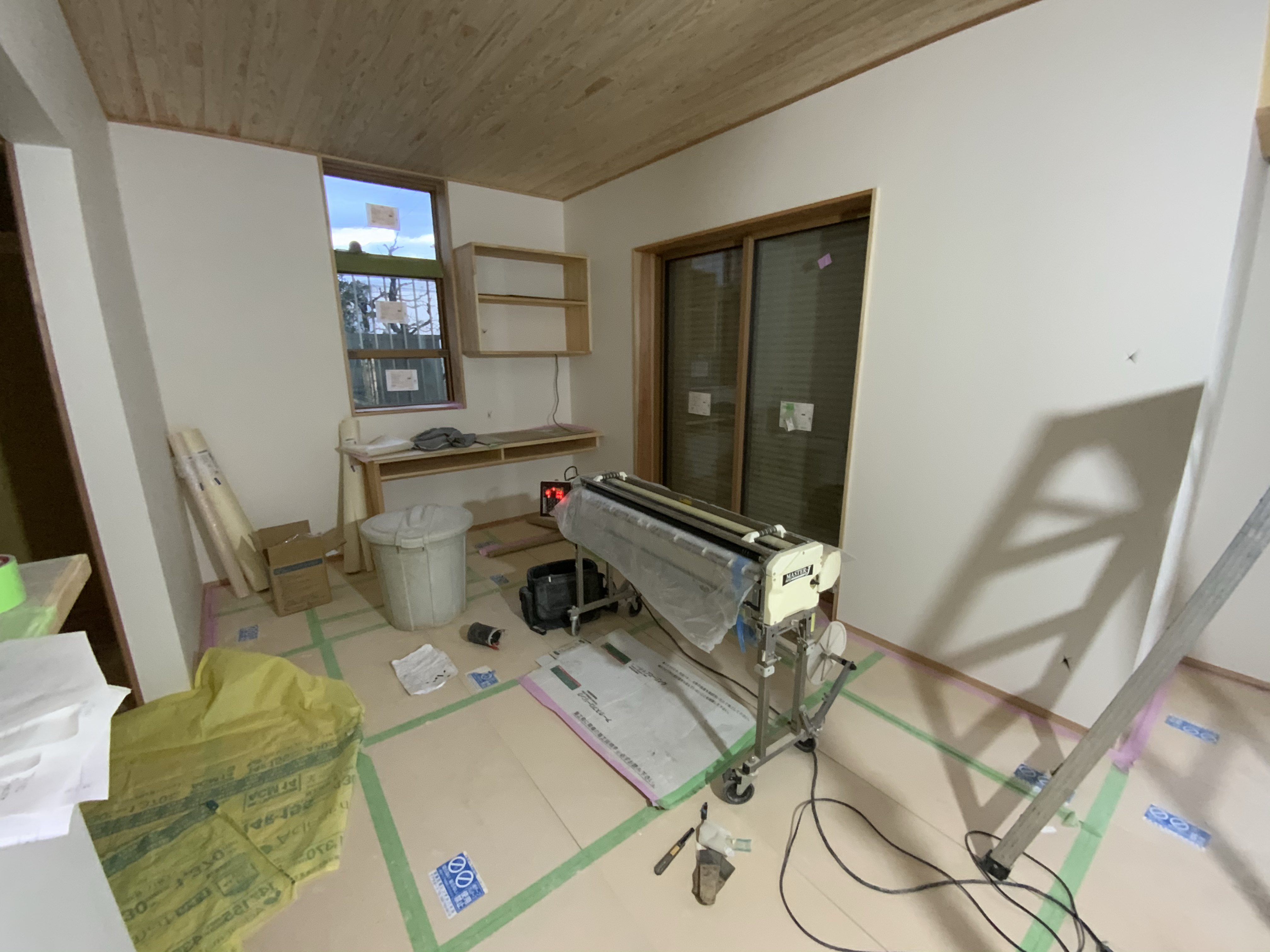 セルロースファイバー充填後、気密シート貼りが完了しました。