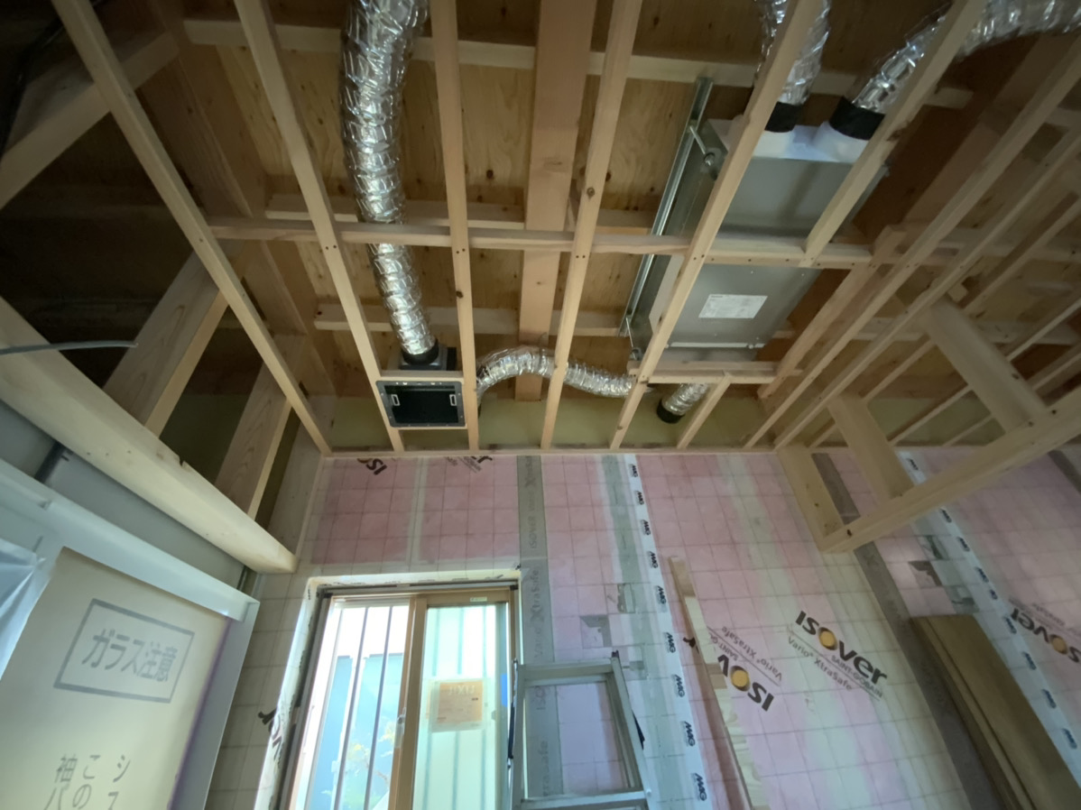 天井に見える機械は熱交換器です。ダクトで各居室へムラの無い空気を送ります。