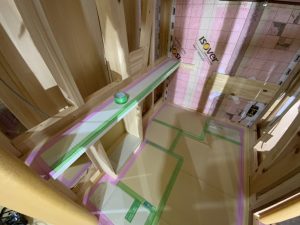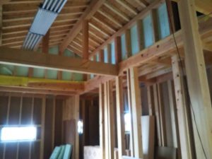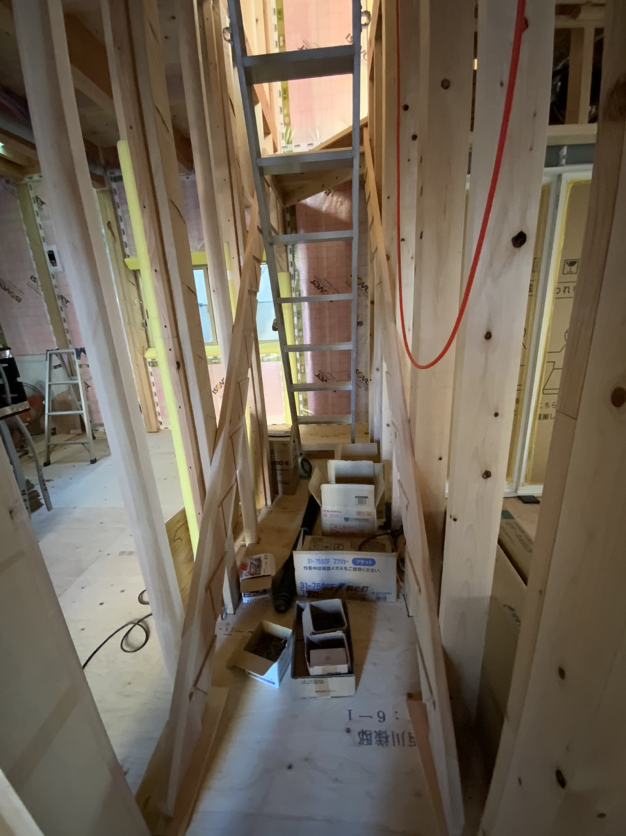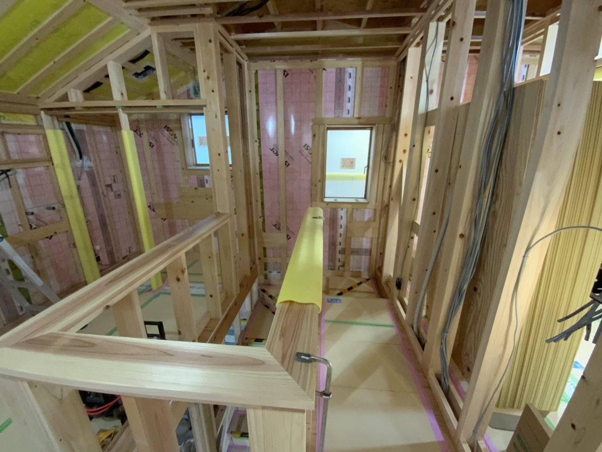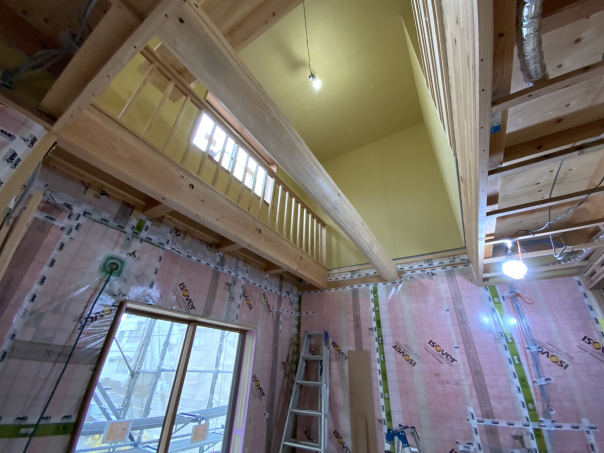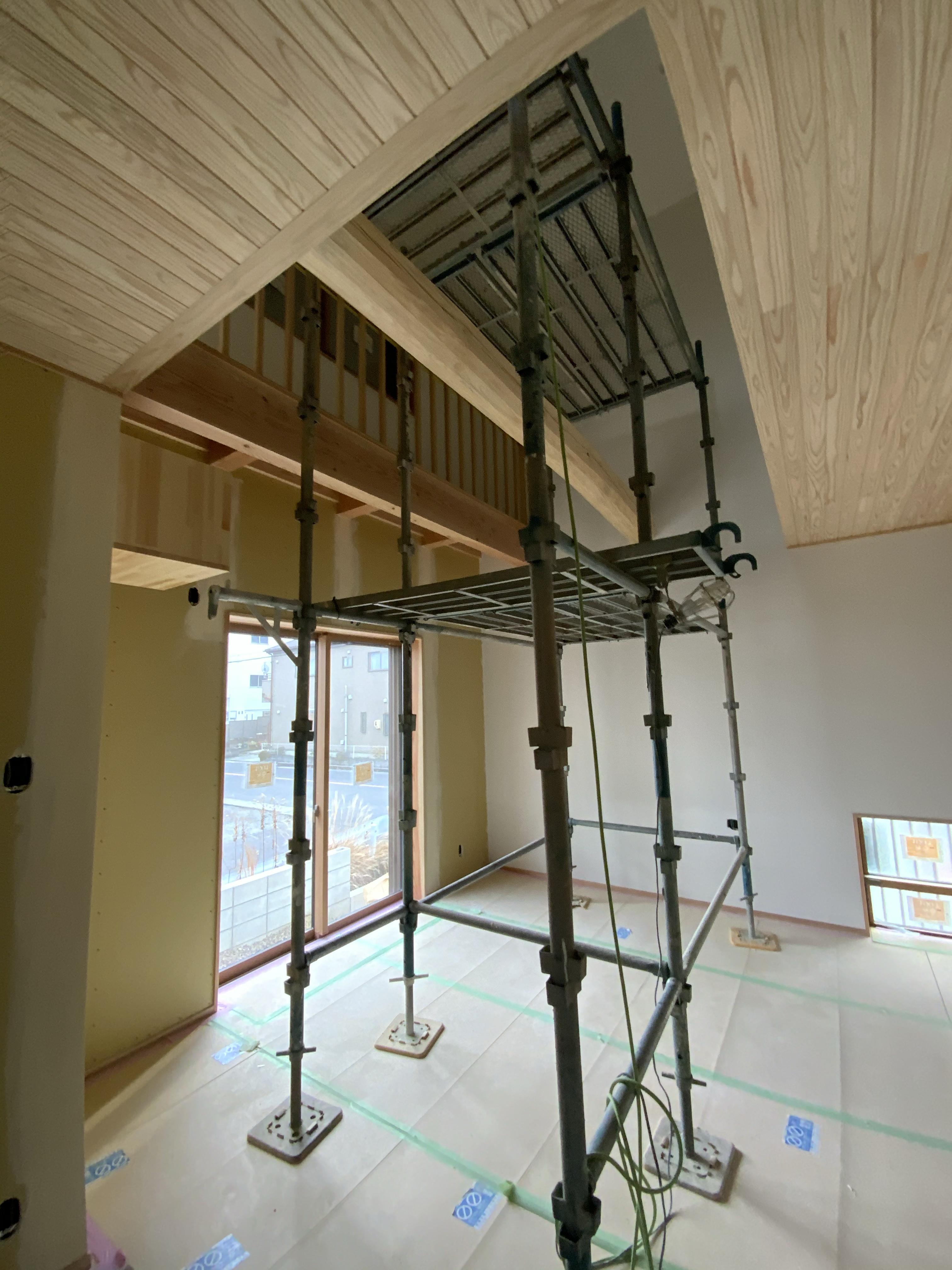 大工さんの造作工事が終わり、吹抜け部分にクロス作業用の足場が架けられました。